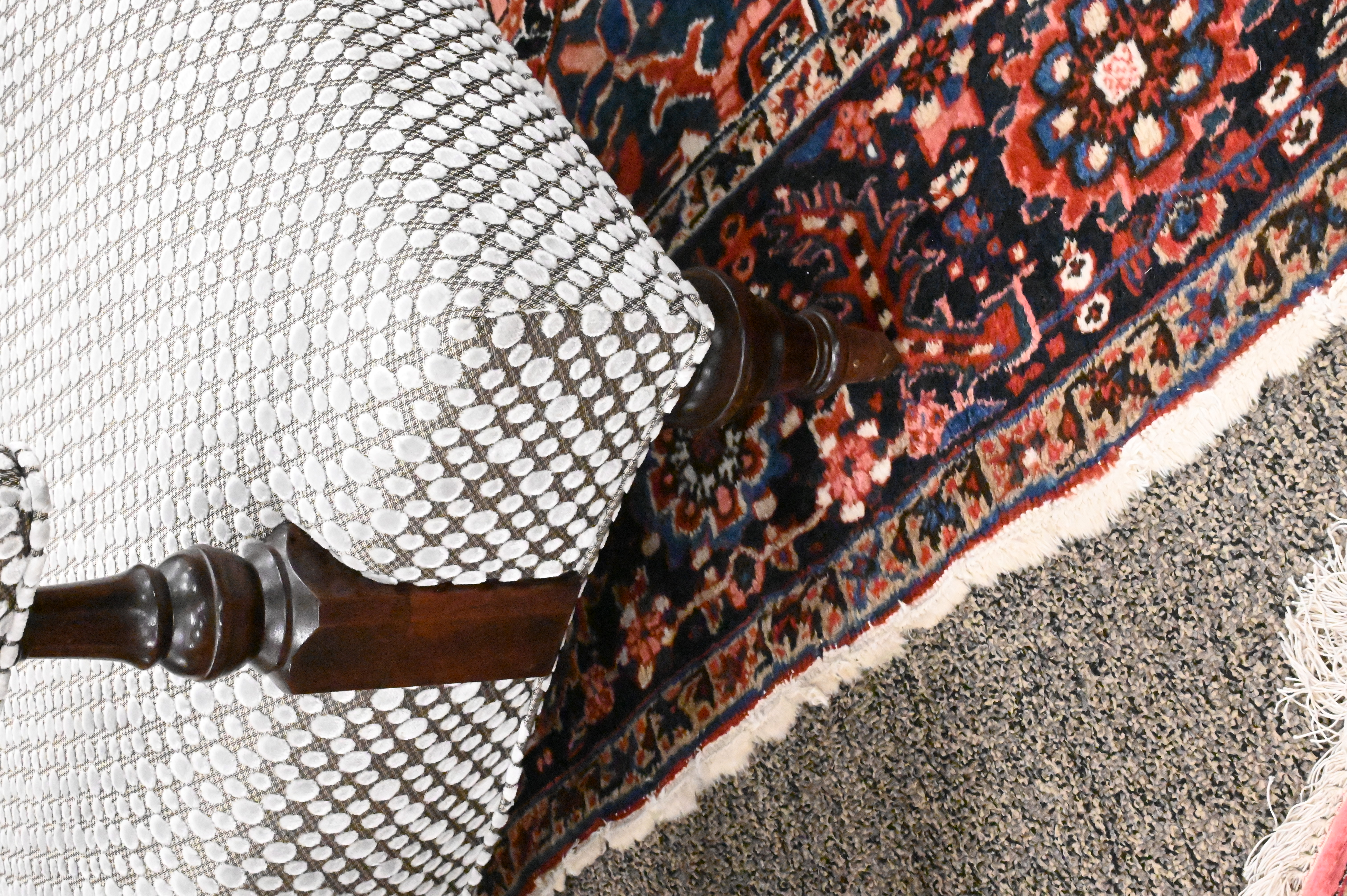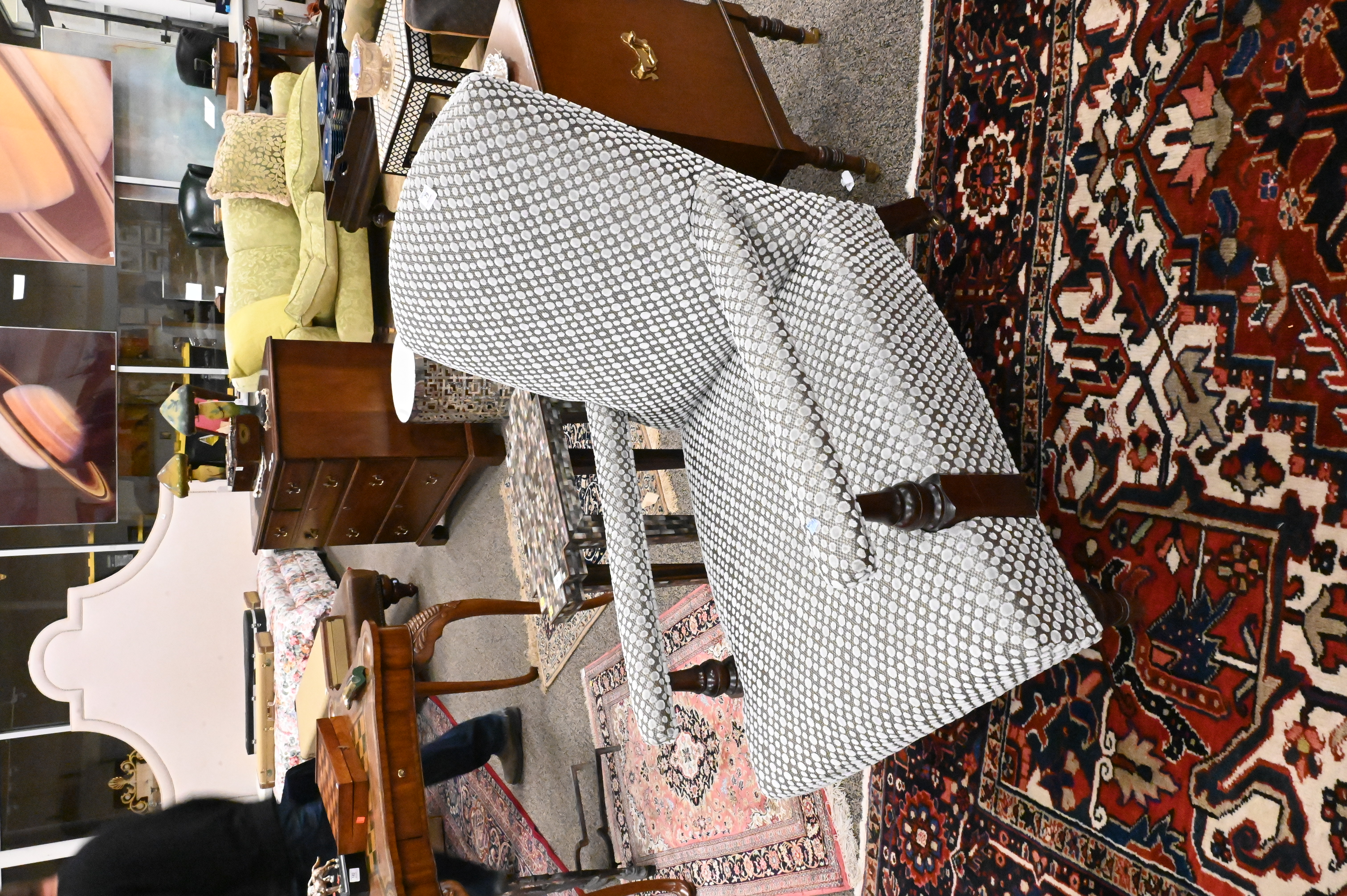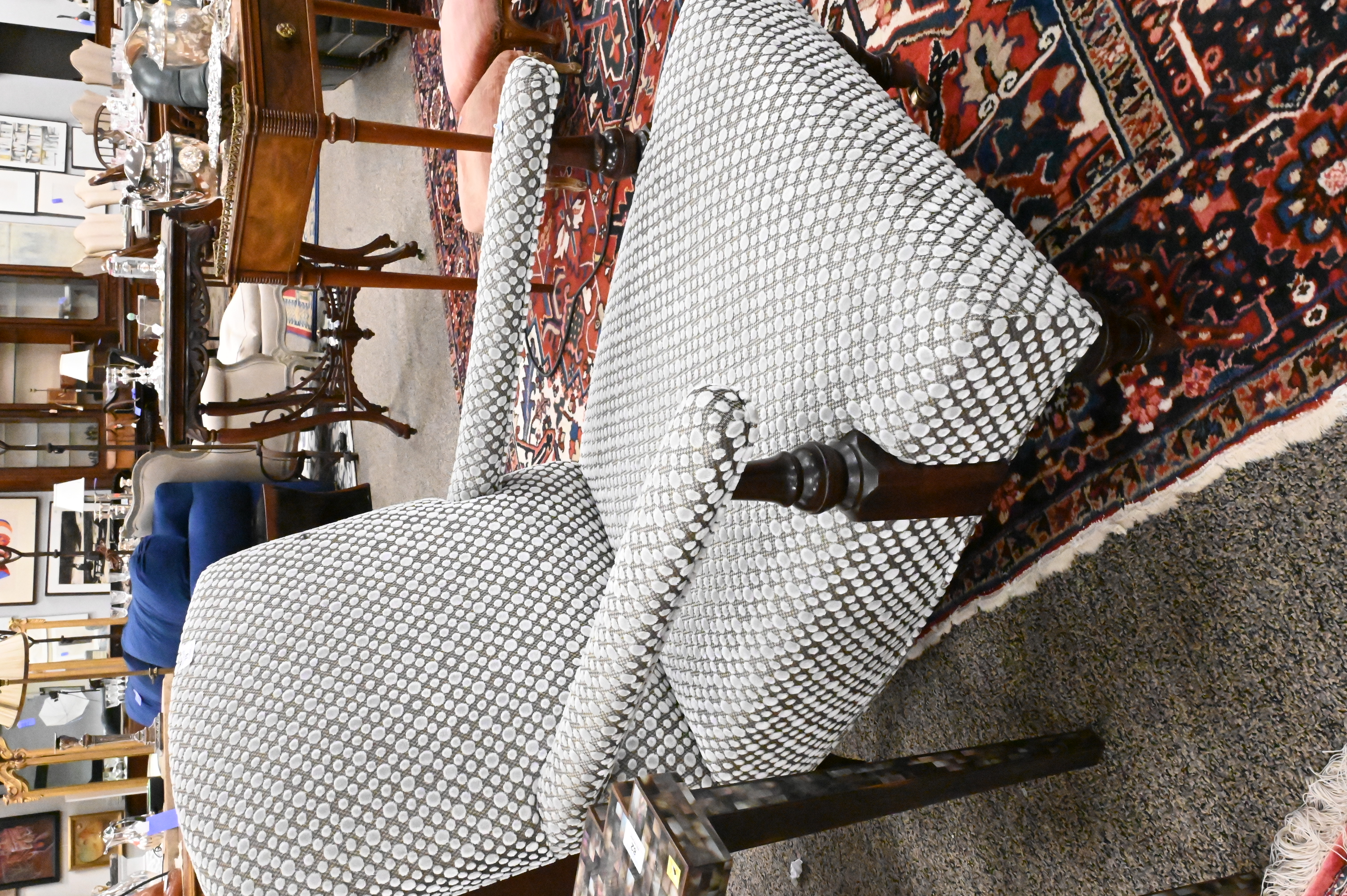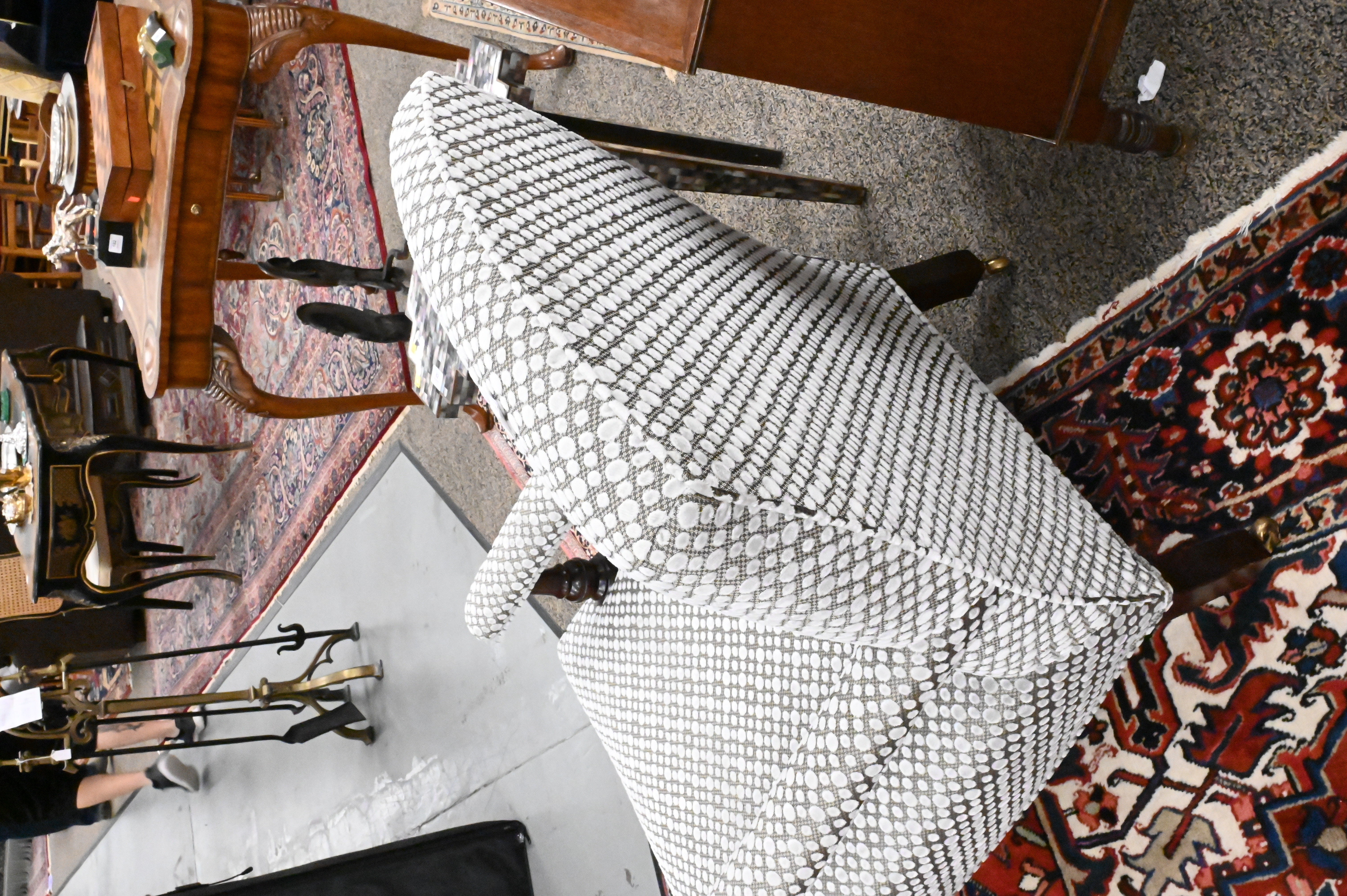 Attributed to George Smith Custom Upholstered Open Armchair, having all legs set on large brass casters, height 36 inches, width 28 inches, depth 40 inches.