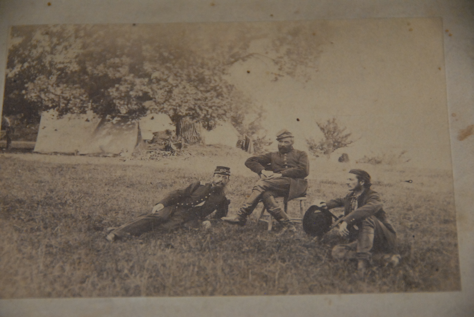 Brady photo of three soldiers in uniform near encampment headquarters of General Fitz John Porter at Westover, Westover Landing, VA 1862, found amongst Captain Charles A. Moore’s belongings. photo 3 x 4 3/8.