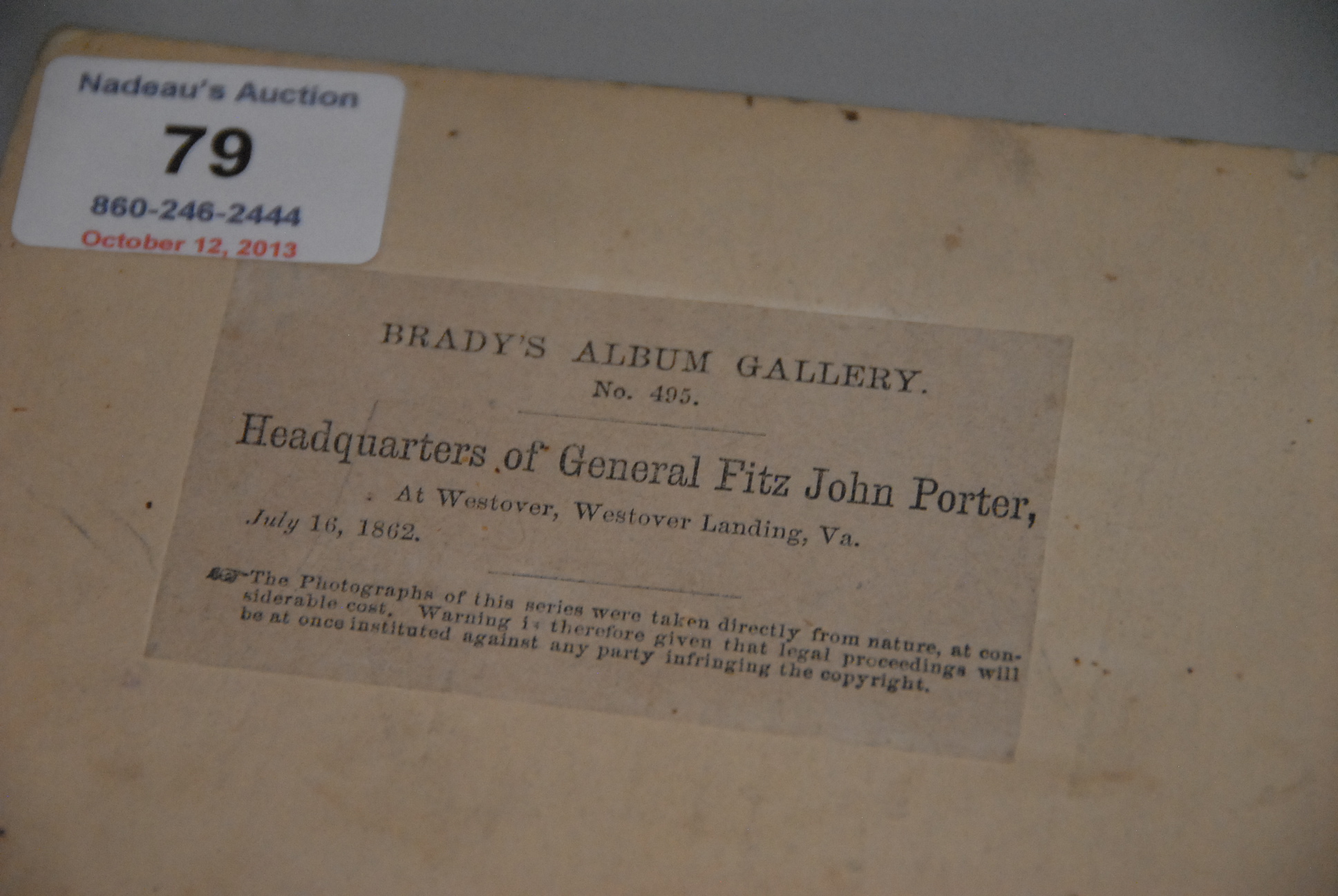 Lot 79: Brady photo of three soldiers in uniform near encampment headquarters of General Fitz John Porter at Westover, Westover Landing, VA 1862, found amongst Captain Charles A. Moore’s belongings. photo 3 x 4 3/8.