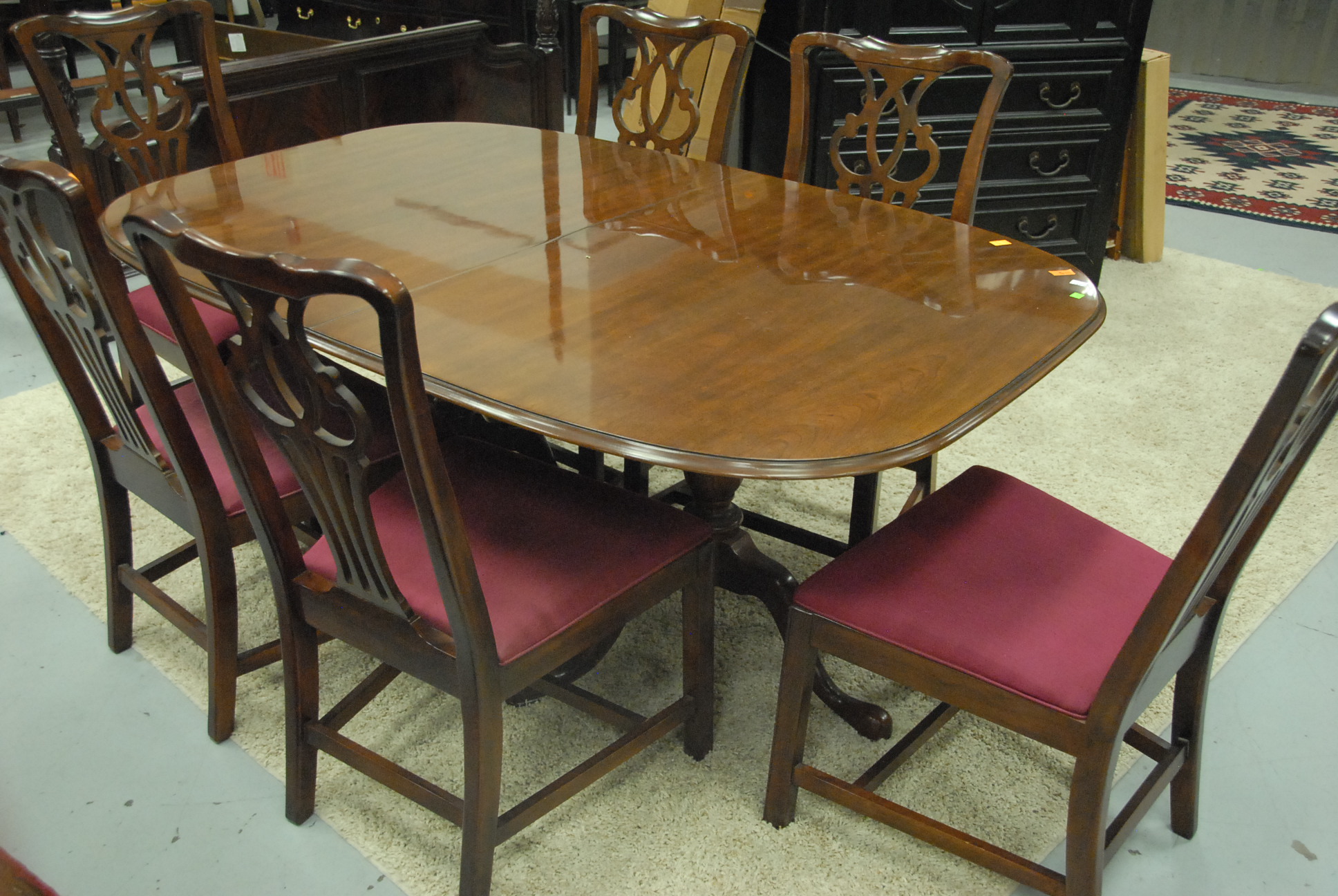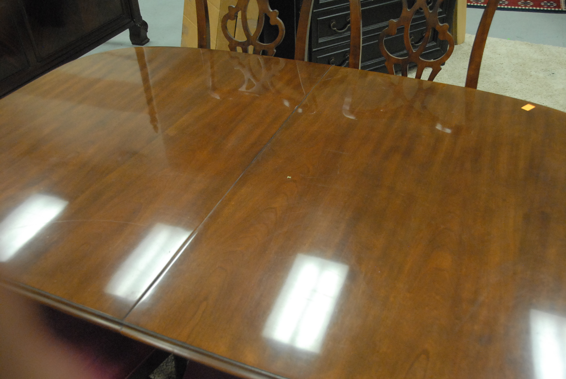 Drexel Heritage cherry dining table with two leaves and six Chippendale style chairs.