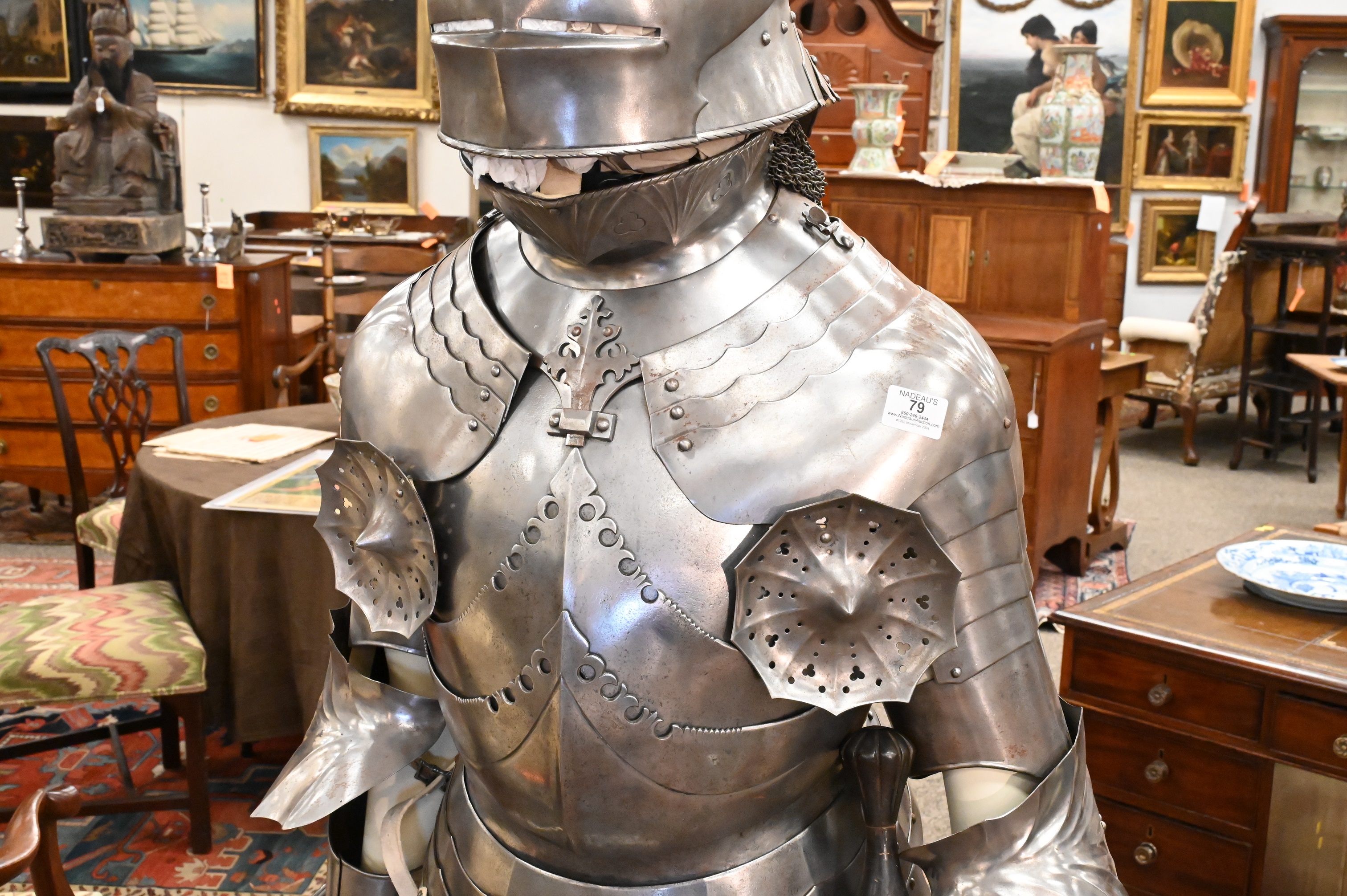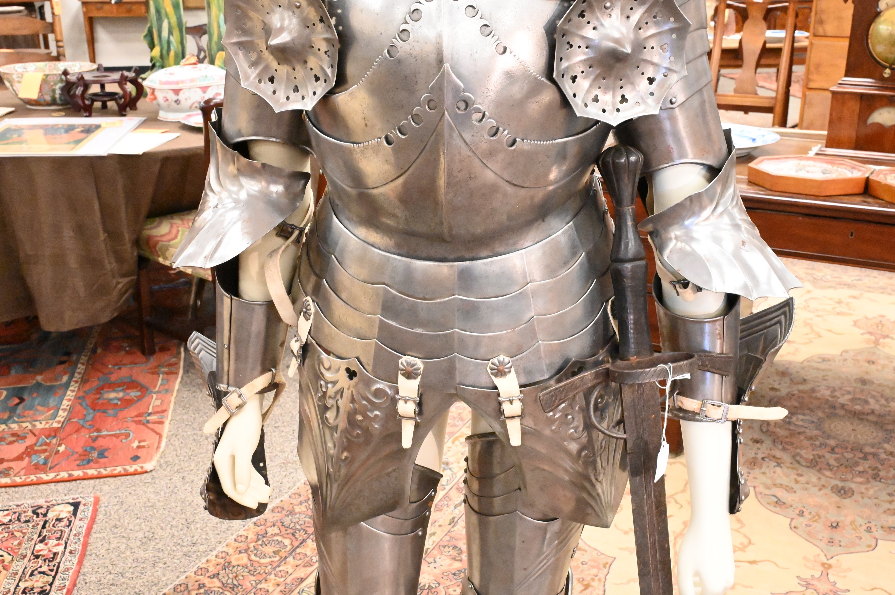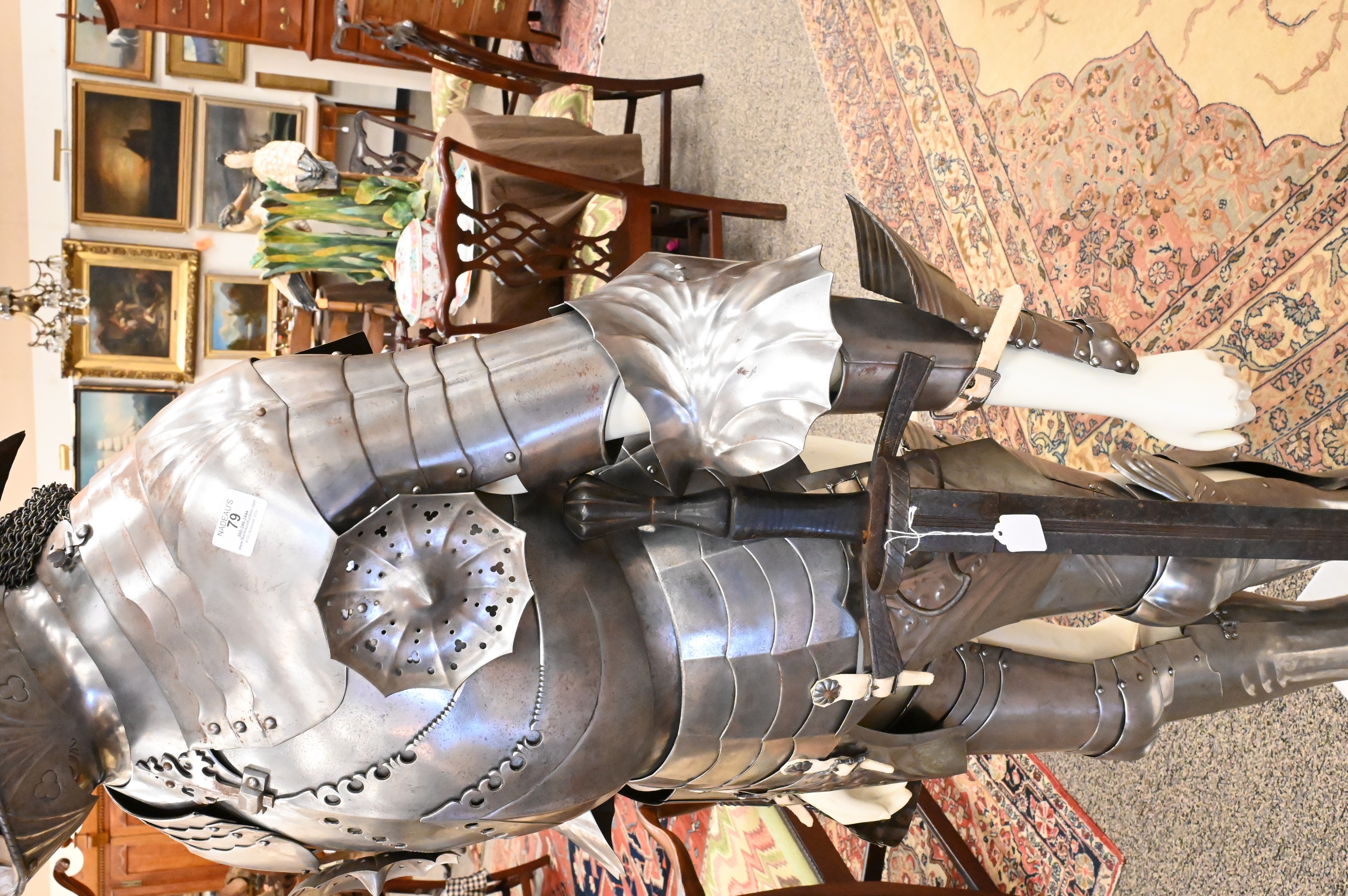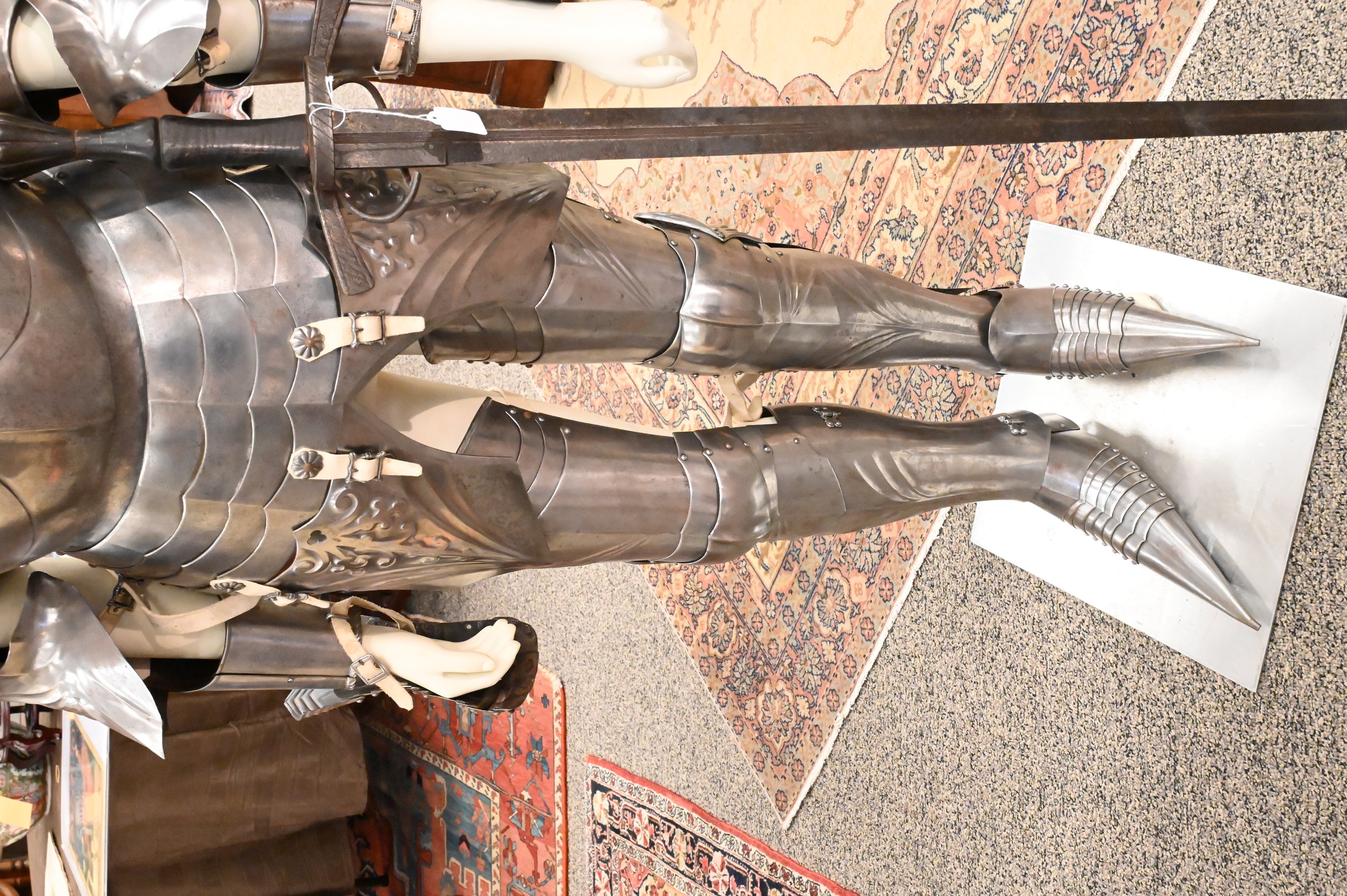include a pointed and articulating sallet helmet with visor, gorget, breastplate, with pointed roundels, greaves, gauntlet gloves, long pointed stations (for equestrian calvary purposes) some chain mail along with an iron sword, handmade with hammered rivets, extensively restored not unlike the armor worn by Emperor Maximilian I (German 1459 – 1519)