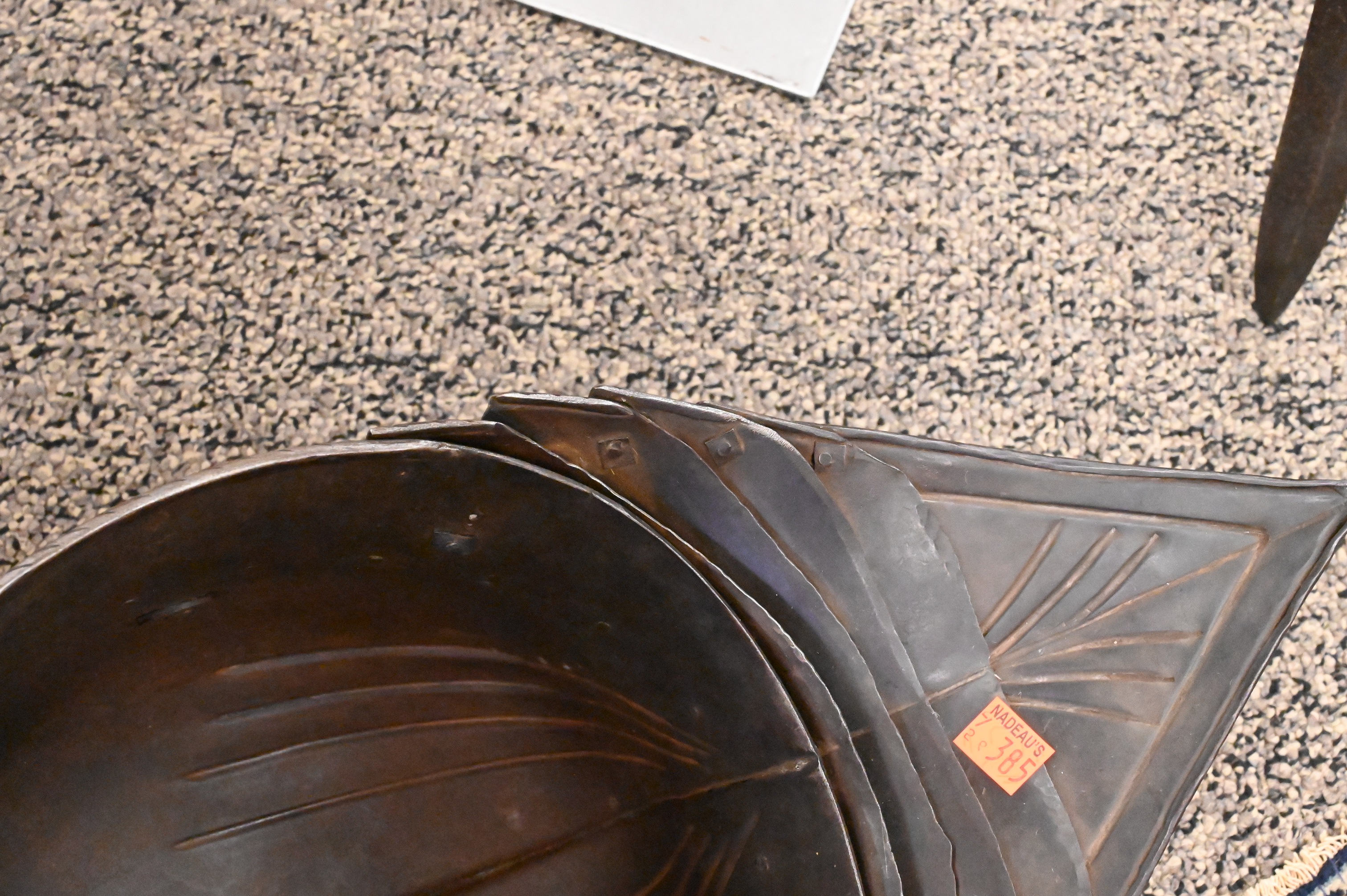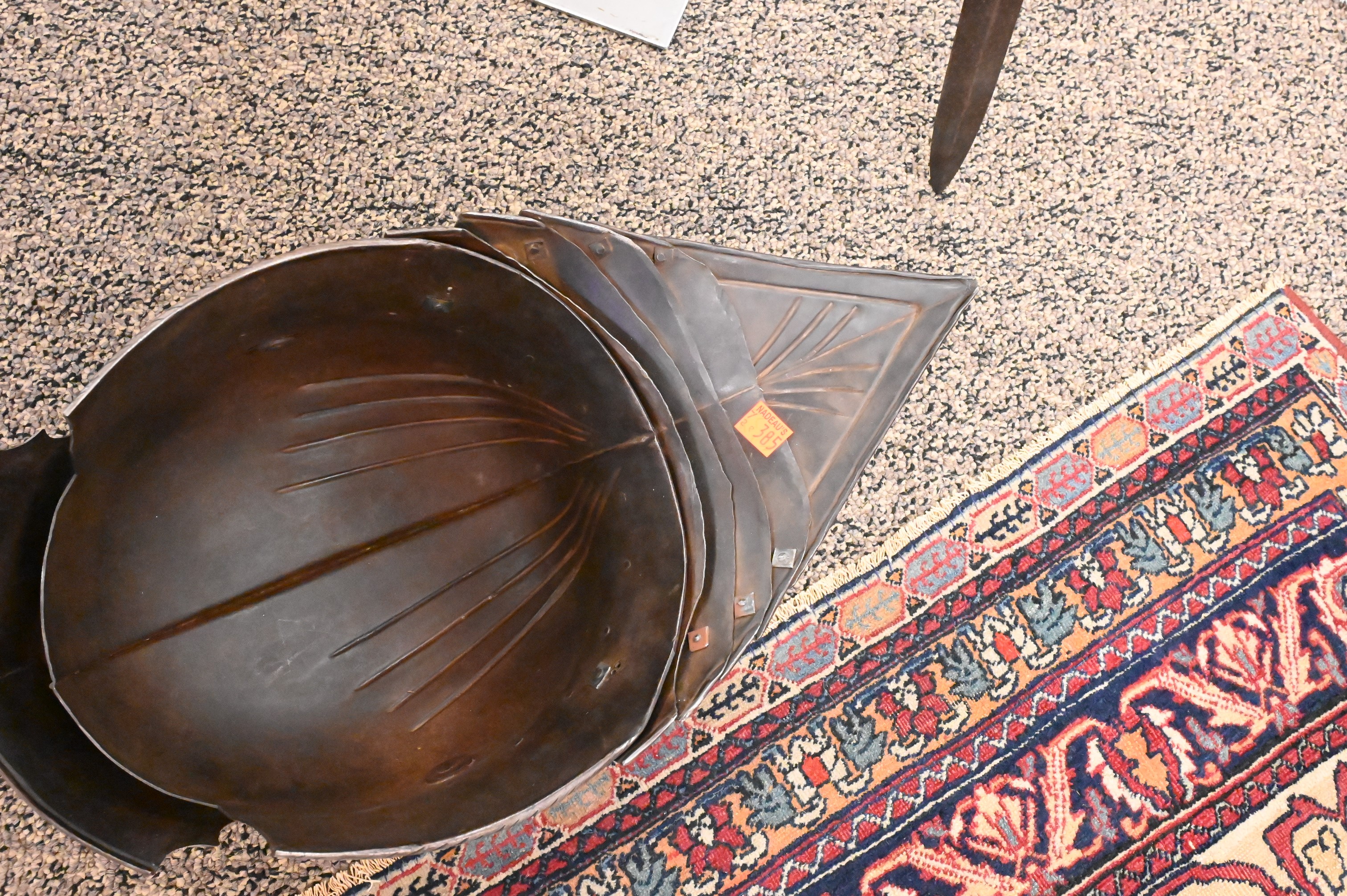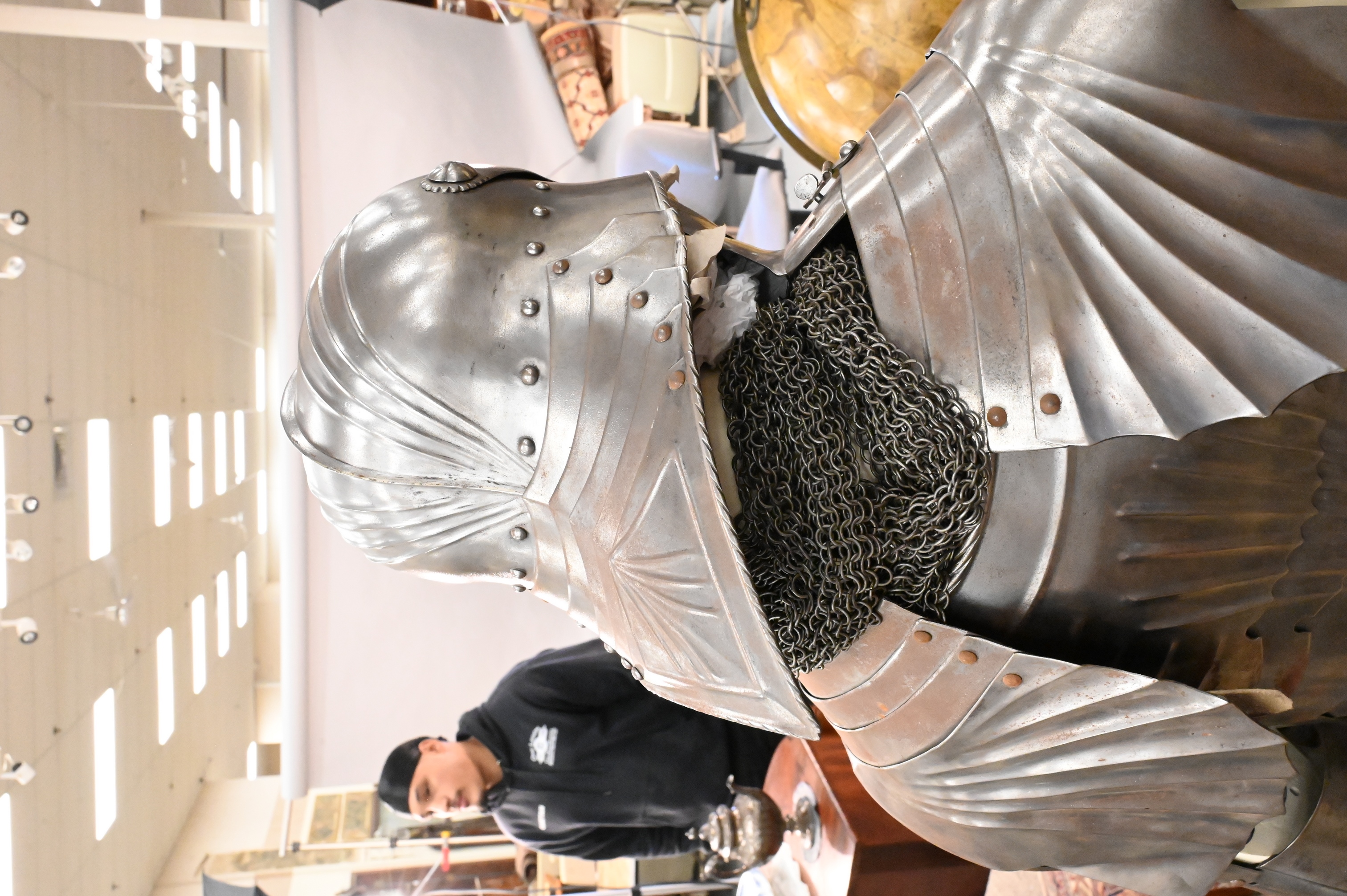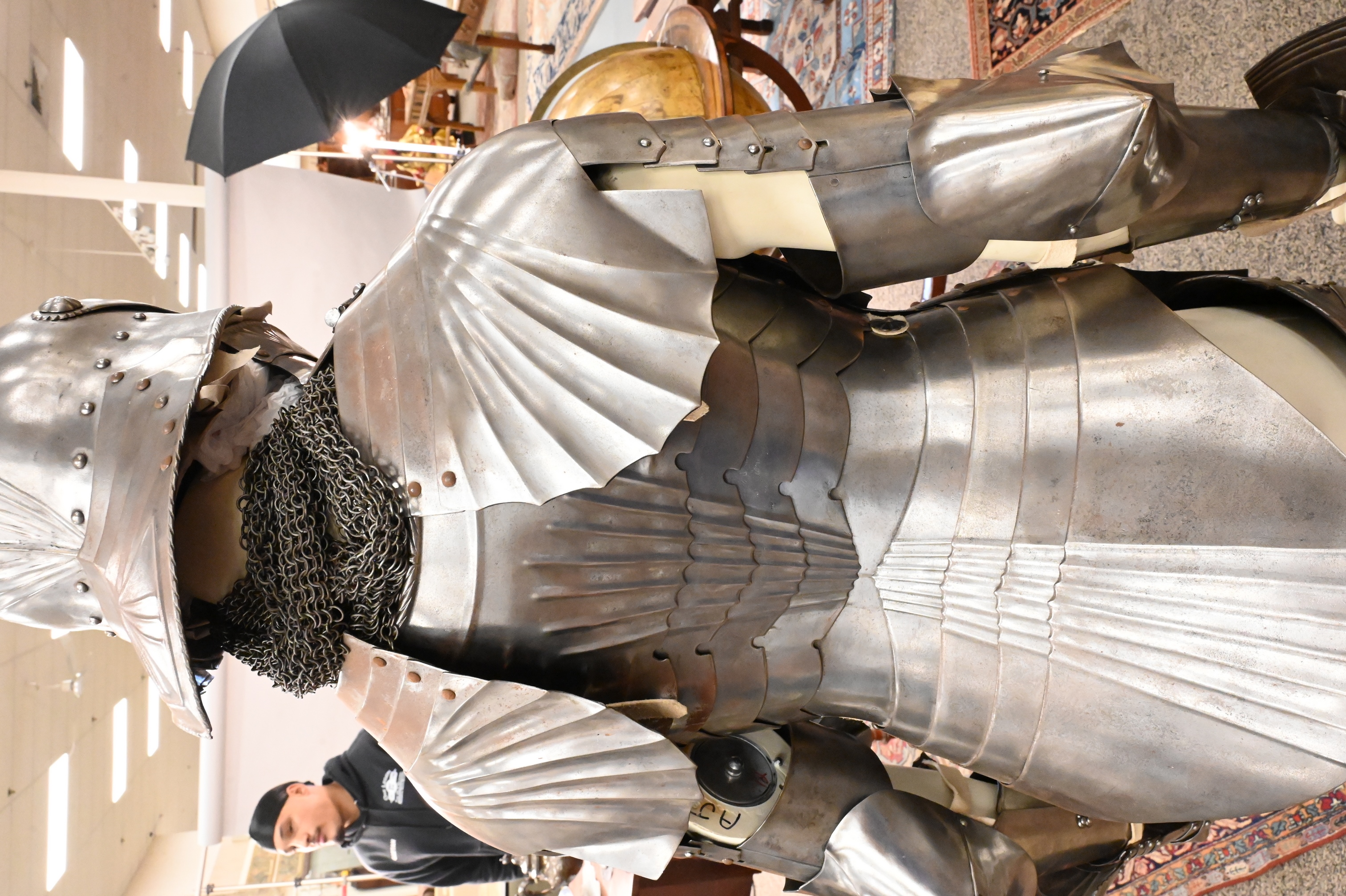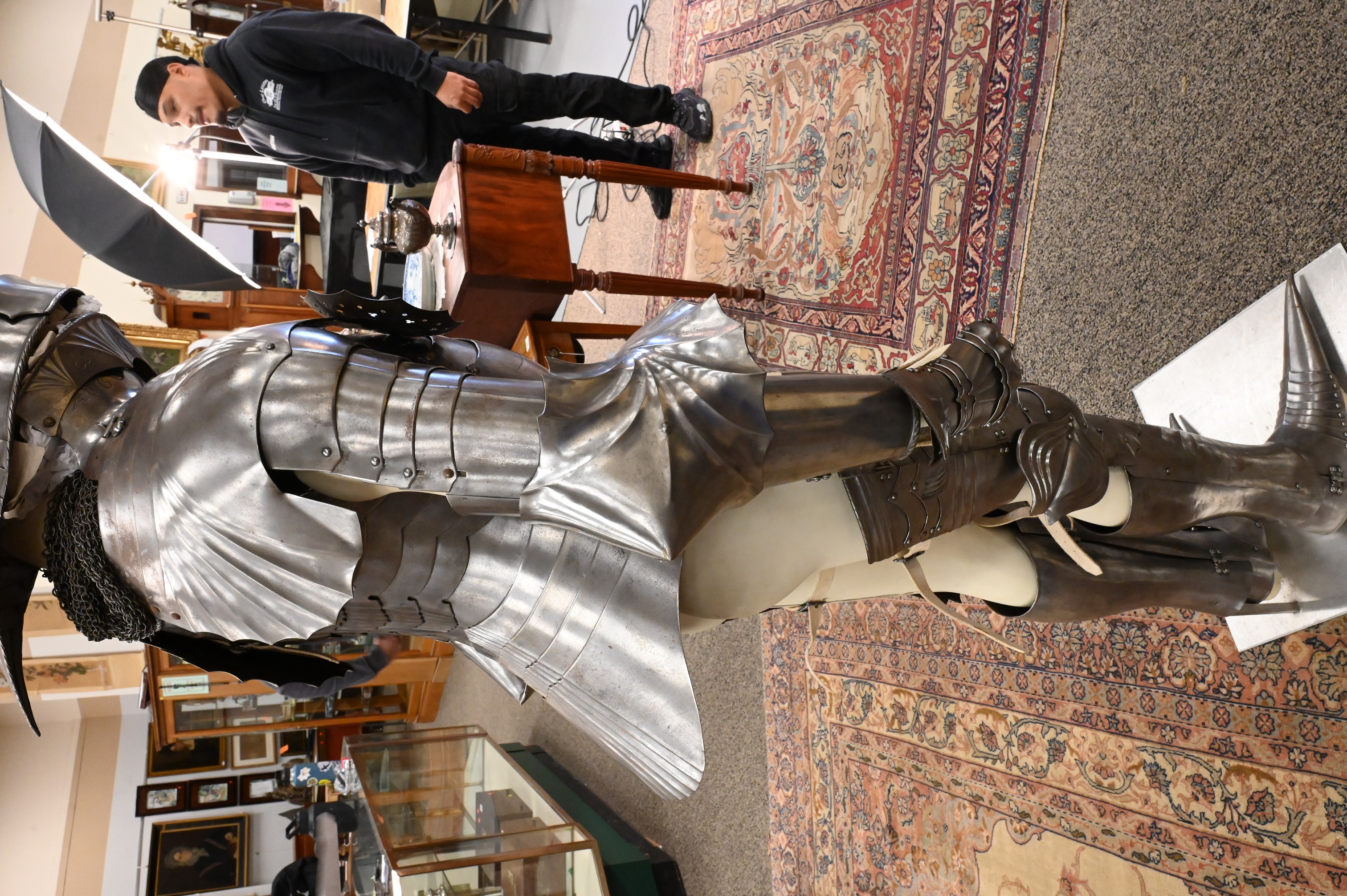 include a pointed and articulating sallet helmet with visor, gorget, breastplate, with pointed roundels, greaves, gauntlet gloves, long pointed stations (for equestrian calvary purposes) some chain mail along with an iron sword, handmade with hammered rivets, extensively restored not unlike the armor worn by Emperor Maximilian I (German 1459 – 1519)