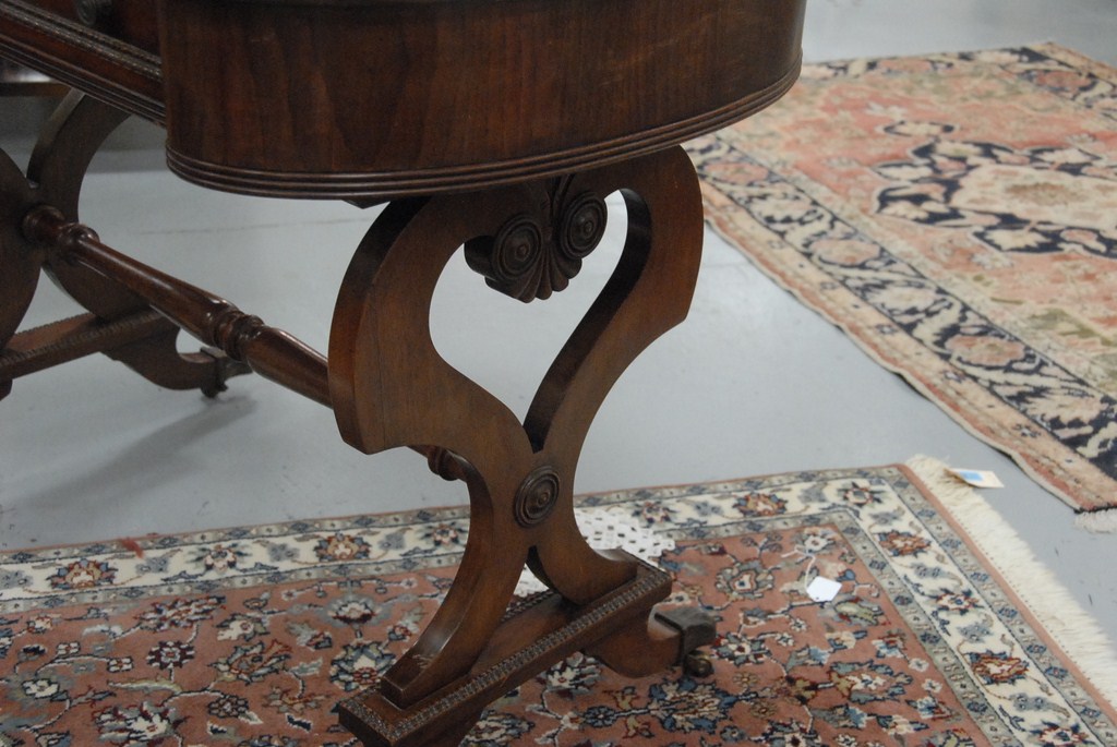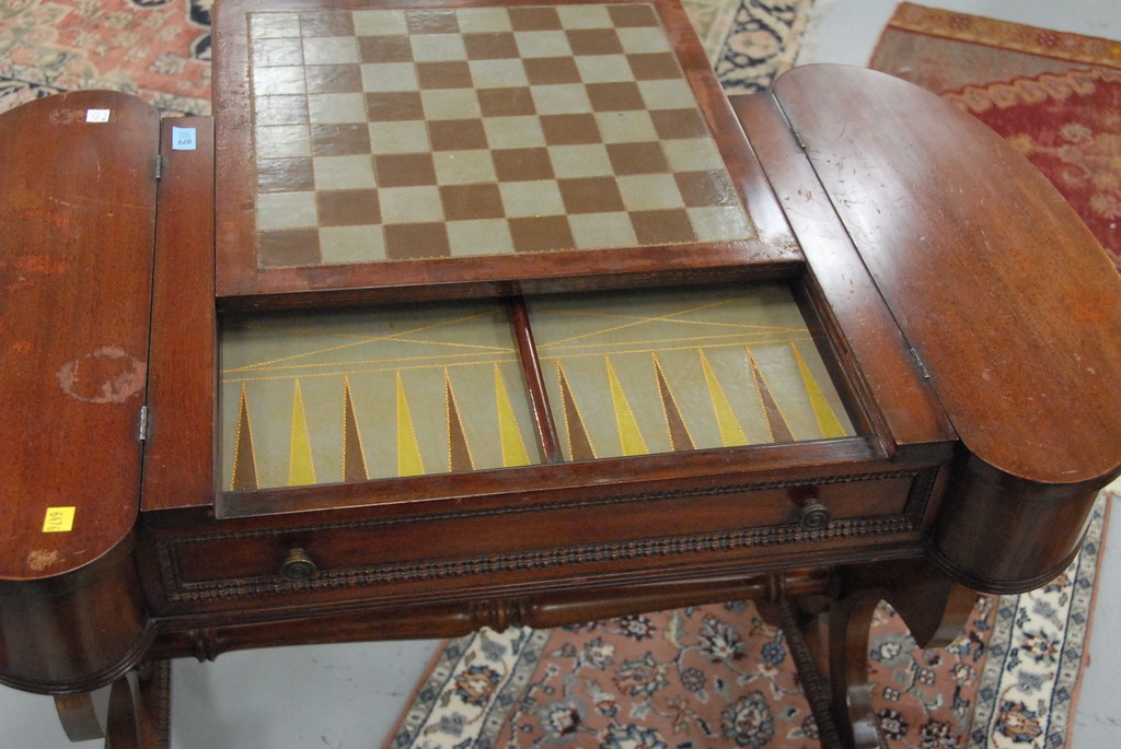 Lot 79: Gaming table with oval ends with mahogany top that can be flipped to have leather chess board and slide out to reveal leather backga…