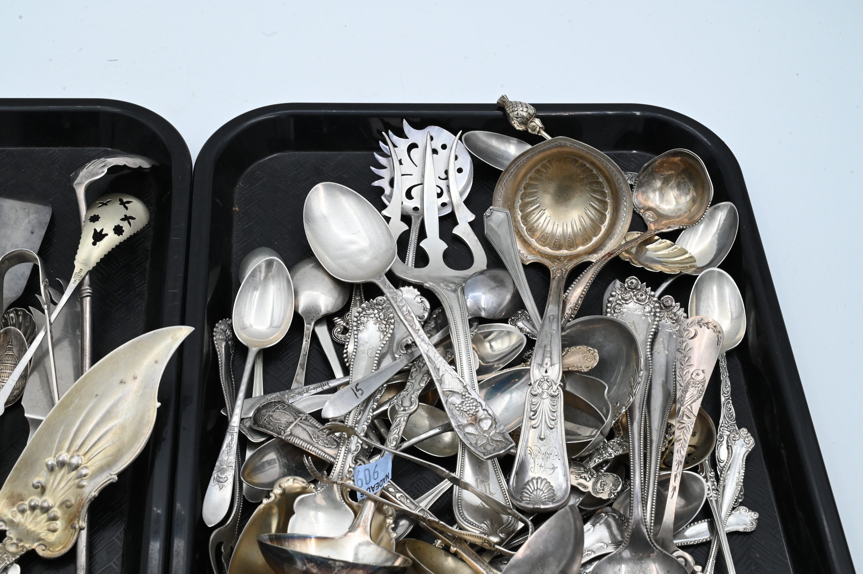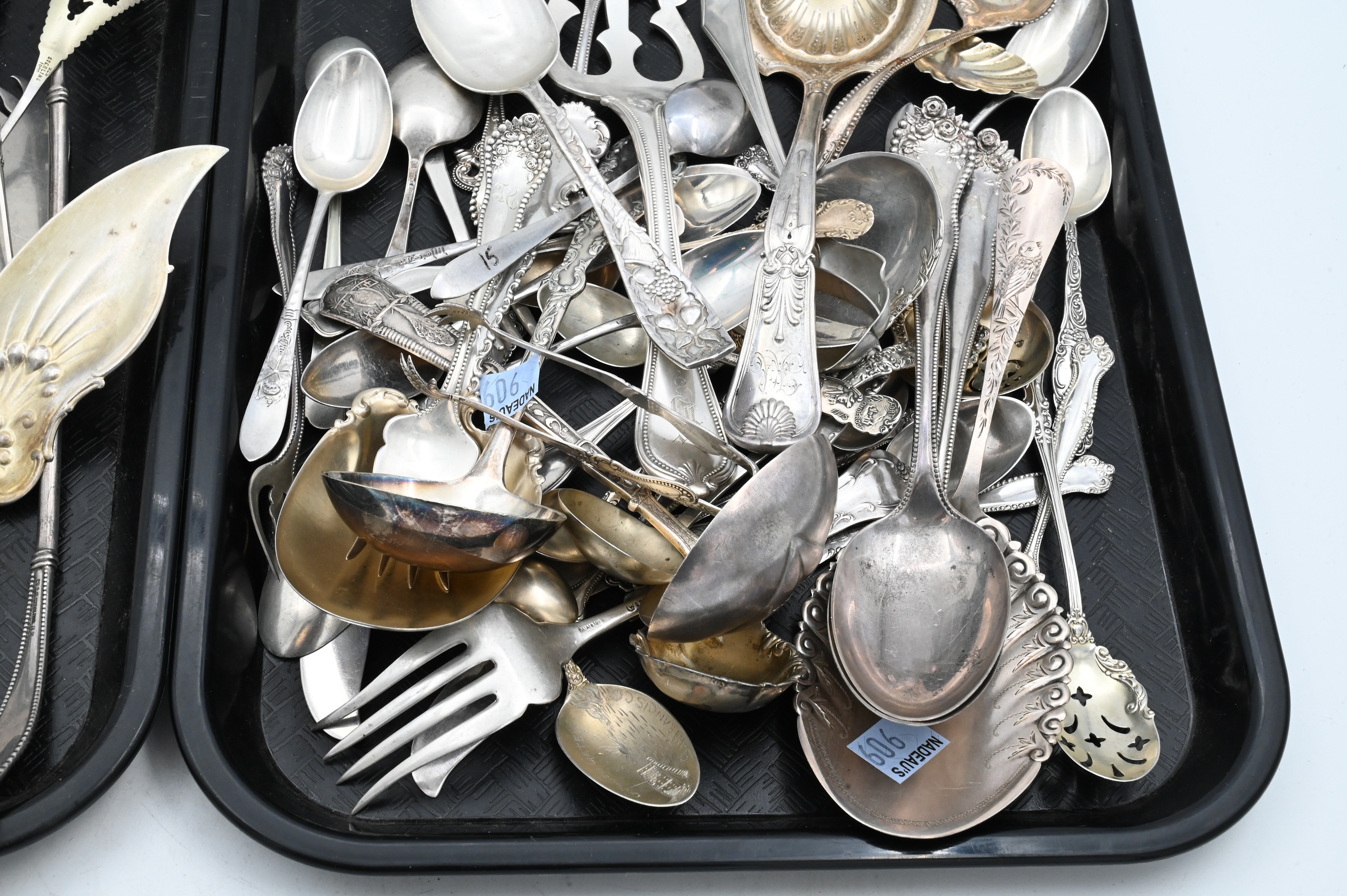 to include forks, spoons, ladles, and knives, along with four French weighted silver implements with solid silver blades