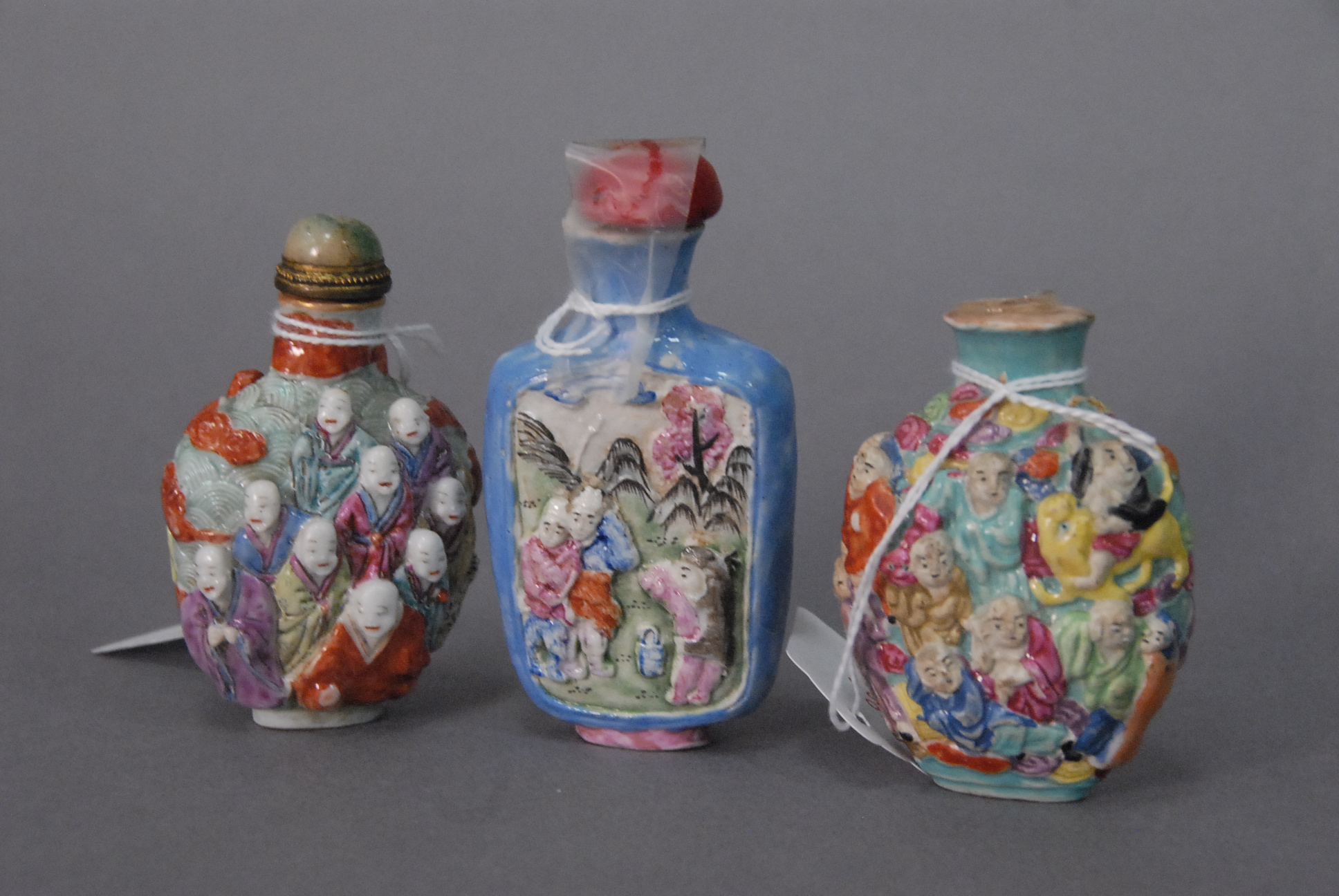 Lot 79: Group of three porcelain molded snuff bottles two hand seal mark on bottom, ht. 2 3/4 to 3 1/2.