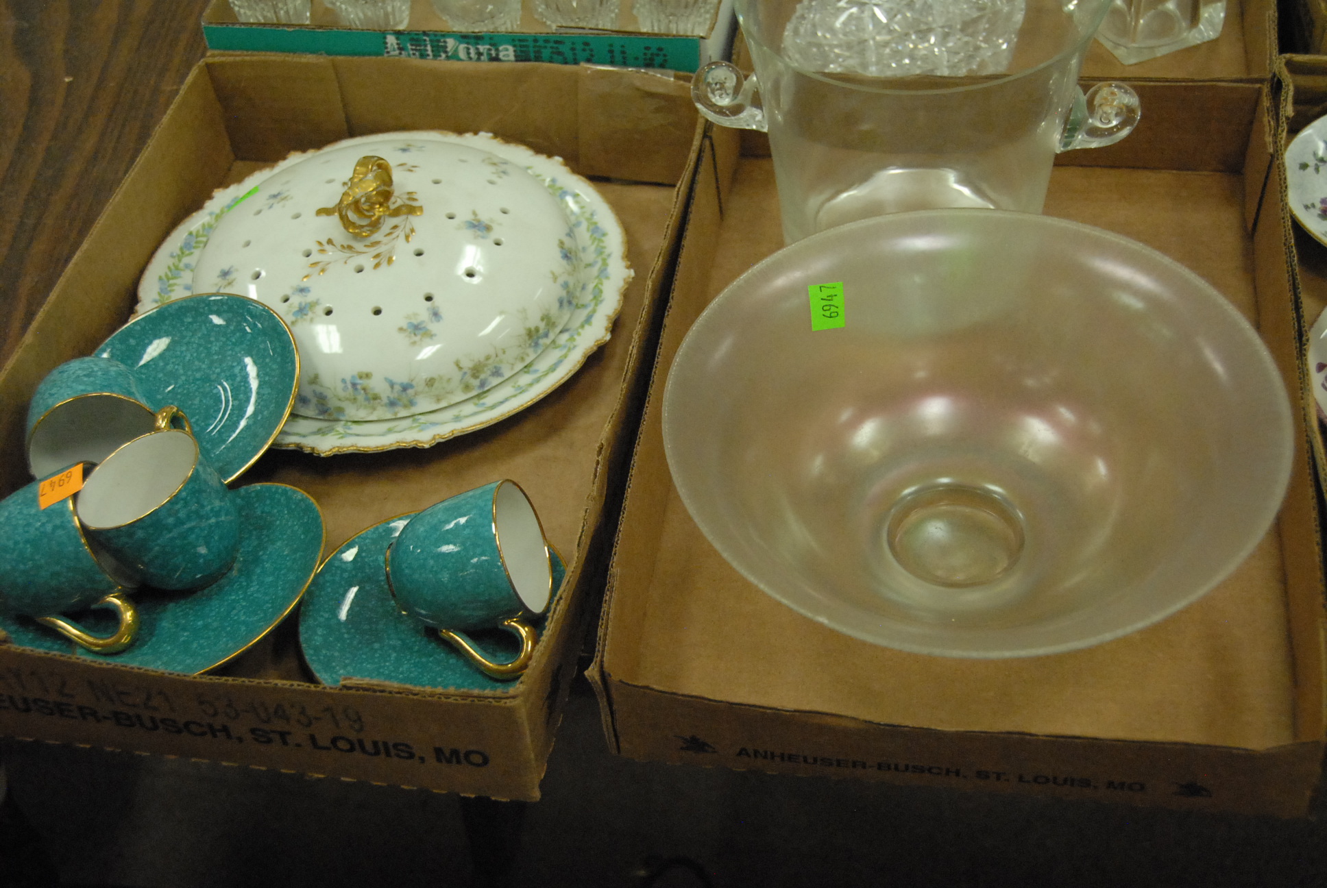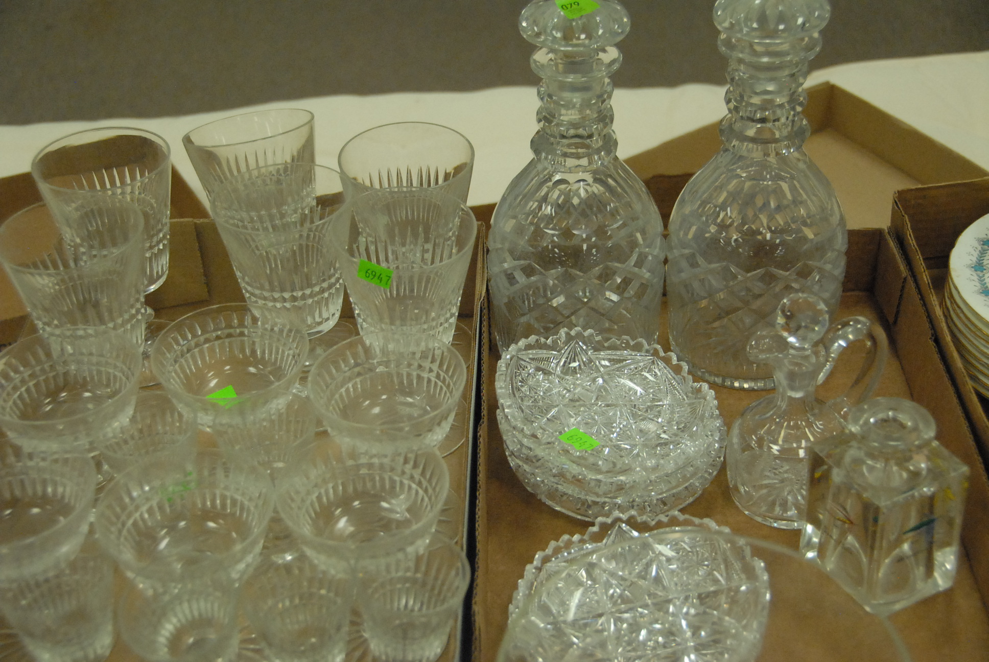 Lot of cut crystal to include two decanters with stoppers, five cut crystal dishes, cruet and crystal container with painted flies plus three box lots to include wine cooler and crystal stems.