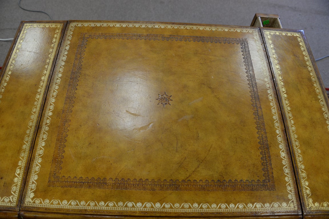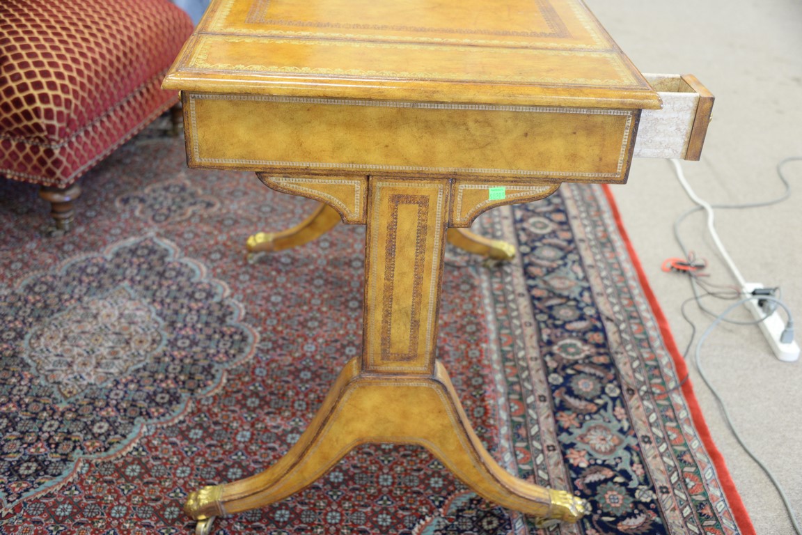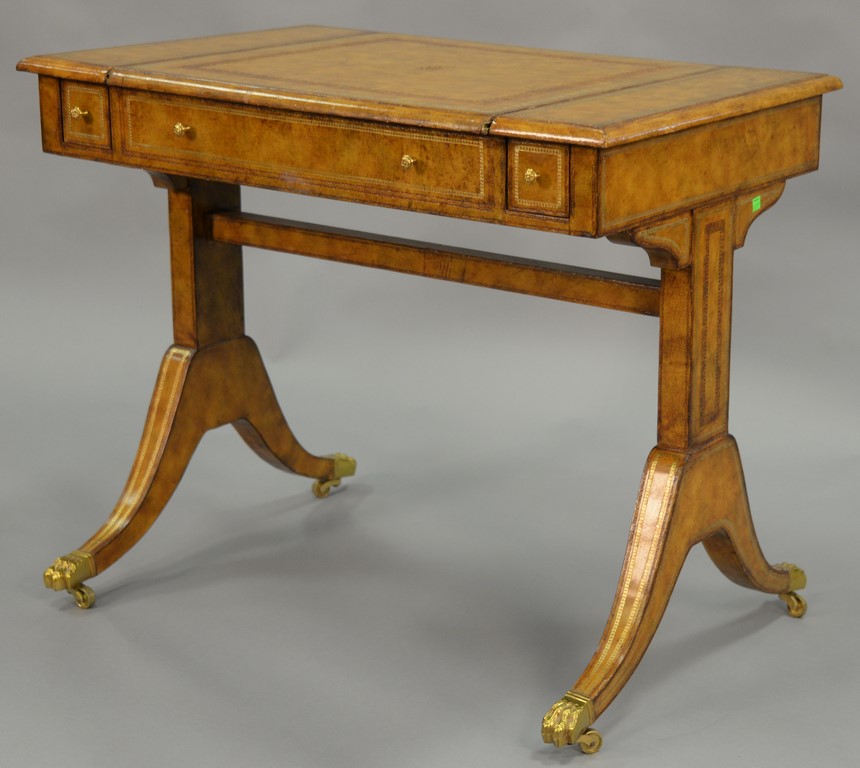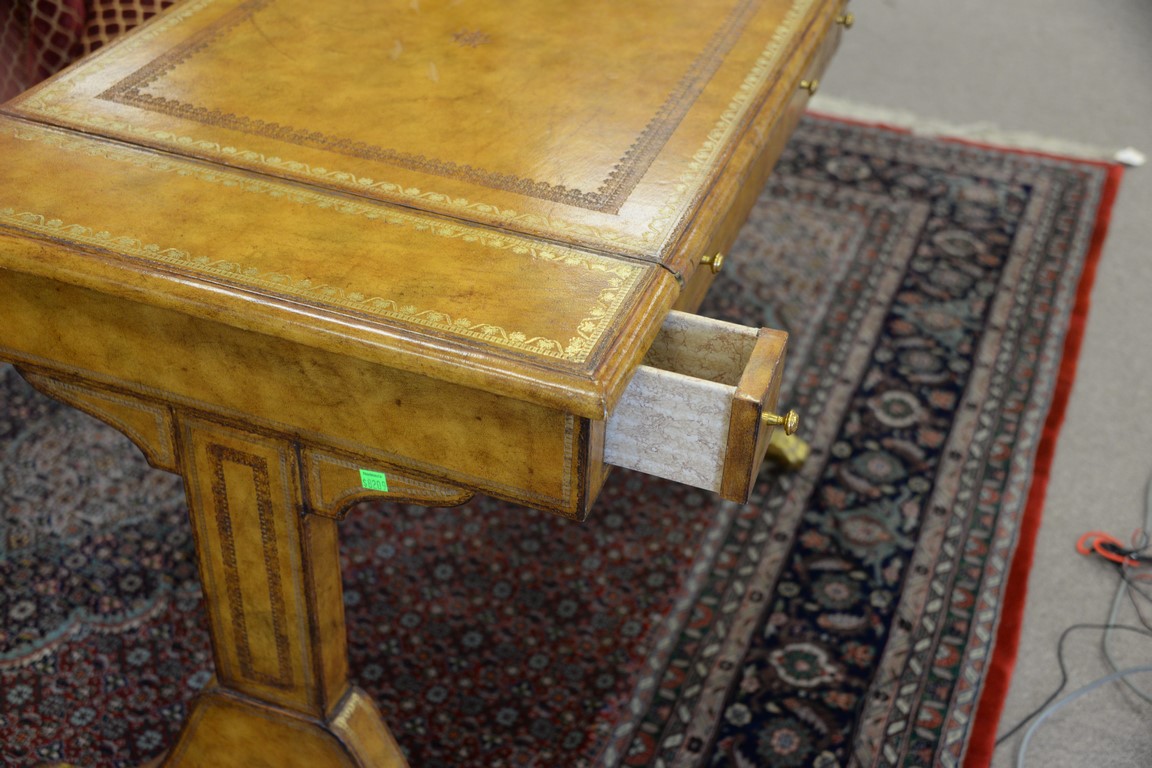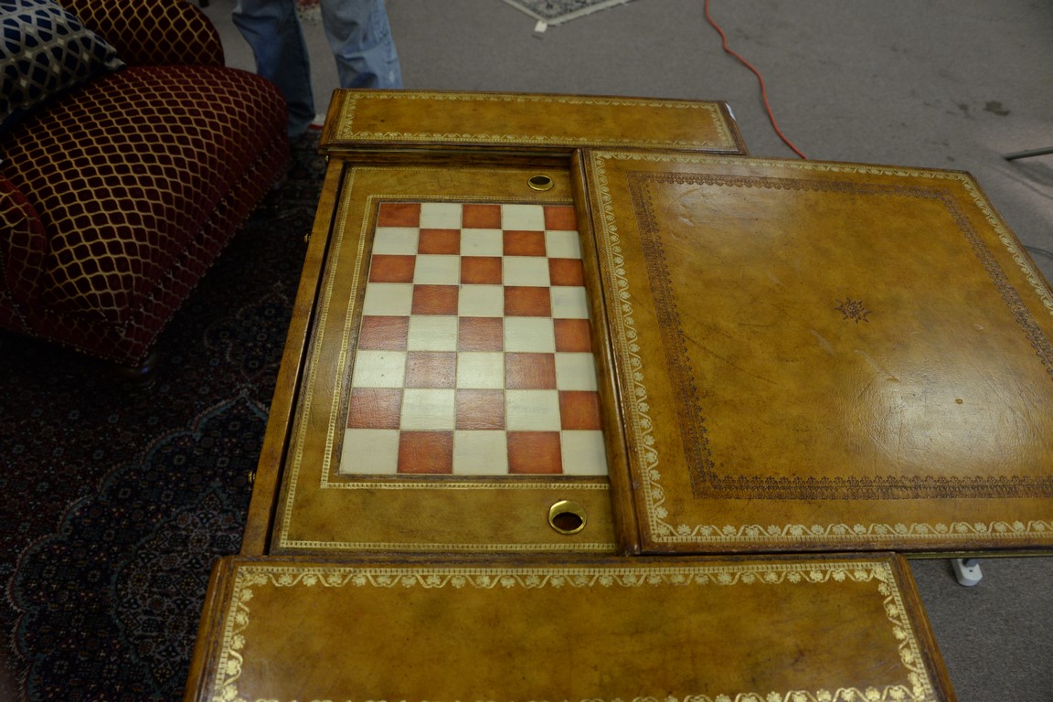 Lot 79: Maitland Smith games table with leather surfaces and backgammon and chess boards and four small drawers. ht. 29 1/2in., top: 23 x 36