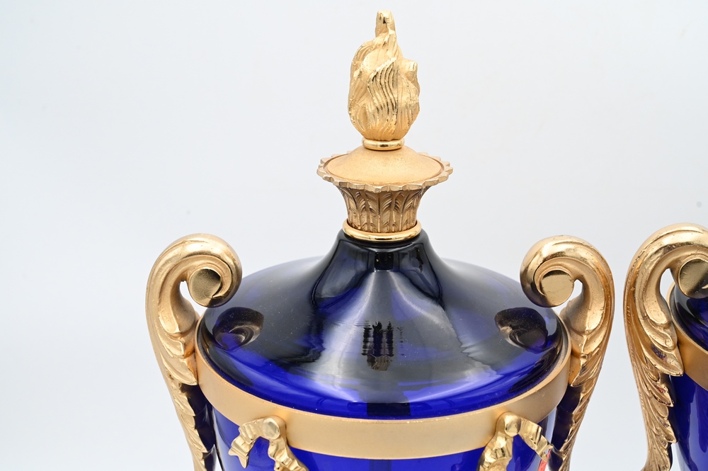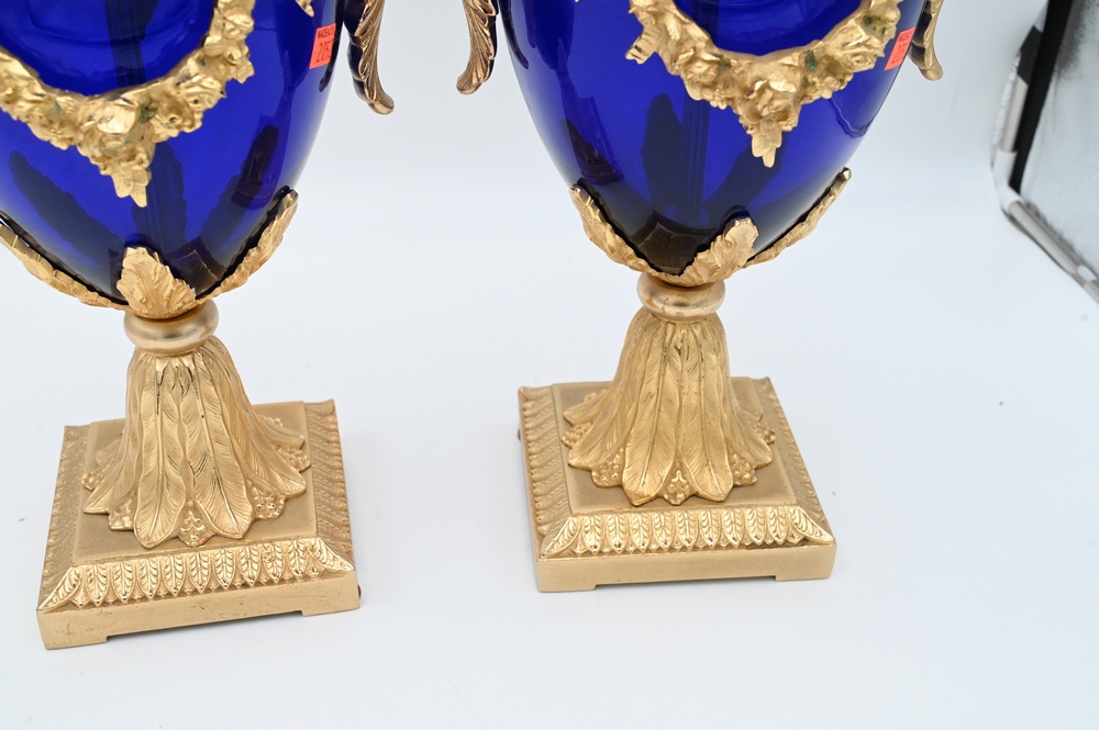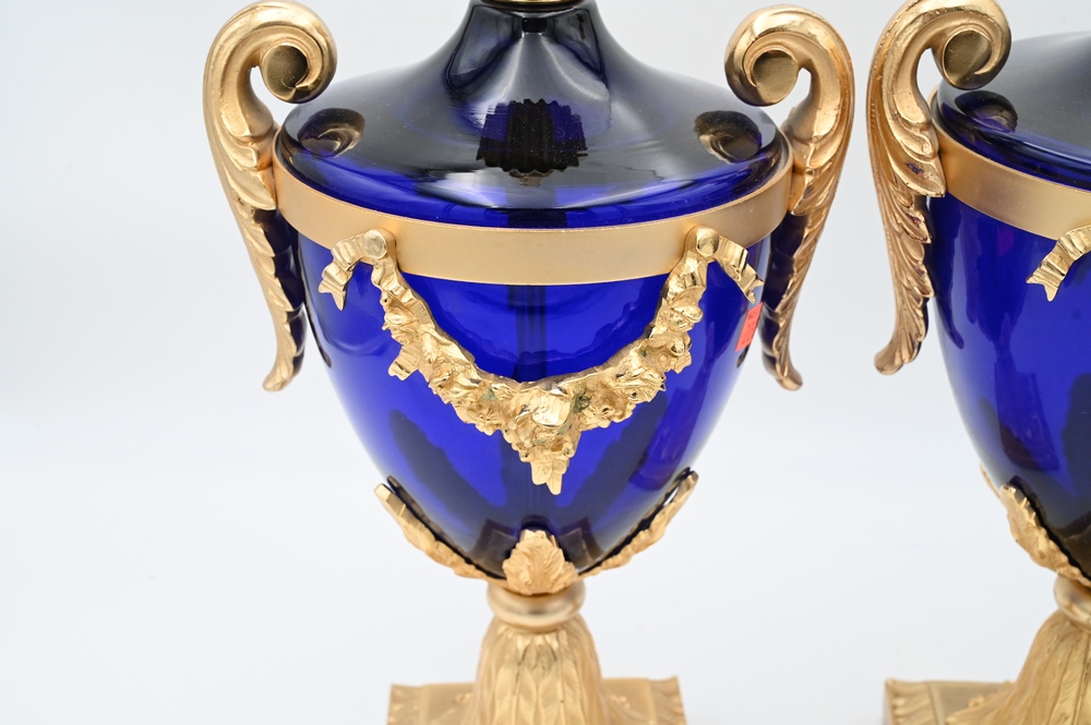 Pair of French Style Urns, cobalt blue glass with ormolu mounts, flame torch finial on acanthus square foot, height 20 1/4 inches.