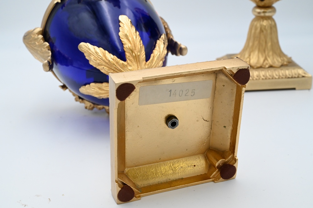 Lot 79: Pair of French Style Urns, cobalt blue glass with ormolu mounts, flame torch finial on acanthus square foot, height 20 1/4 inches.