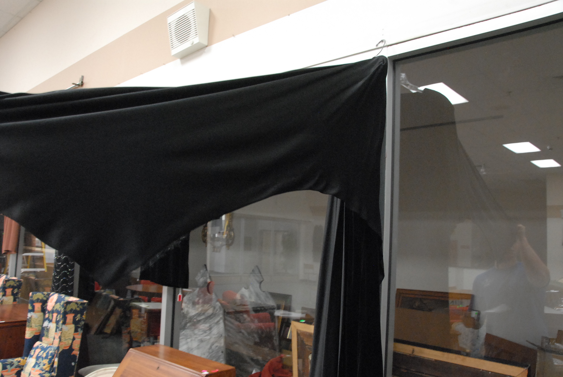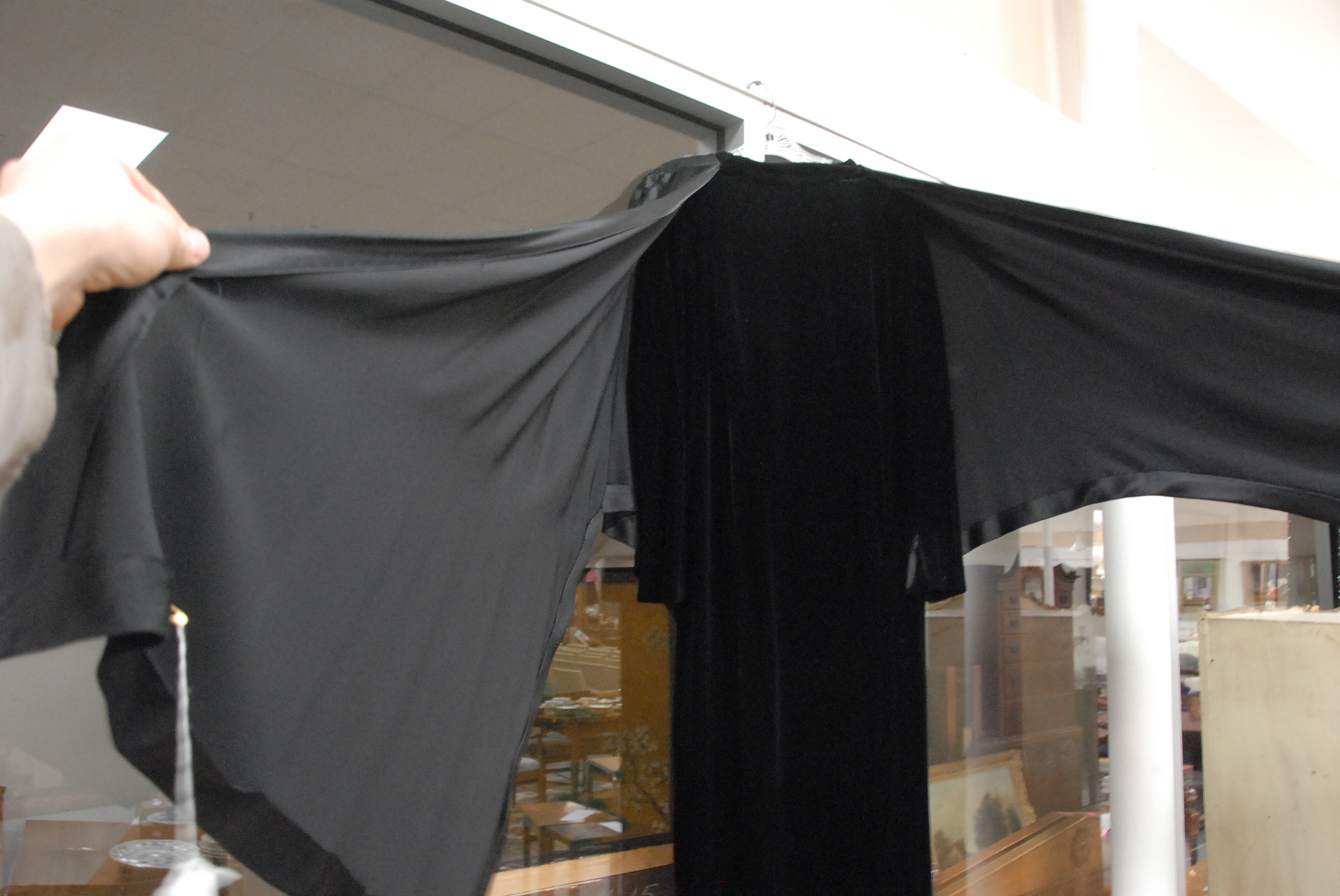 Lot 79: Pierre Balmain, full length black velvet evening gown with three quarter sleeves with attached black silk shawl.