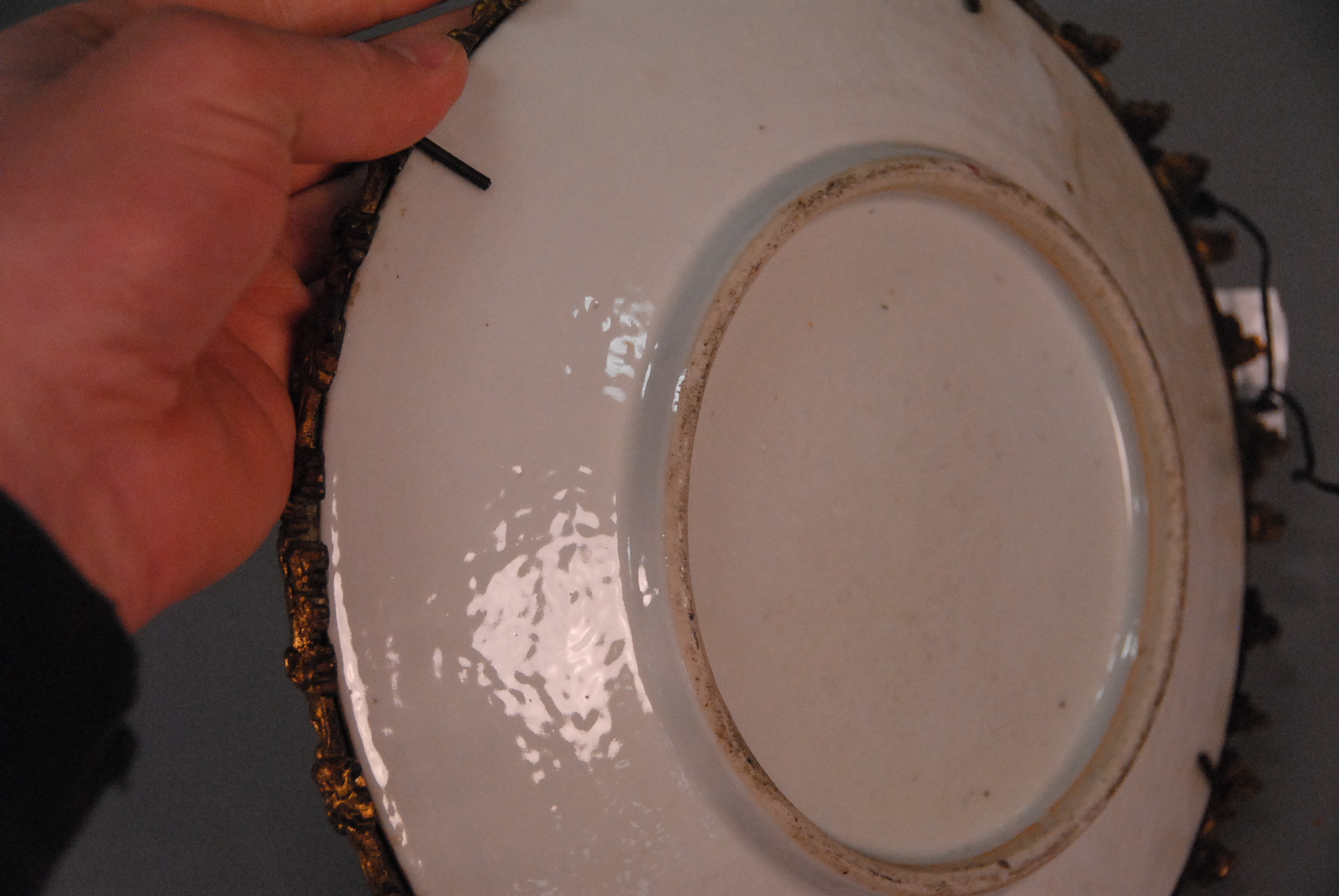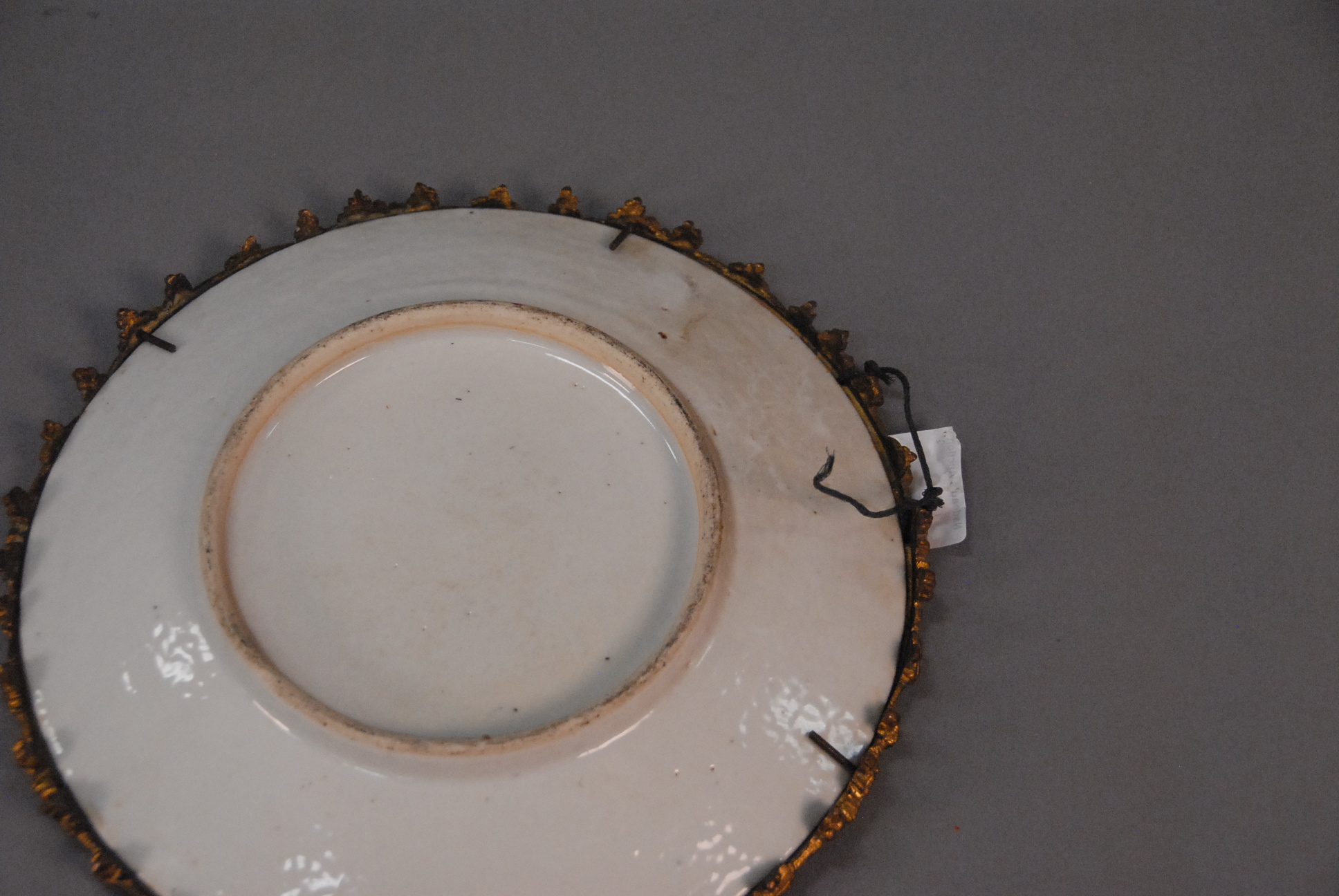Rose Famille plate mounted with bronze rim, late 19th century. dia. 10 1/2in.
