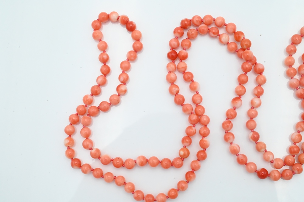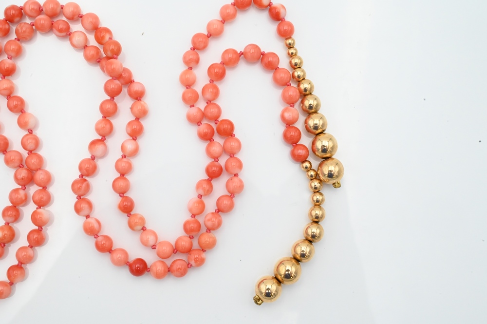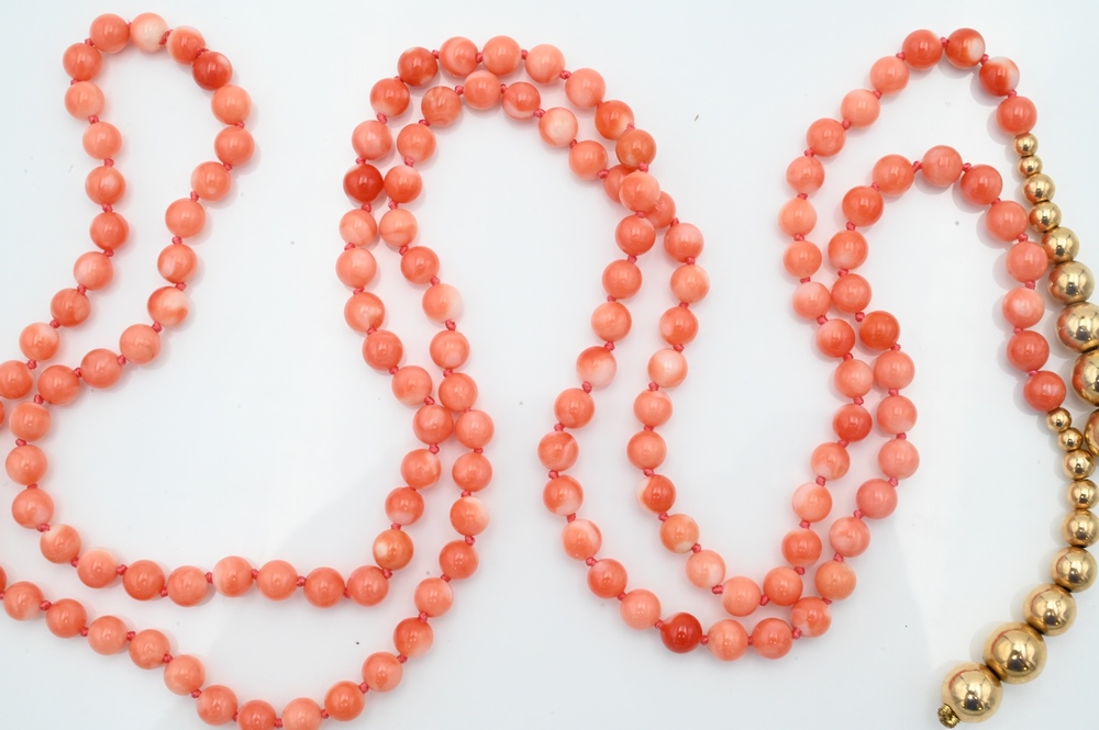 Lot 79: Round Pink Coral Beaded Necklace, having 14 karat gold bead ends, approximately 6 millimeters each, length 44 inches.