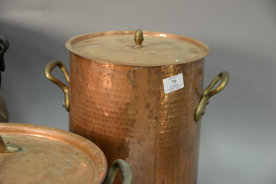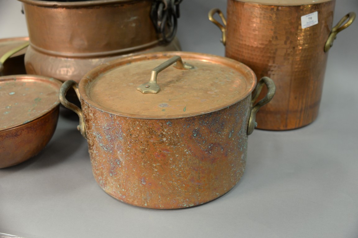 Lot 79: Seven copper pots to include three hand hammered pots with heavy brass handles. largest: ht. 12in., dia. 16in.