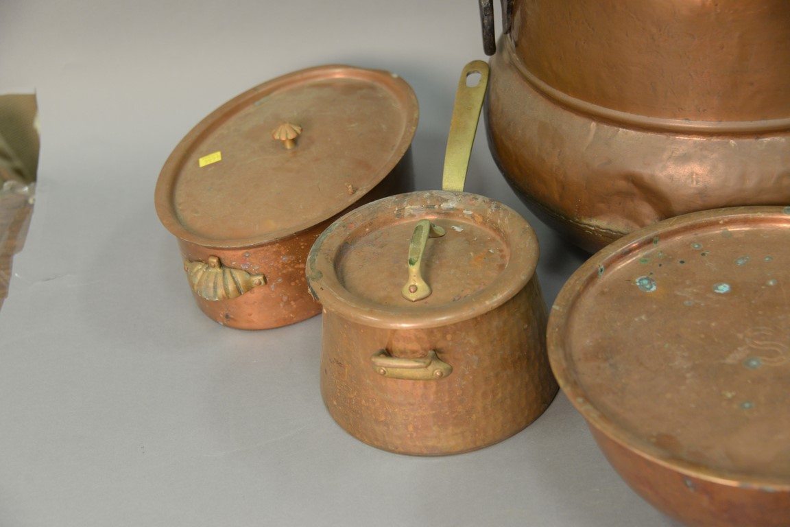 Seven copper pots to include three hand hammered pots with heavy brass handles. largest: ht. 12in., dia. 16in.