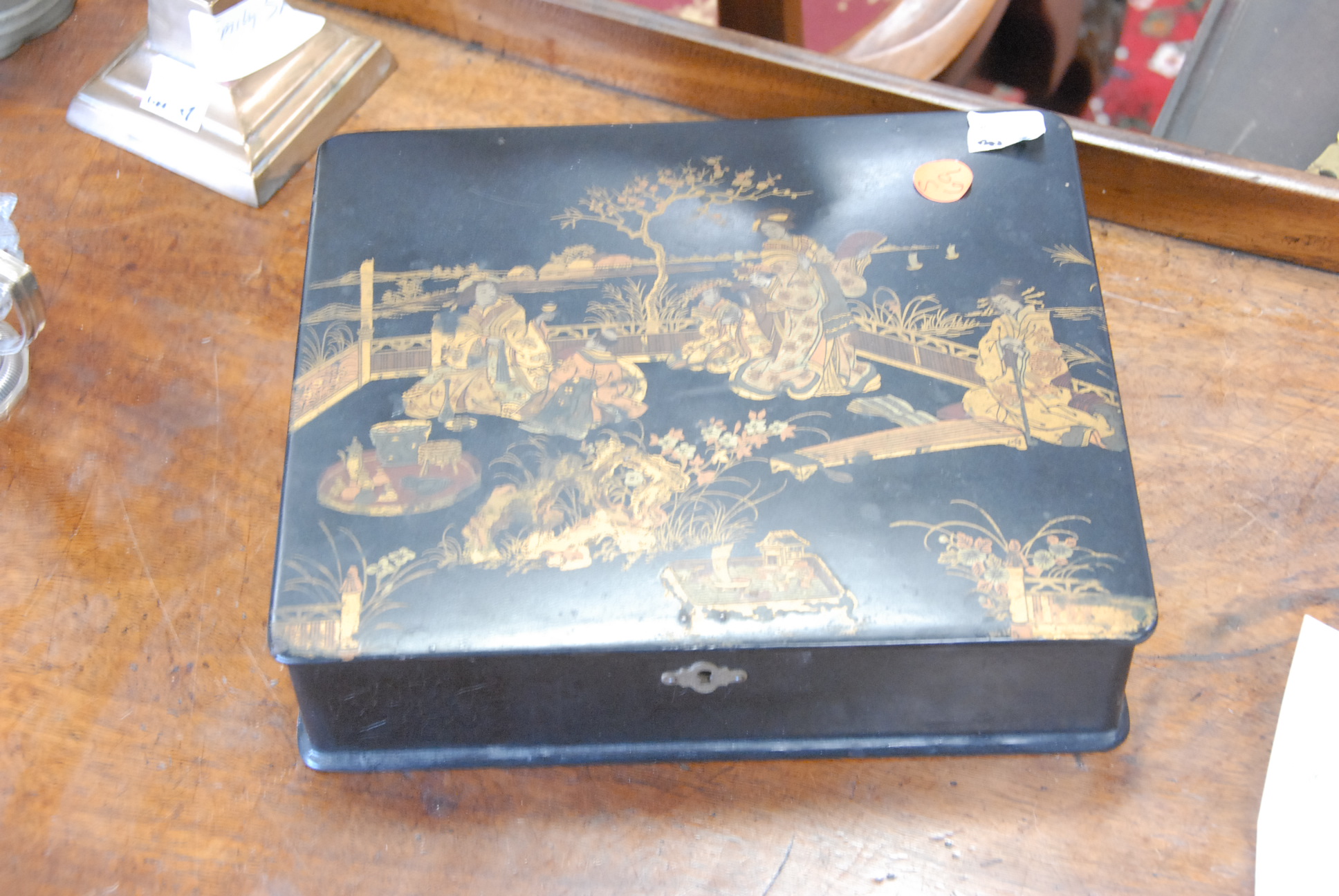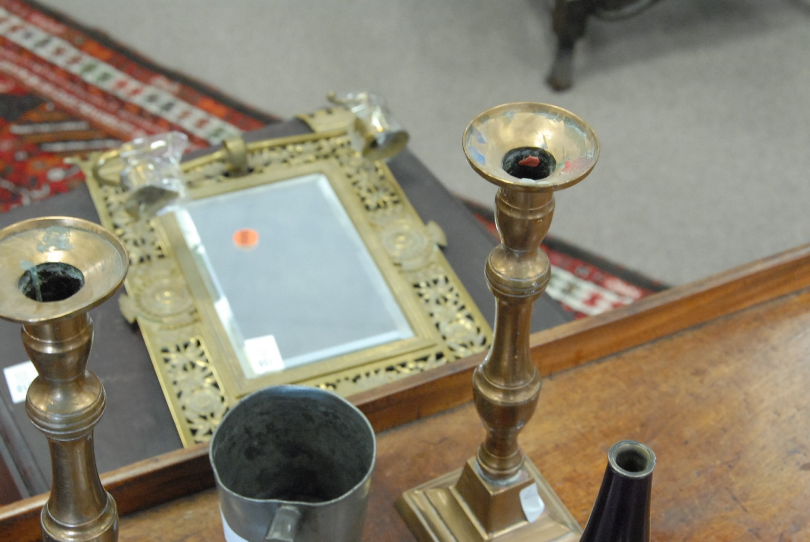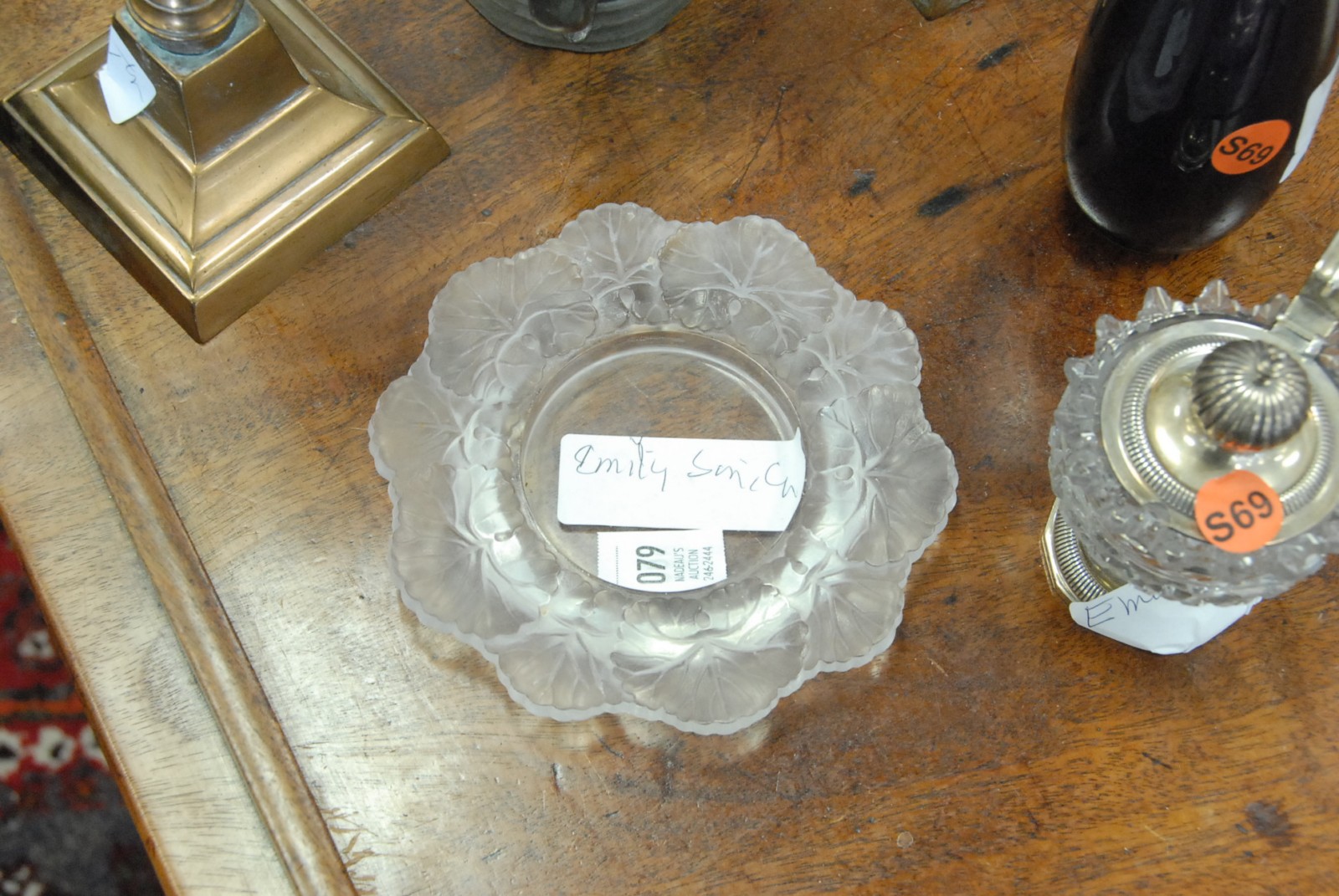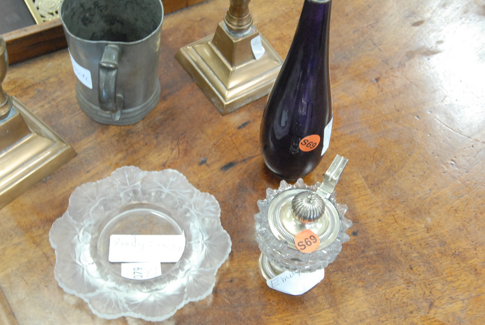 Seven piece lot to include a pair of candlesticks, an enameled Japanese vase, pewter cup, Lalique dish, Oriental decorated lift top box, and a small mustard dish with silver top and bottom