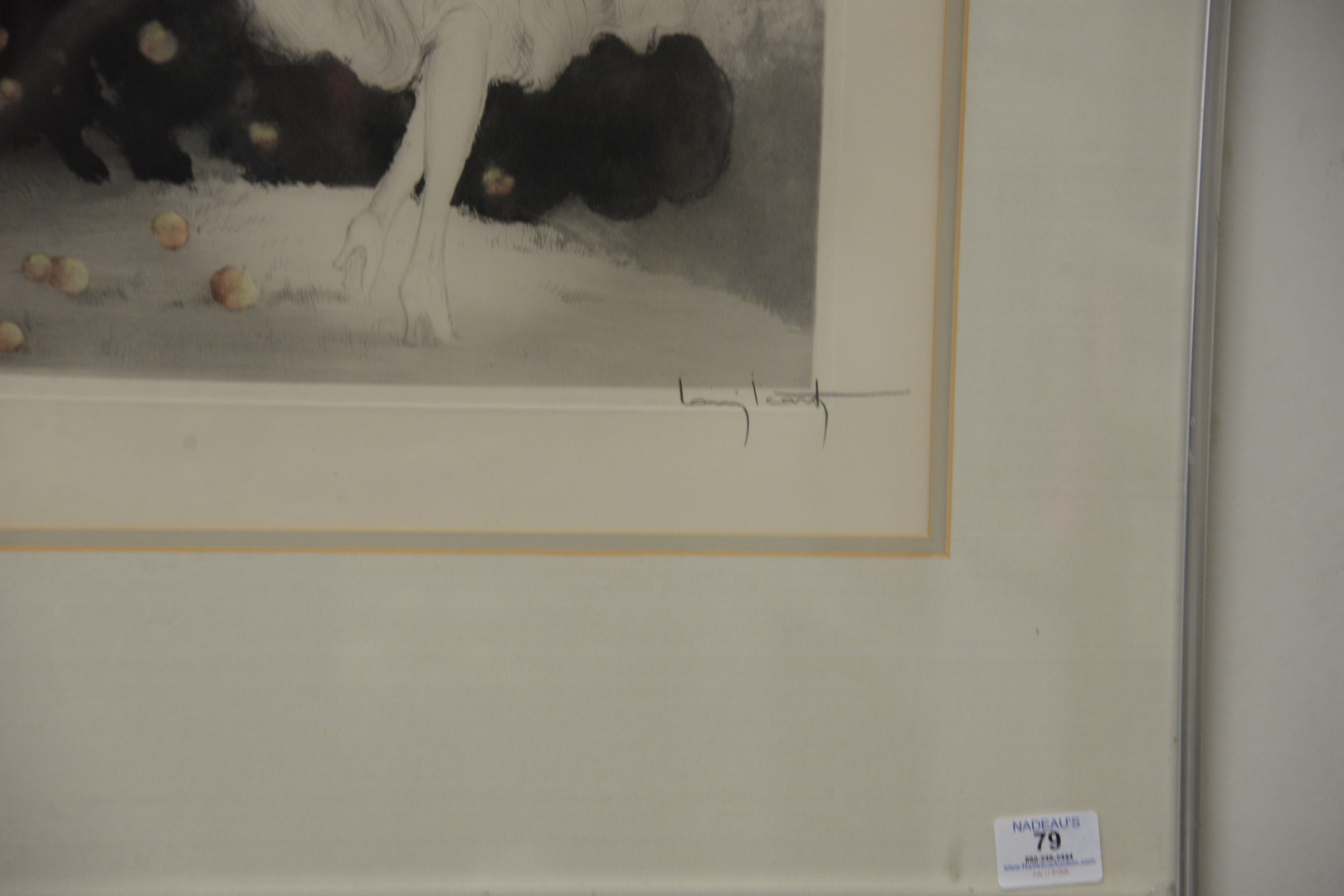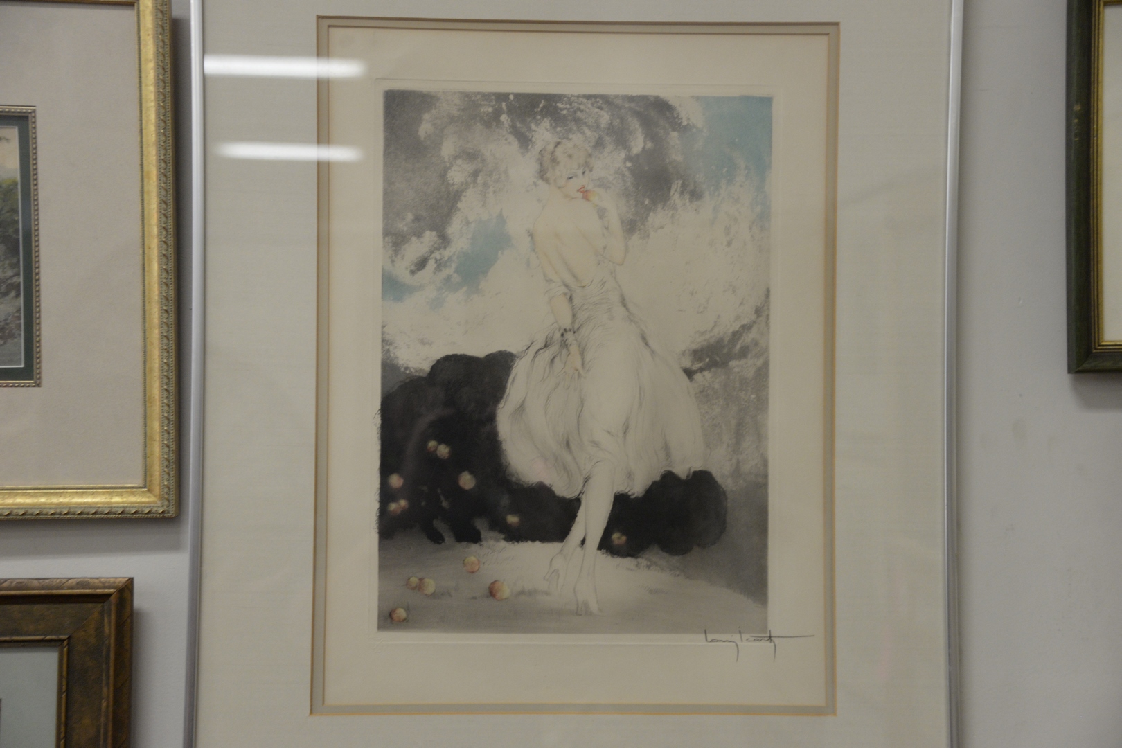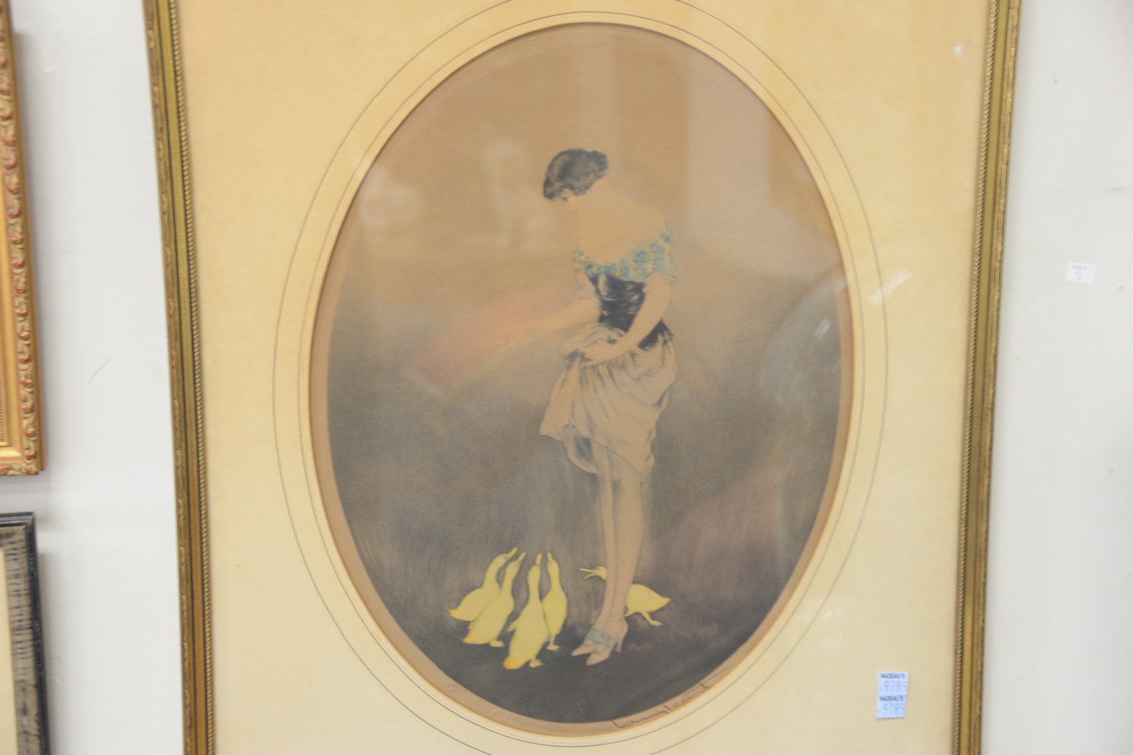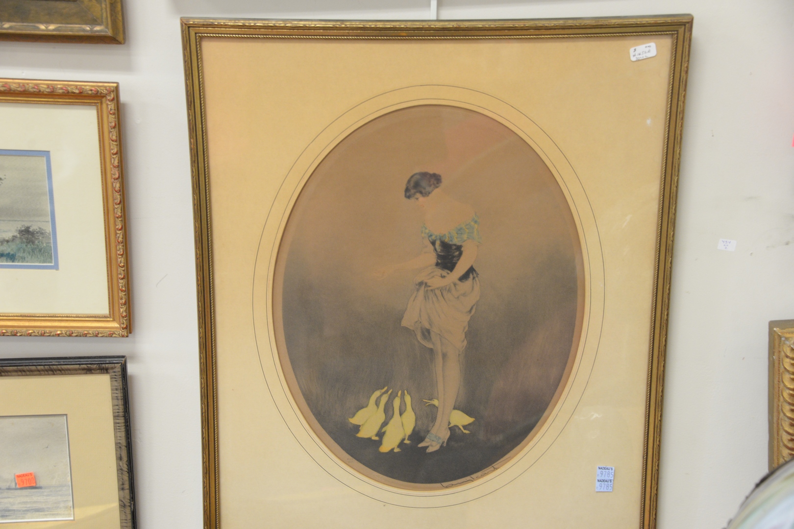 Lot 79: Two Louis Icart Etchings, to include Woman with Ducks, along with a woman walking away from spilled apples, each etching in colors on paper, (as is with heavy toning and tear), image size 17″ x 11 5/8″.