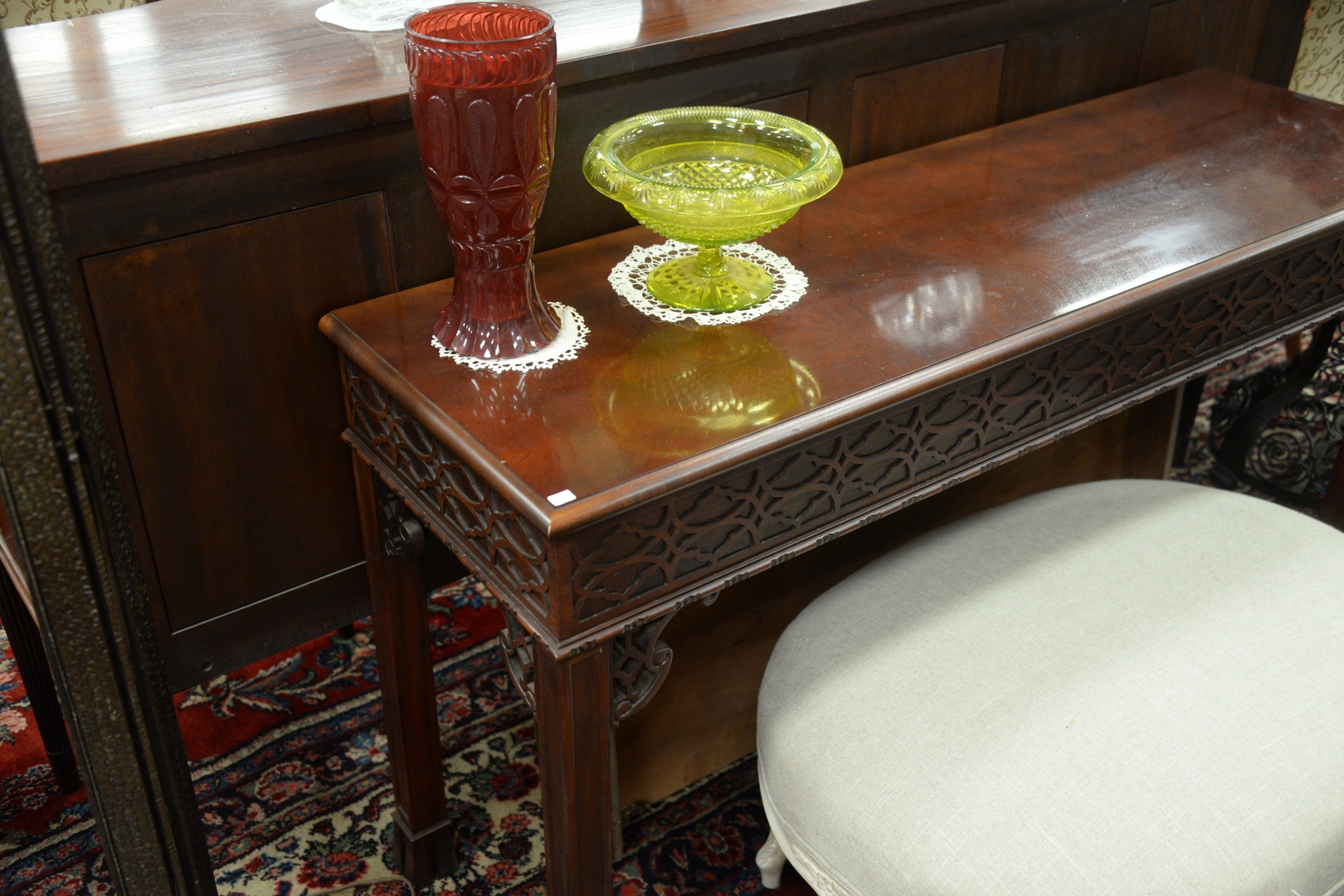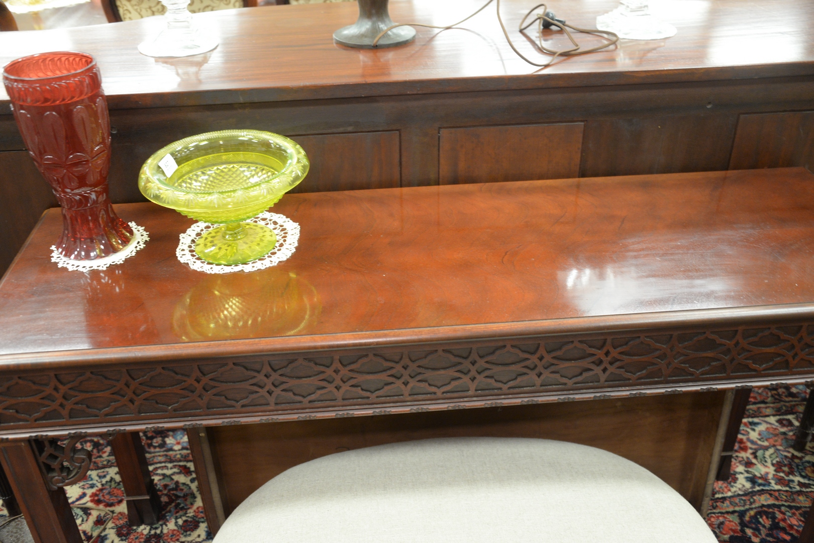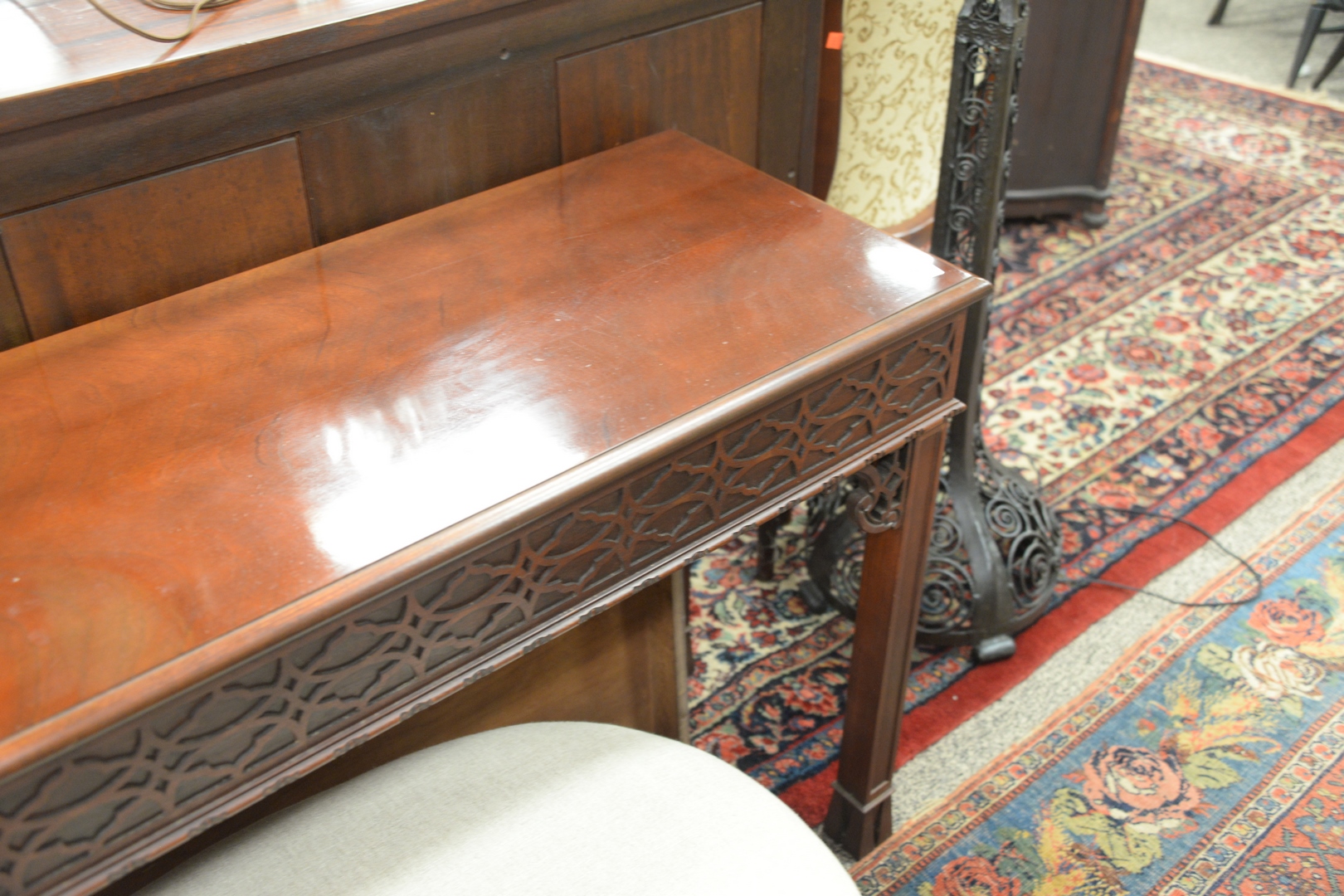 Baker Mahogany Chinese Chippendale Style Sofa Table, height 30 1/2 inches, top 17 x 55.