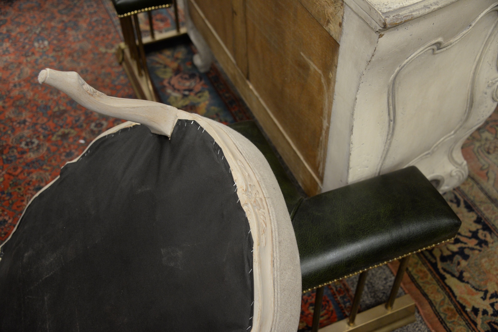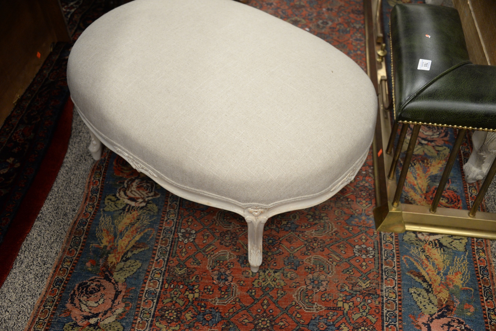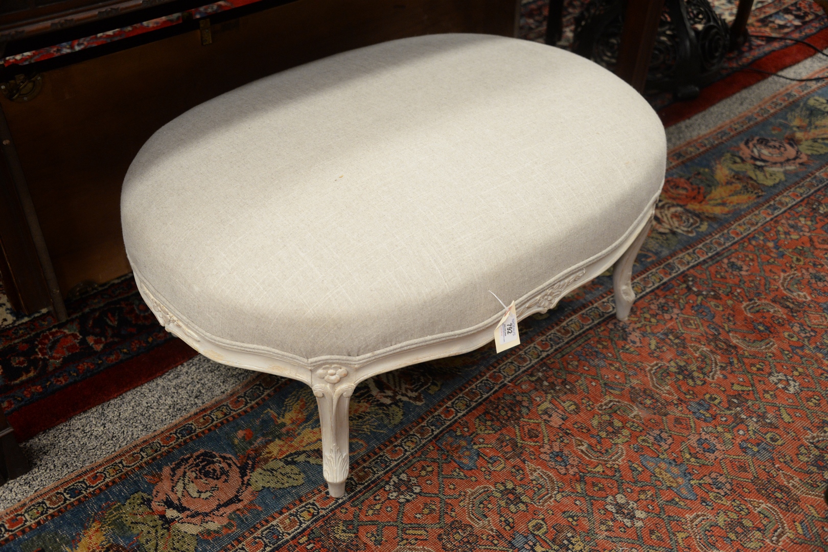 19th Century Louis XV Style Upholstered Painted Stool, height 15 inches, top 24 x 32.