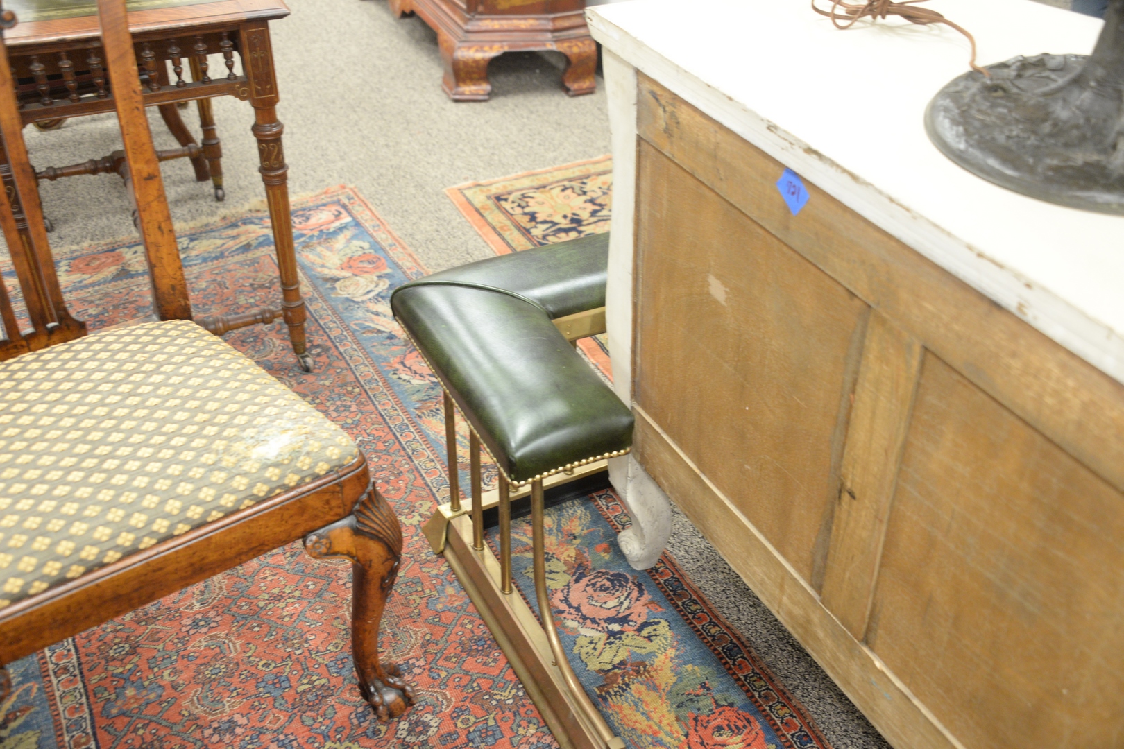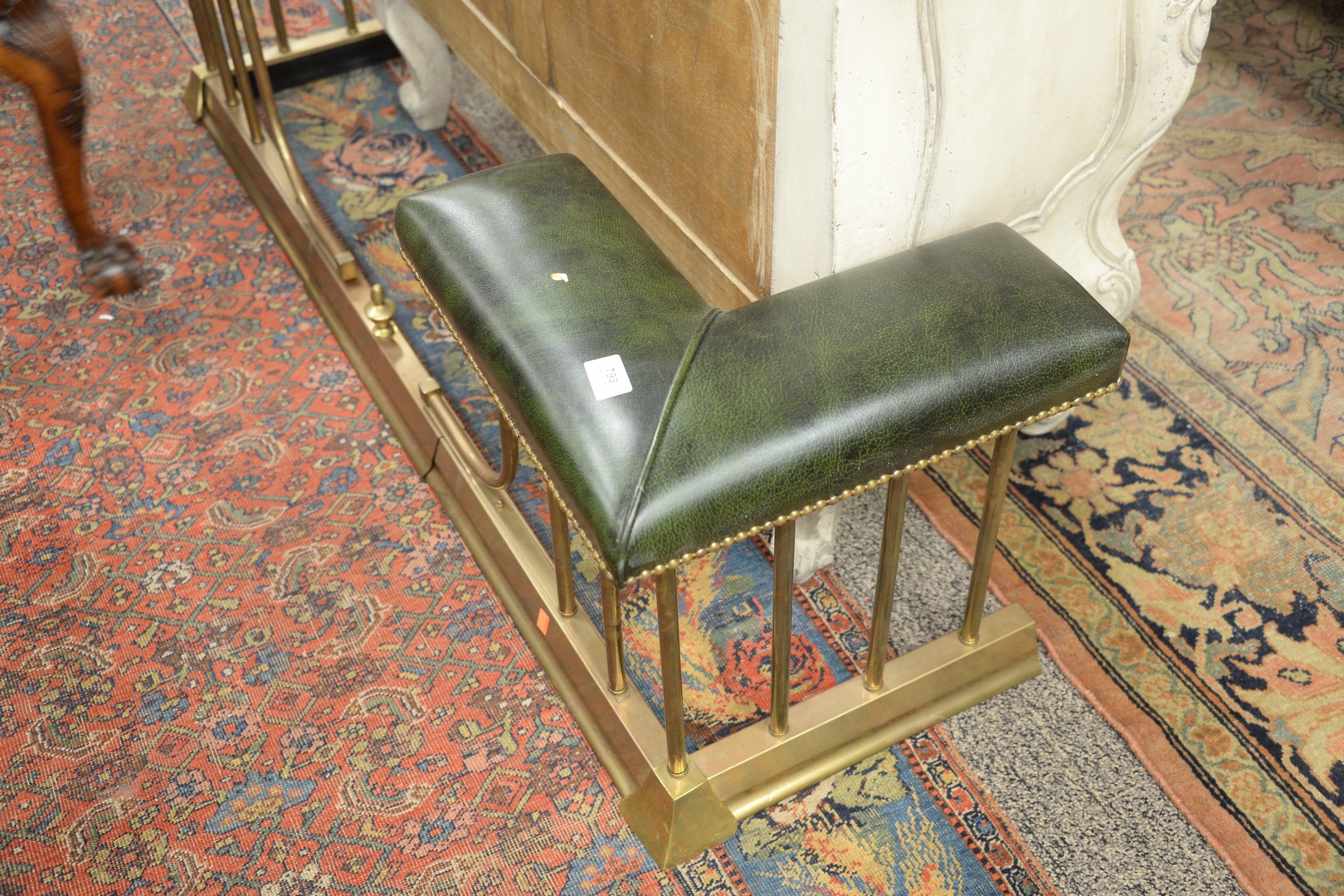 Lot 793: Leather Upholstered Brass Fire Bench, expands and contracts to size desired, height 18 inches.