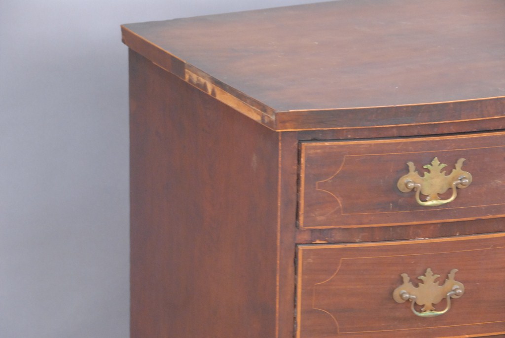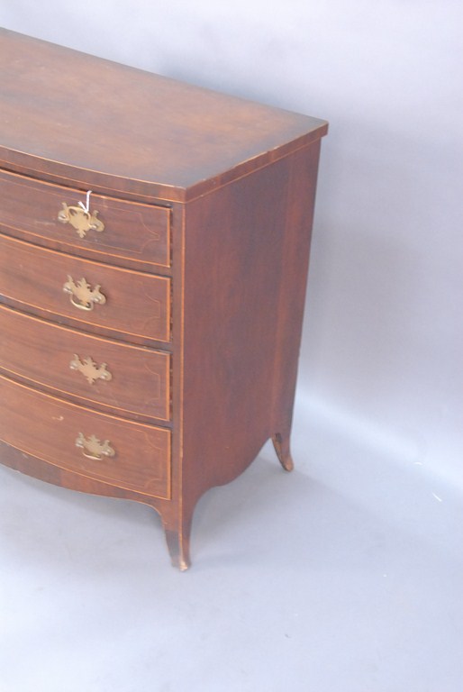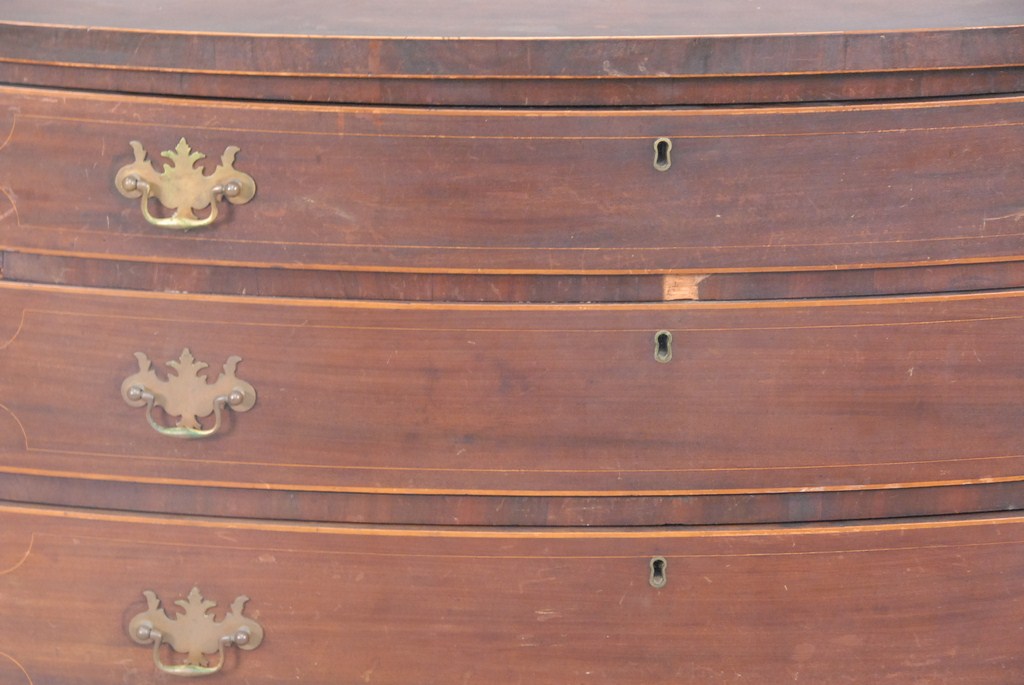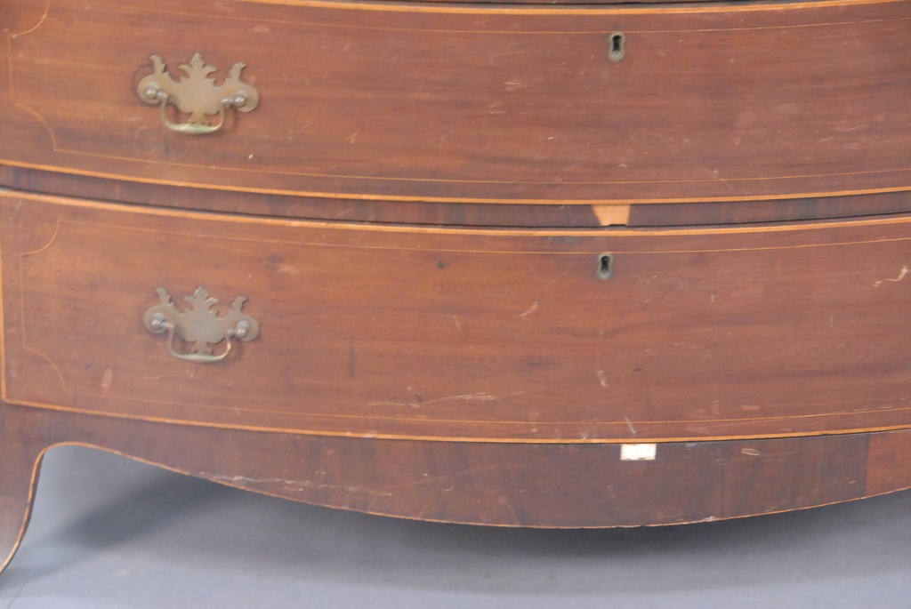 Lot 794: Federal cherry bow front chest of four drawers with line inlays on French feet with hand written label on reverse This bureau was a…