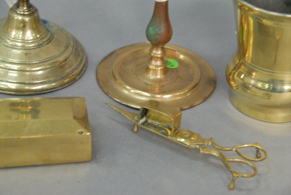 Five piece lot of early brass two candlesticks, one mug, one box, and one candle snipper.