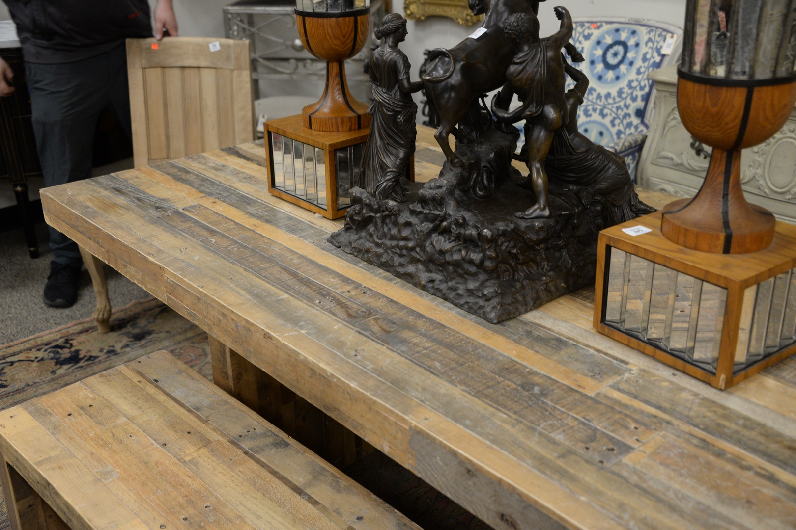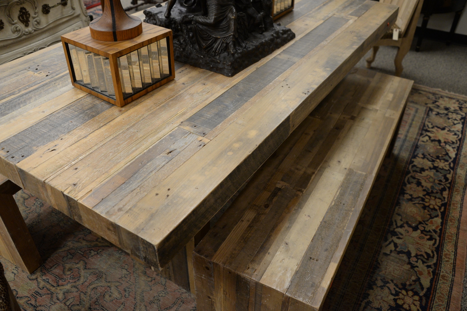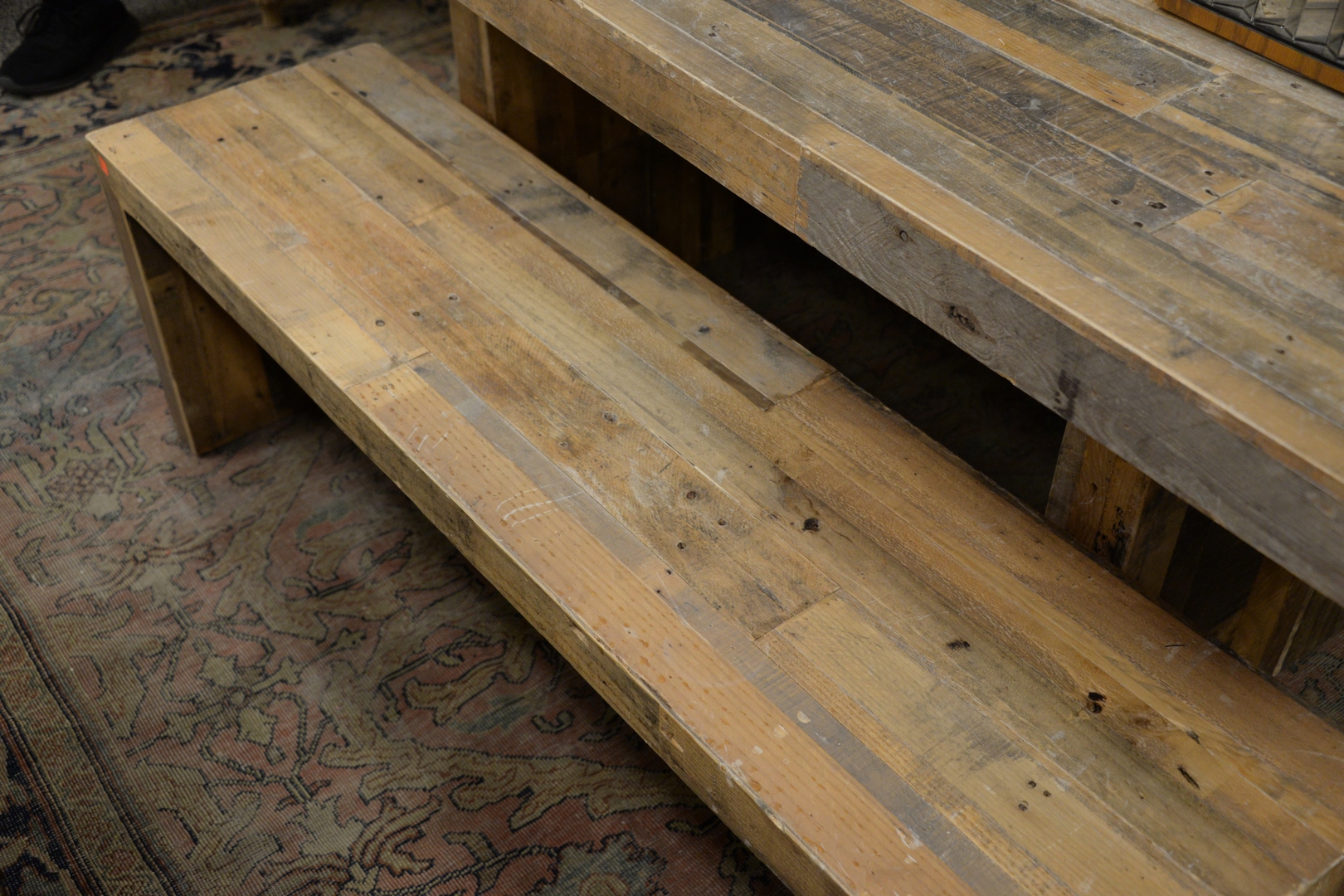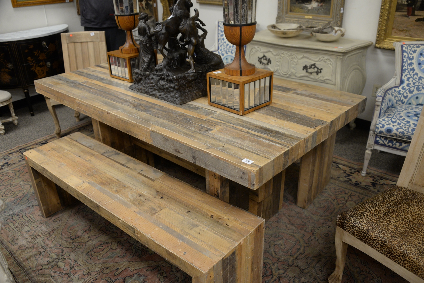 IND Butcher Block Style Table, and two benches, height 31 inches, top 39 x 72.