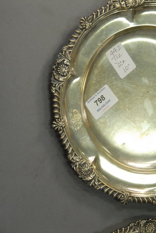 Pair of Tiffany & Co. service plates with gardrooned borders and family crest of Vanderbilts marked Tiffany & Co. Makers. dia. 10in. 44.2 t oz.