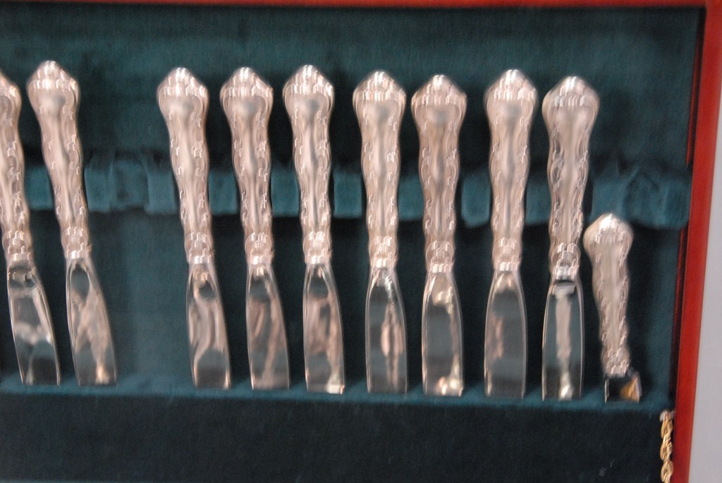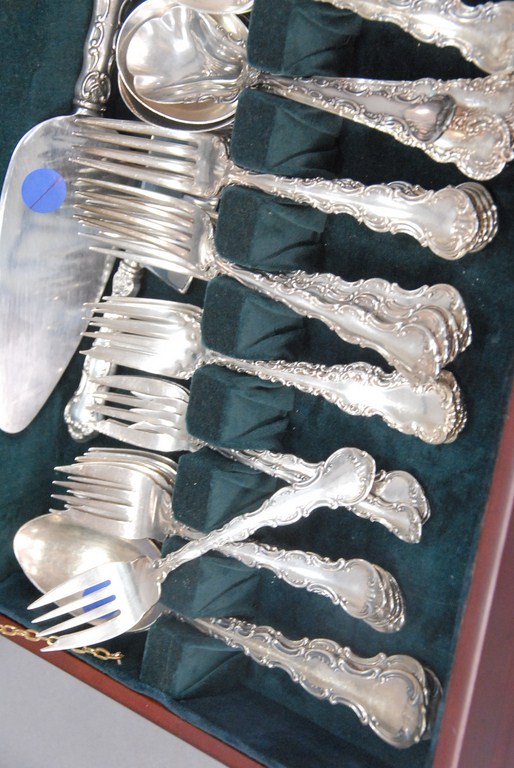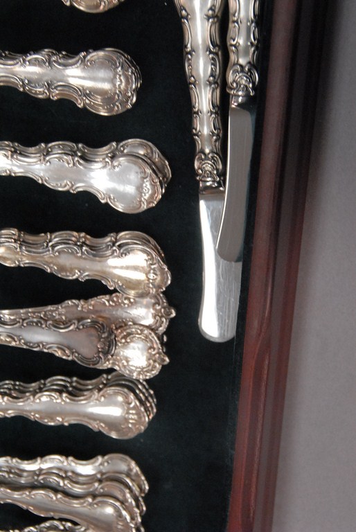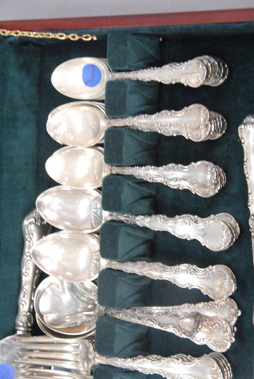 Lot 799: Gorham Strasburg sterling silver flatware set for twelve, 87 pieces total.90.2 t oz plus 21 handles