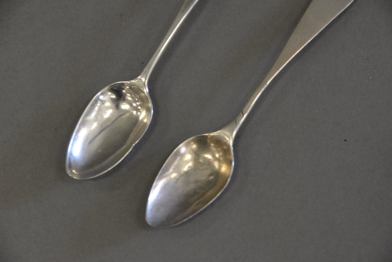 Two Early Silver Teaspoons, one marked J.R., probably Joseph Richardson, having some dents, length 5 1/2 inches.