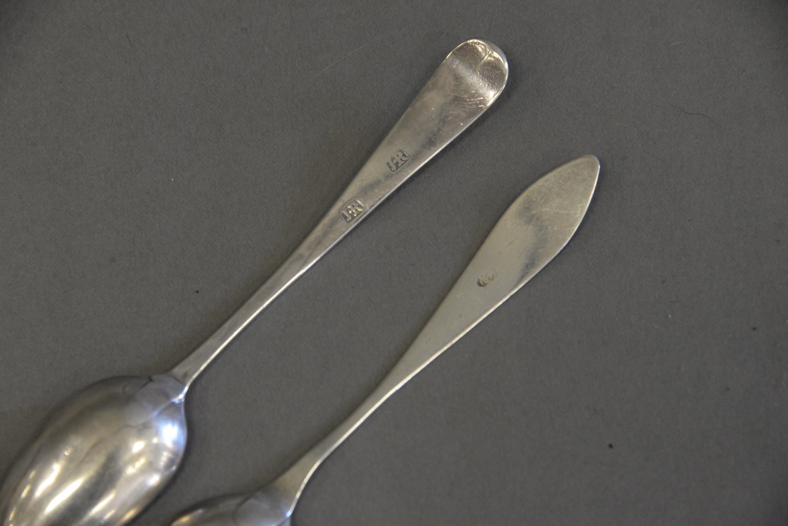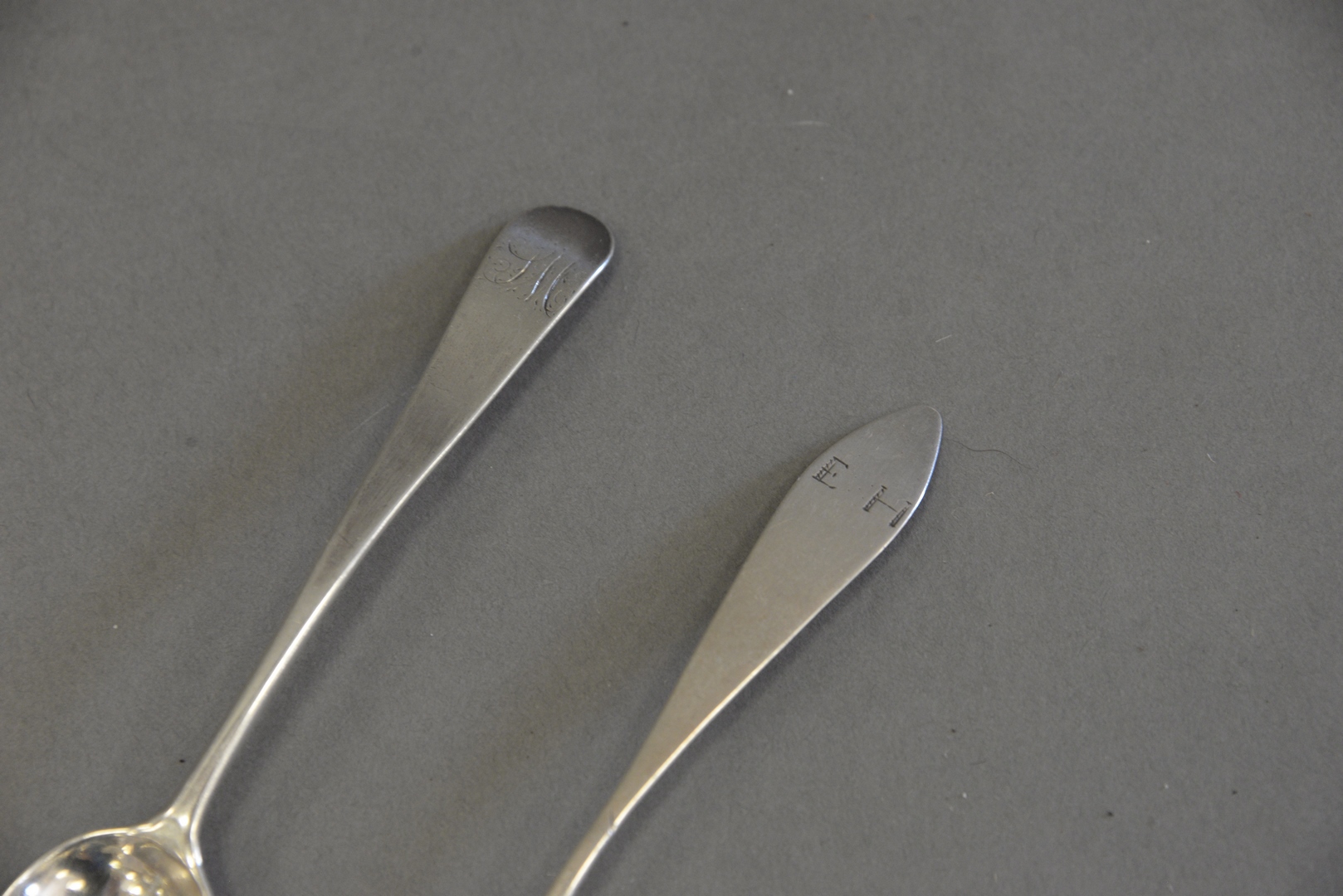Lot 7B: Two Early Silver Teaspoons, one marked J.R., probably Joseph Richardson, having some dents, length 5 1/2 inches.