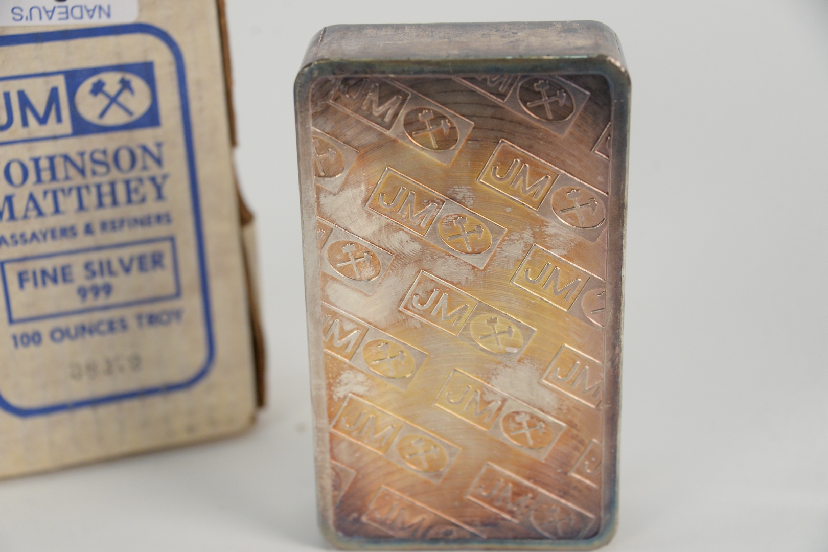 100 troy oz. Johnson Matthey Silver Bar, marked 999 fine silver, 100 troy ounces in box.