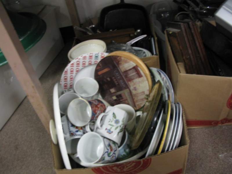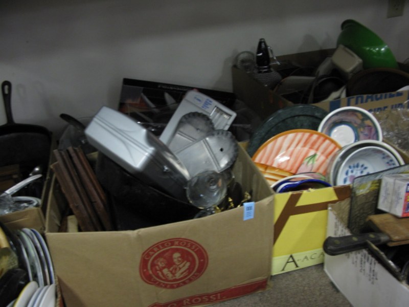 11 box lots kitchenware, glasses, bowls, pots, pans, flatware and misc.