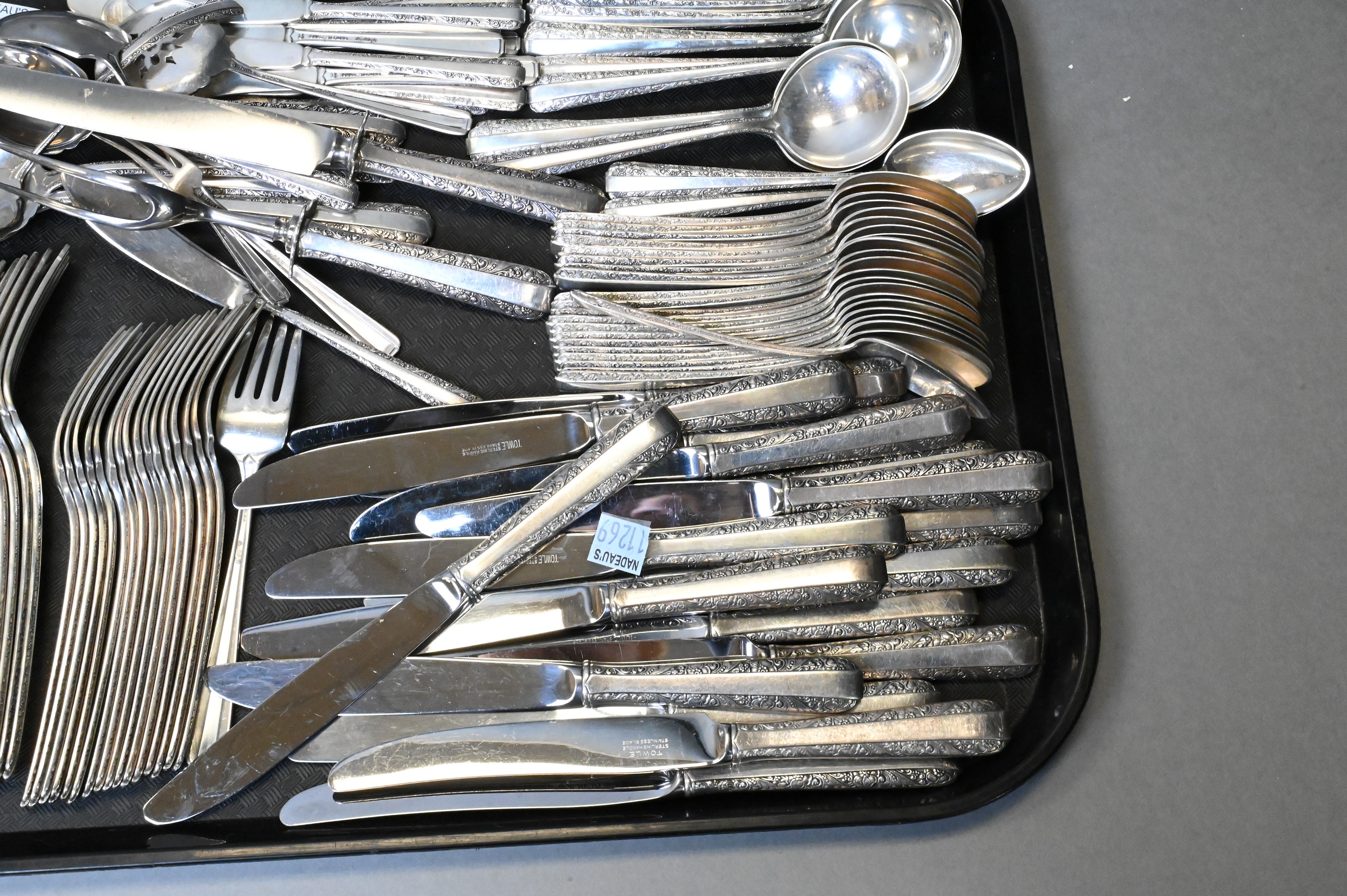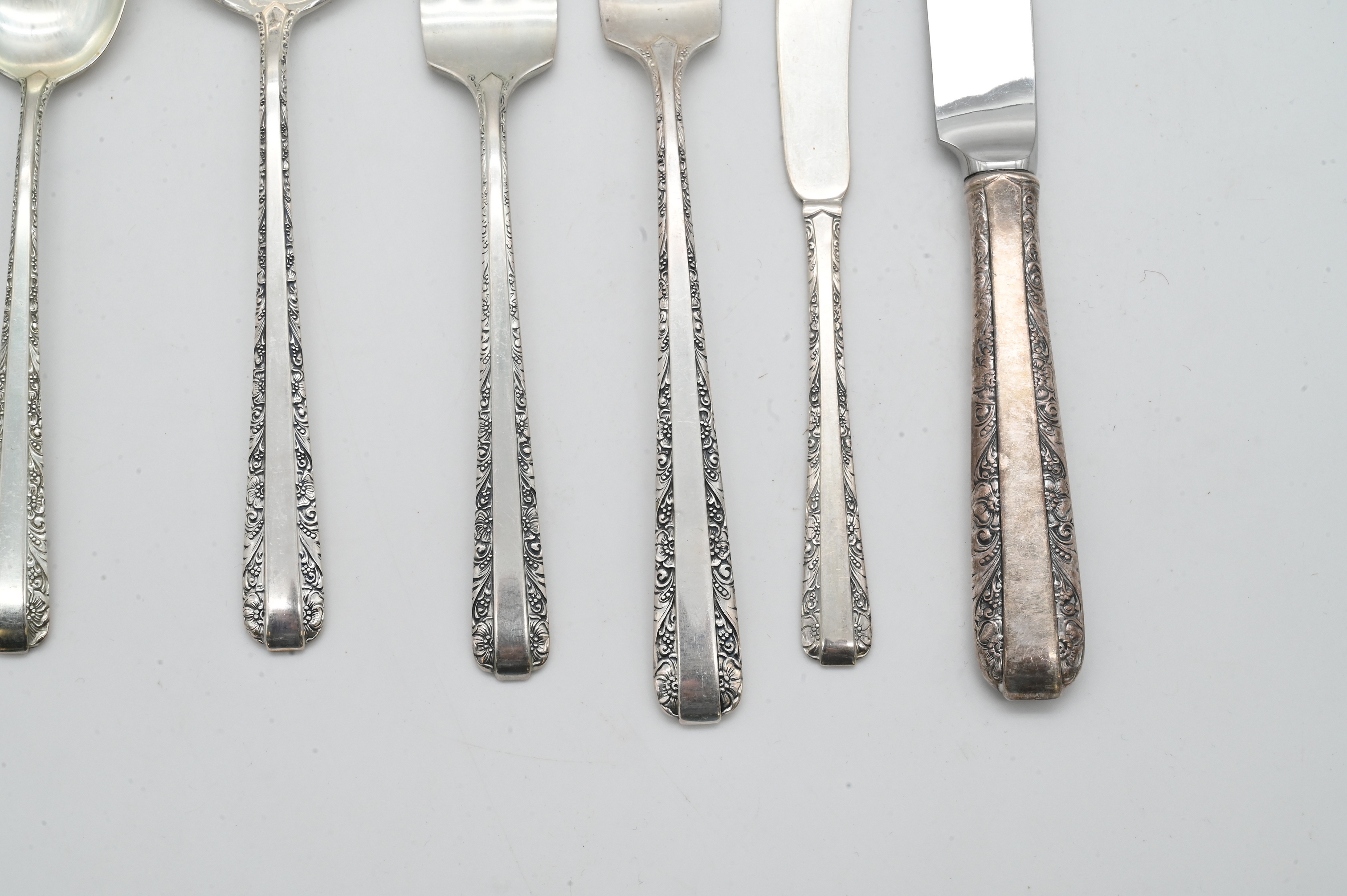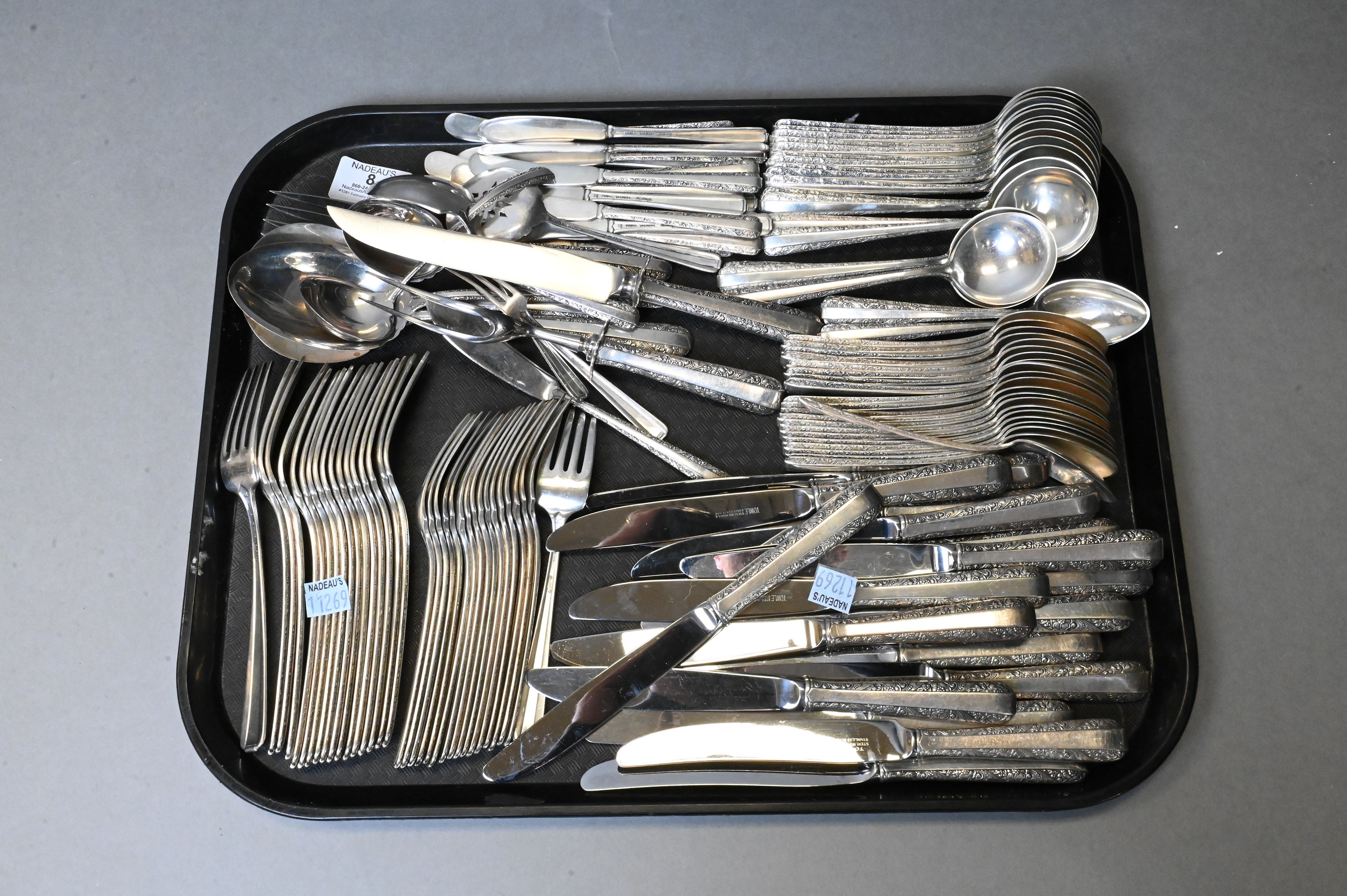 18 dinner forks,18 salad forks, 18 soup spoons, 26 teaspoons, 18 dinner knives, 18 butter spreaders, carving fork, carving knife, along with 10 additional serving pieces