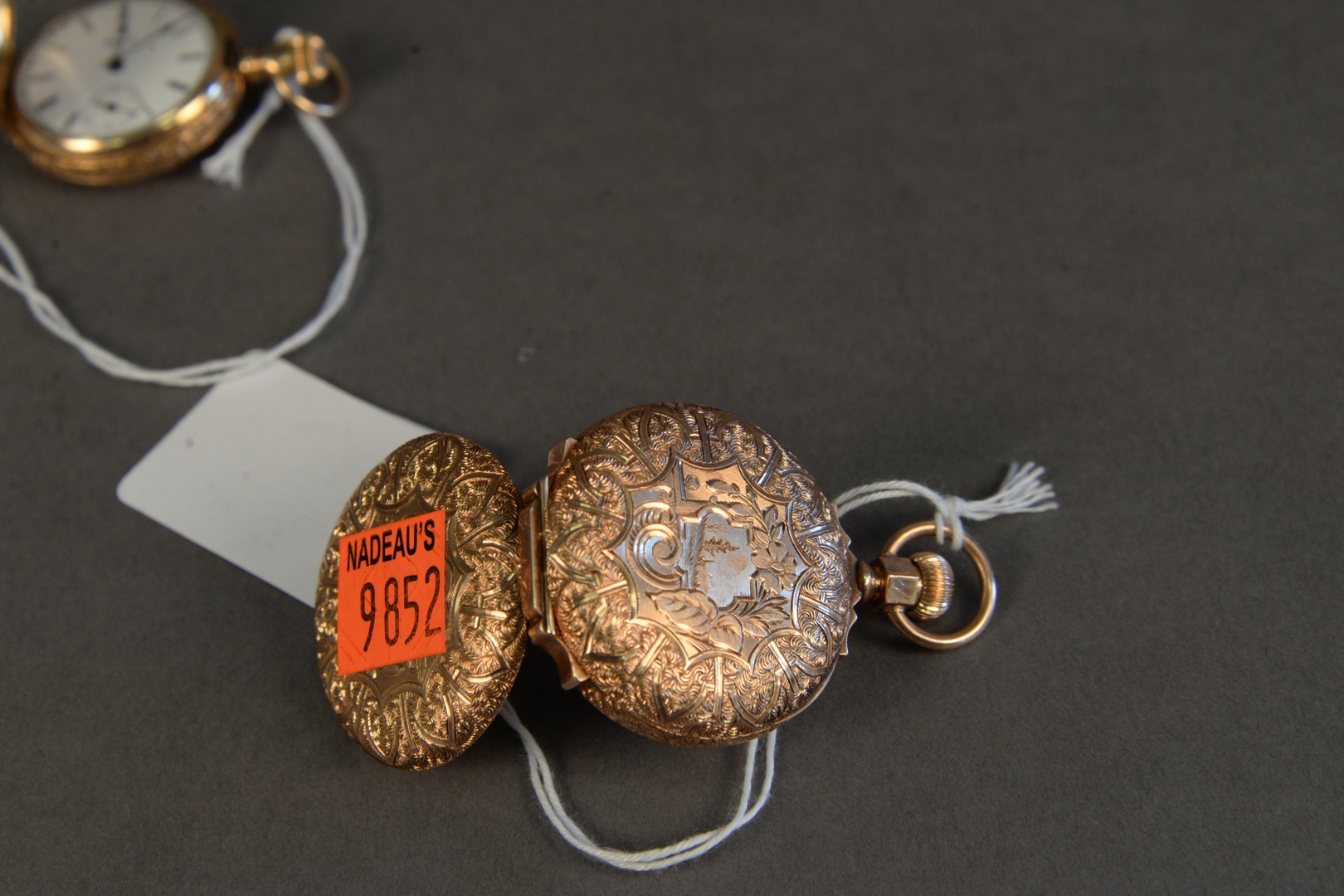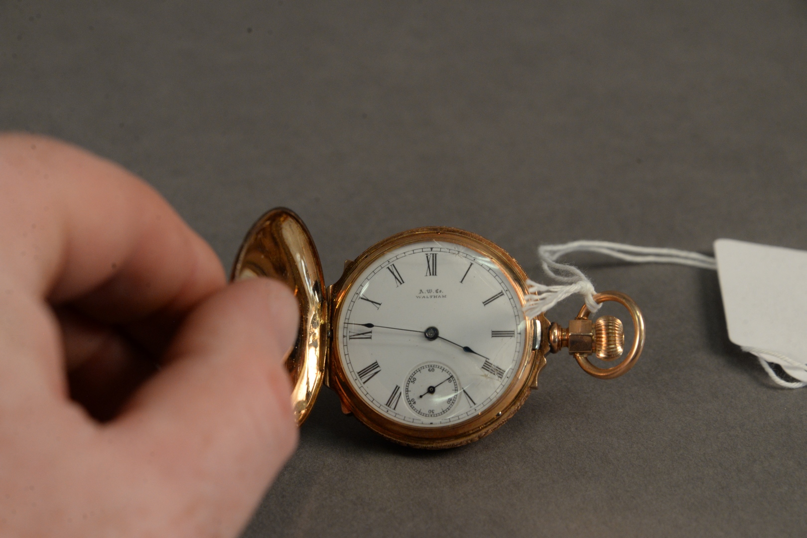 Lot 8: 14 Karat Gold American Waltham Closed Face Pocket Watch, along with slide chain, 15.7millimeter, 58.4 grams total weight, (crack in glass).