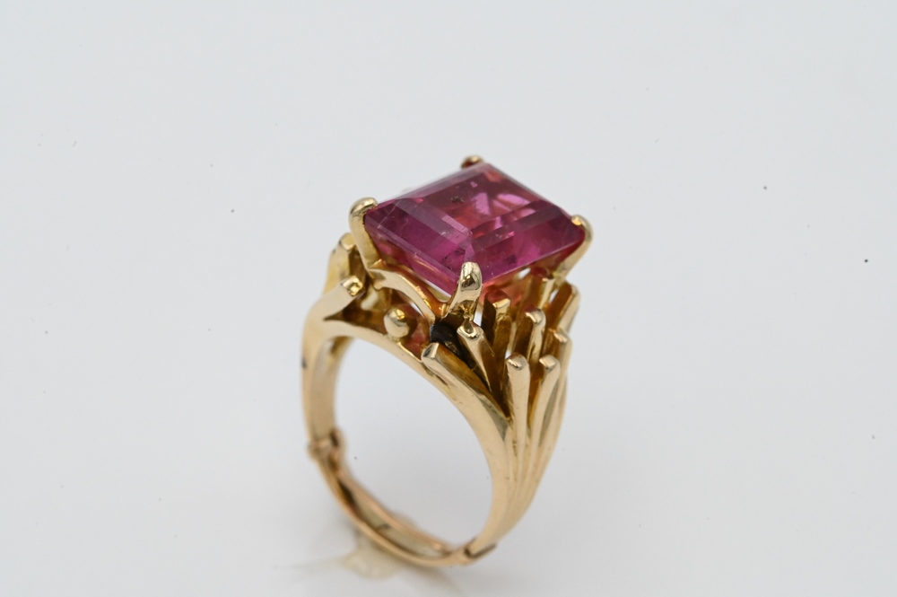 14 Karat Gold Ring, set with emerald cut pink stone, size 6, 11.8 grams.