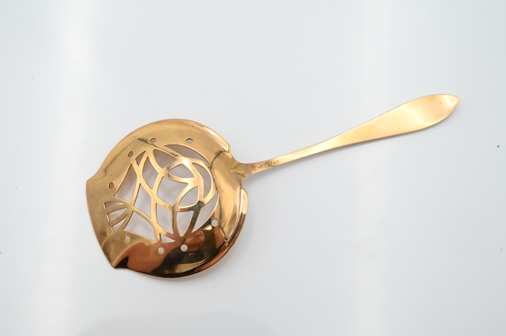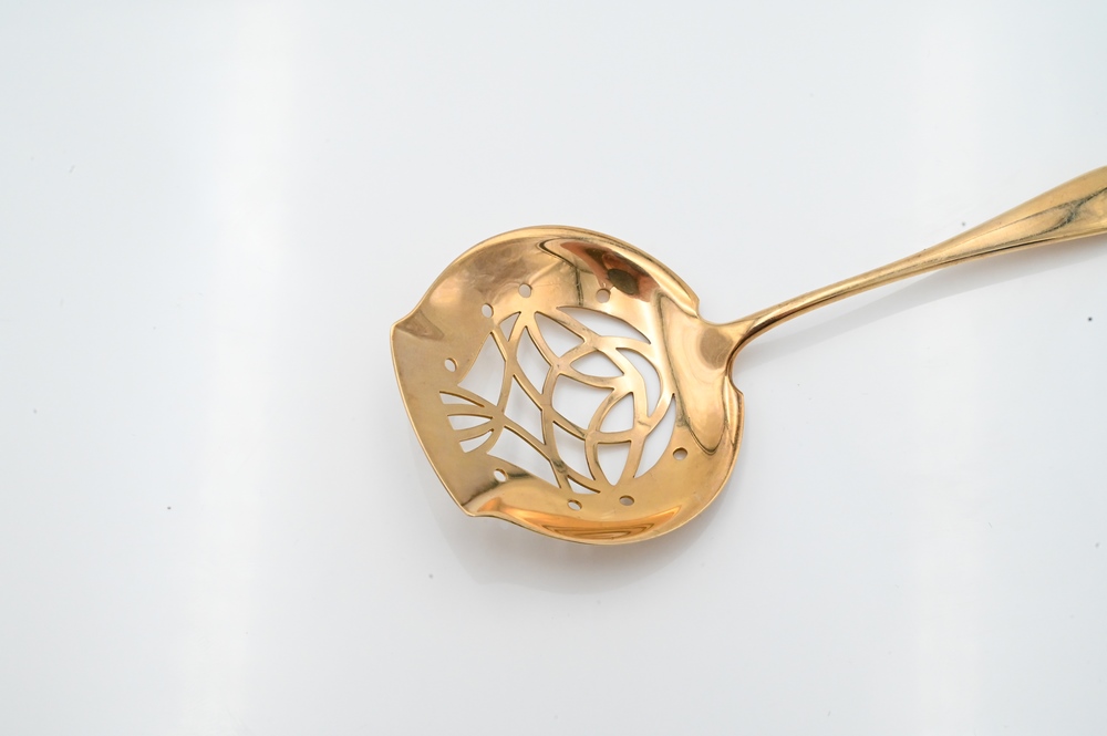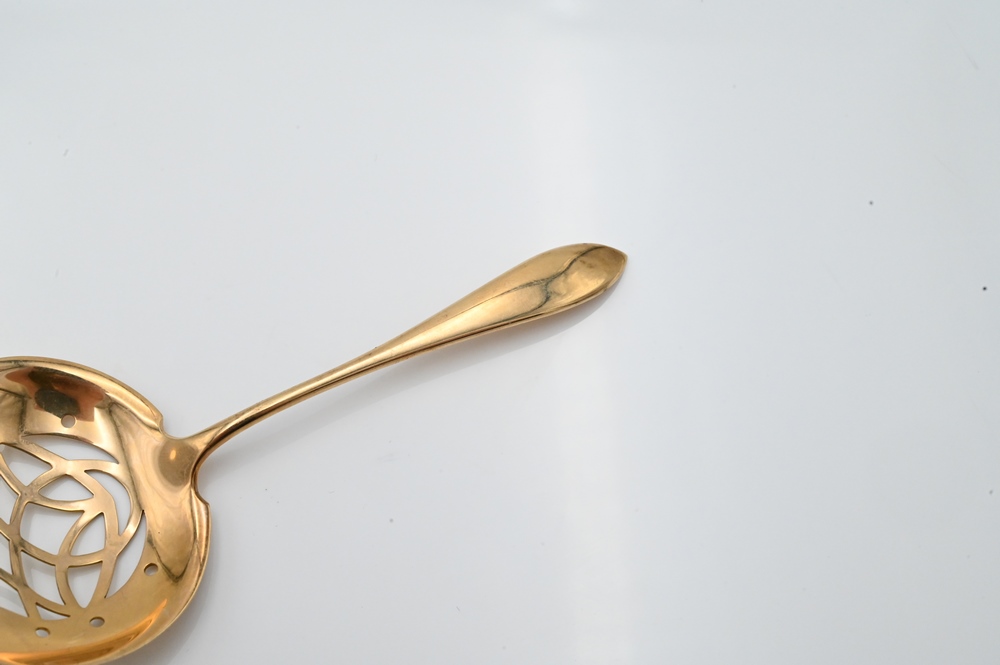 14 Karat Gold Strainer Spoon, length 4 1/2 inches, 18.7 grams.