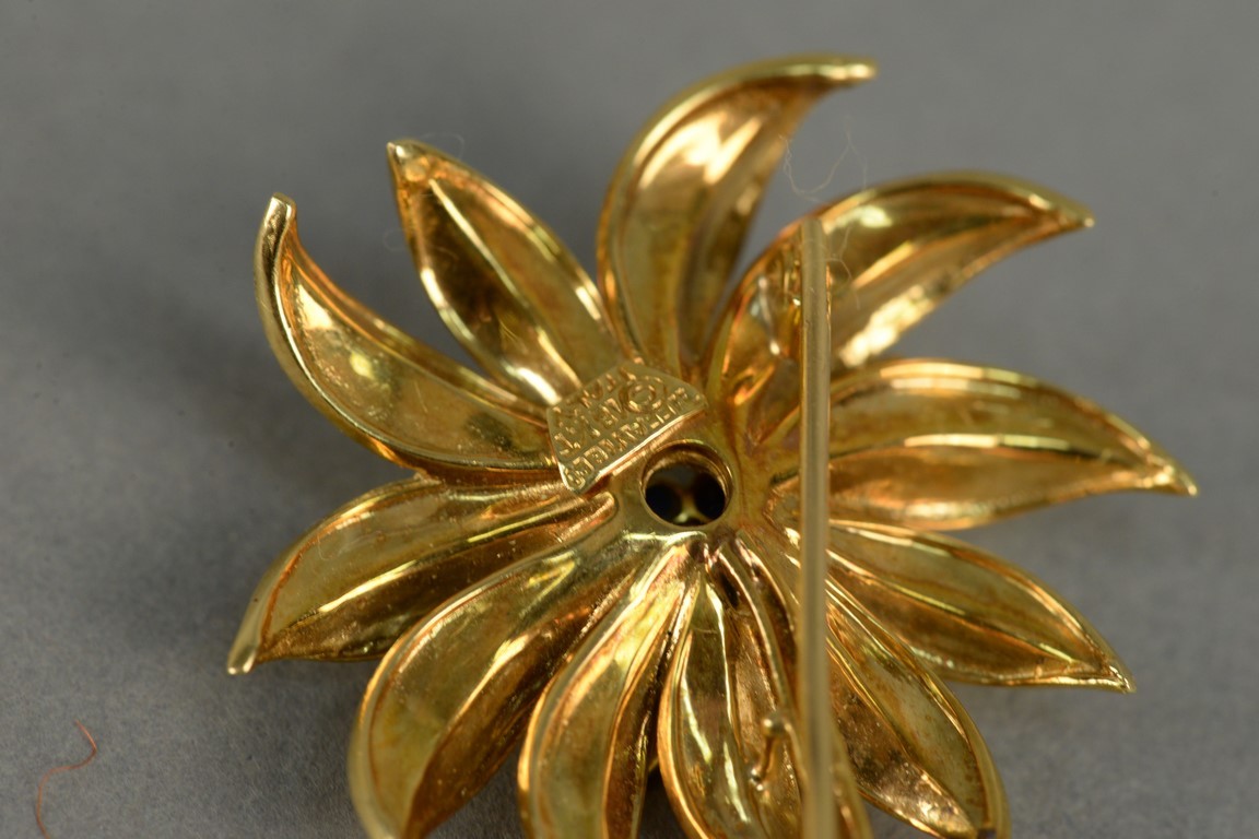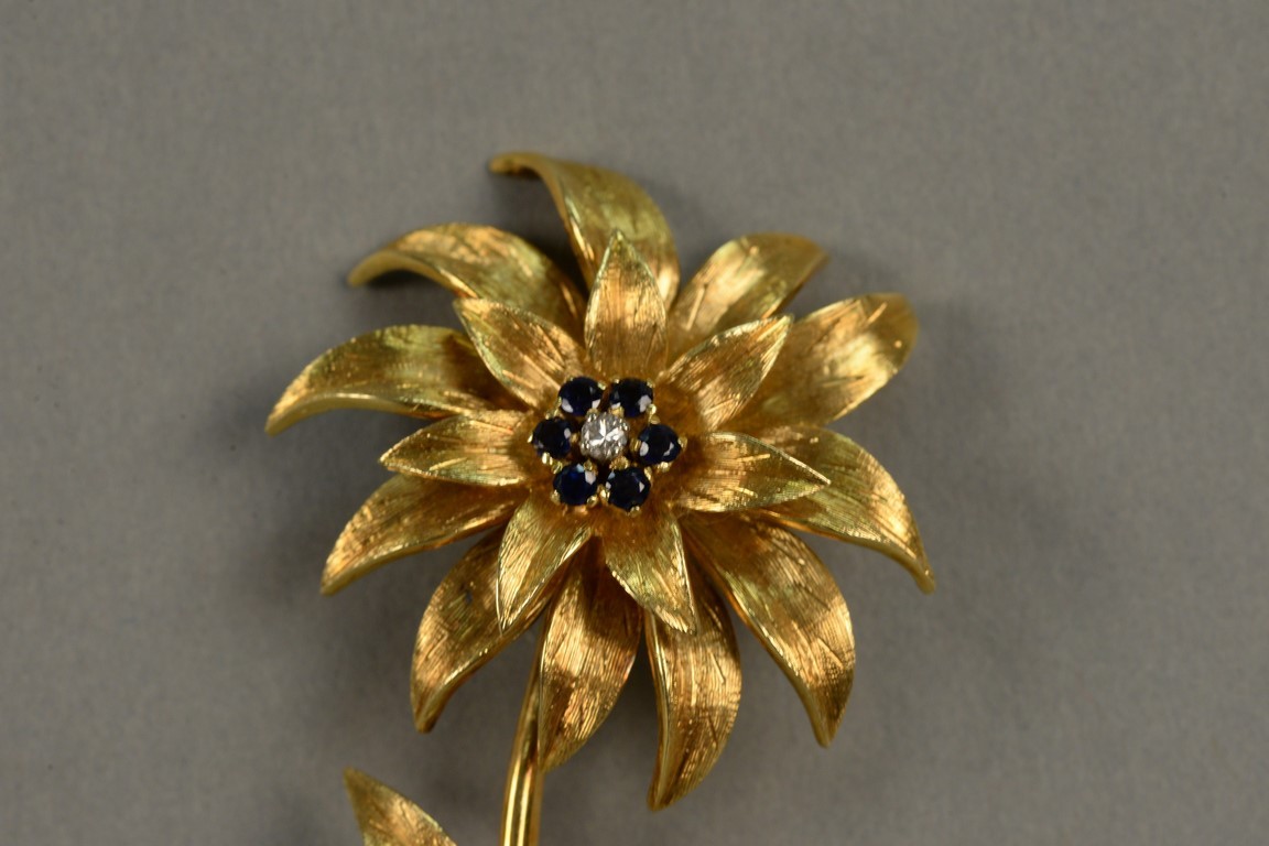 Lot 8: 18K Tiffany brooch in form of flower set with six blue sapphires and a center diamond. ht. 2 1/4in. 15.7 grams