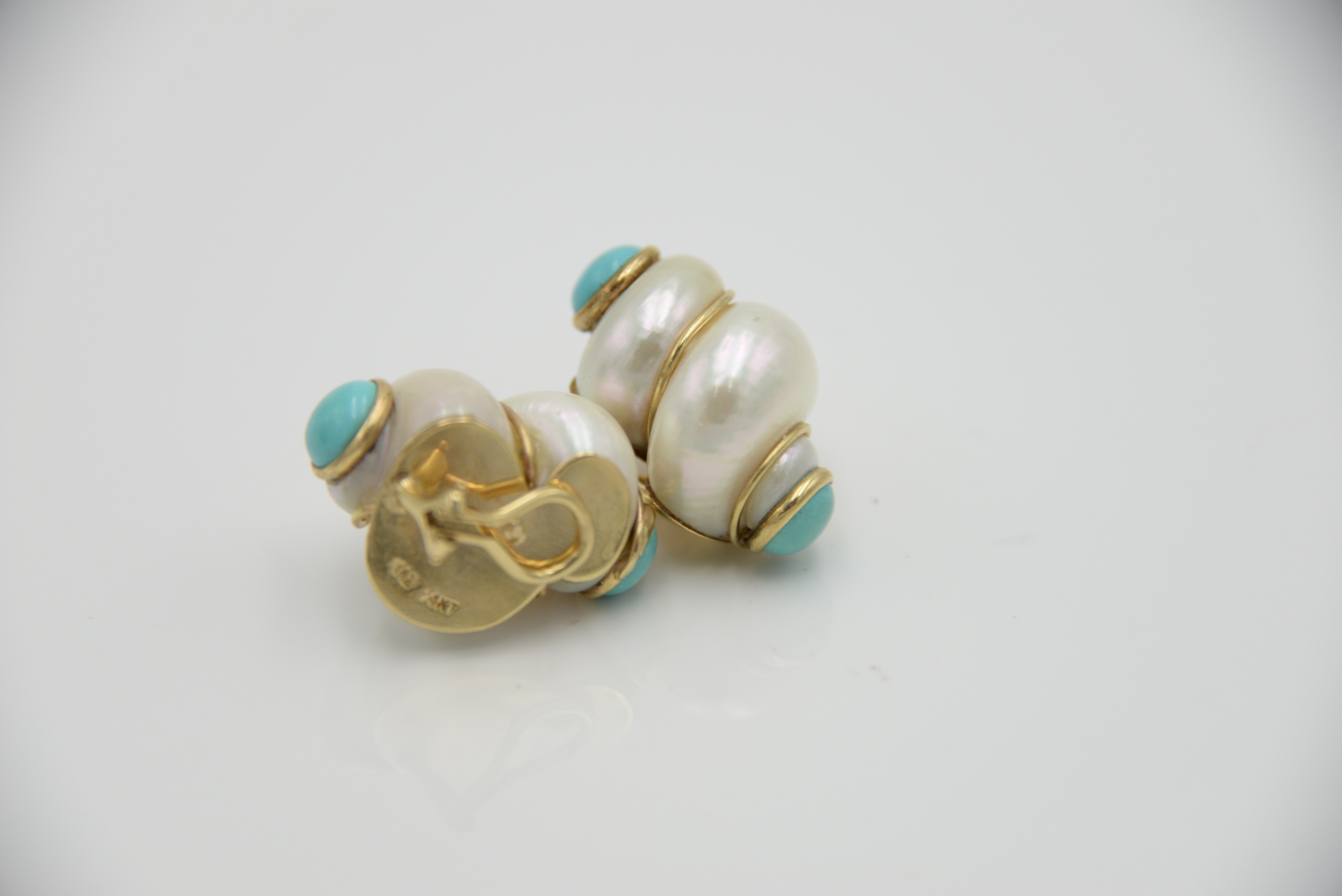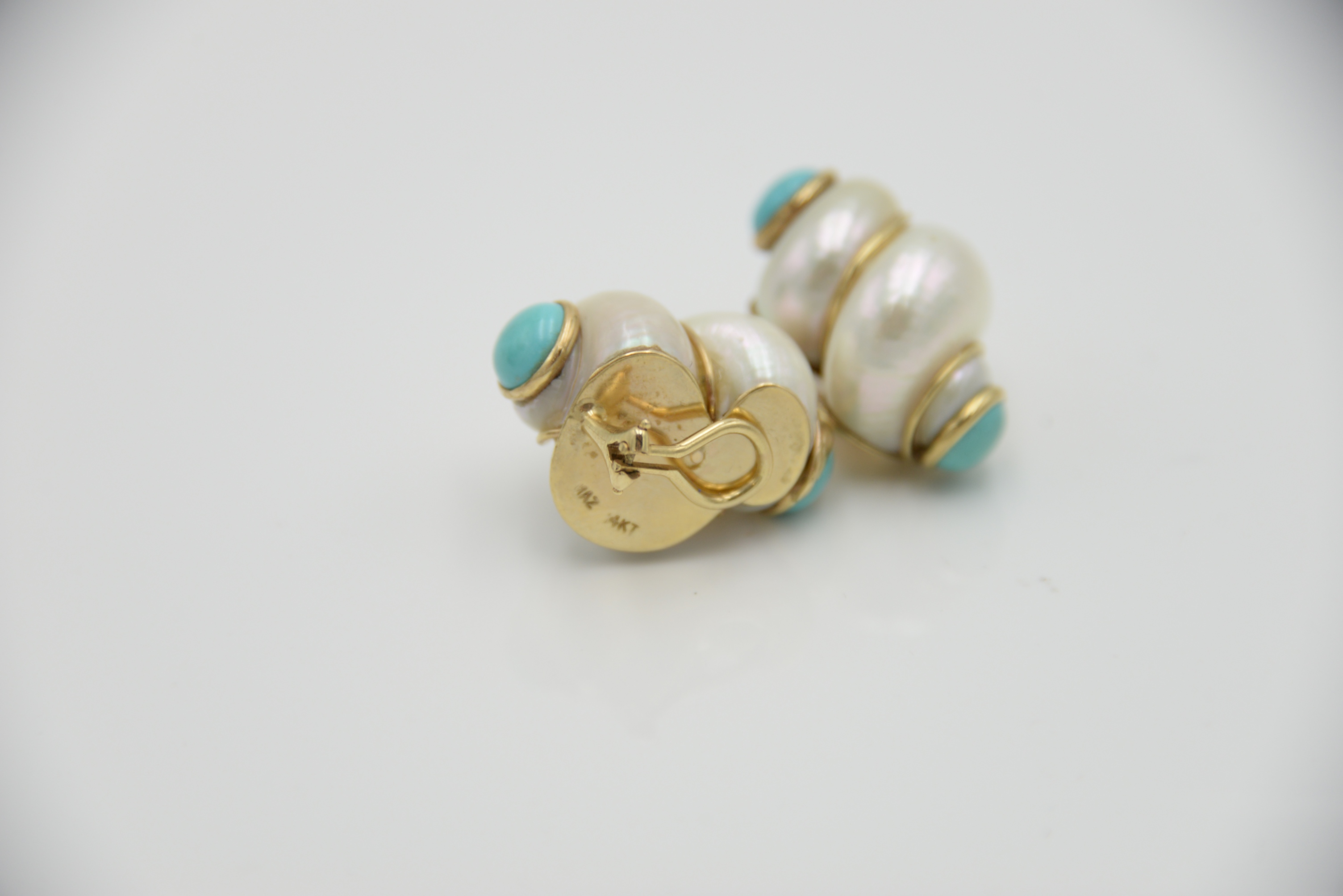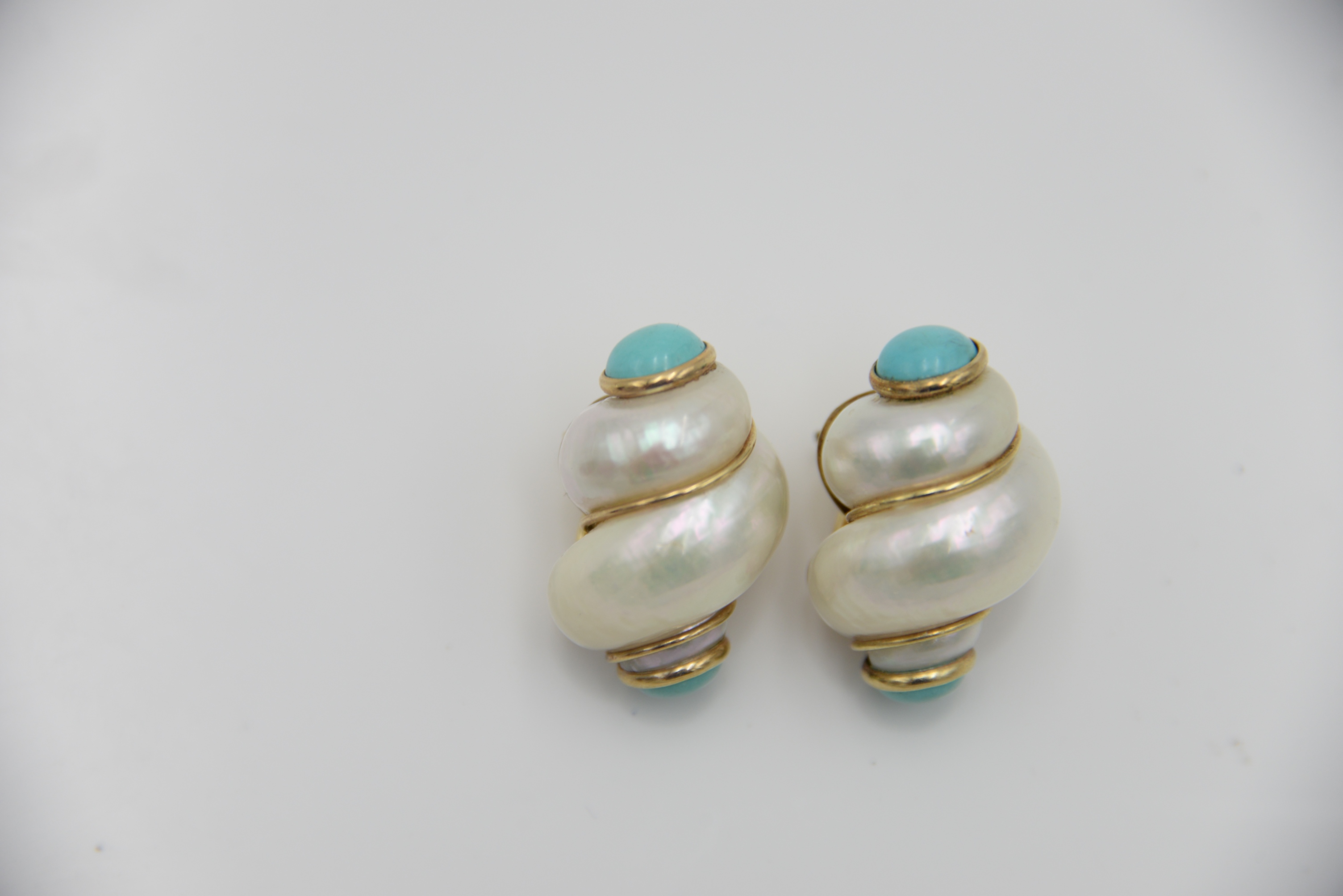 A Pair of Maz Turbo Shell and Turquoise Earrings in the manner of Seaman Schepps having 14 karat mounts and clip length 1 inch, width 1 inch