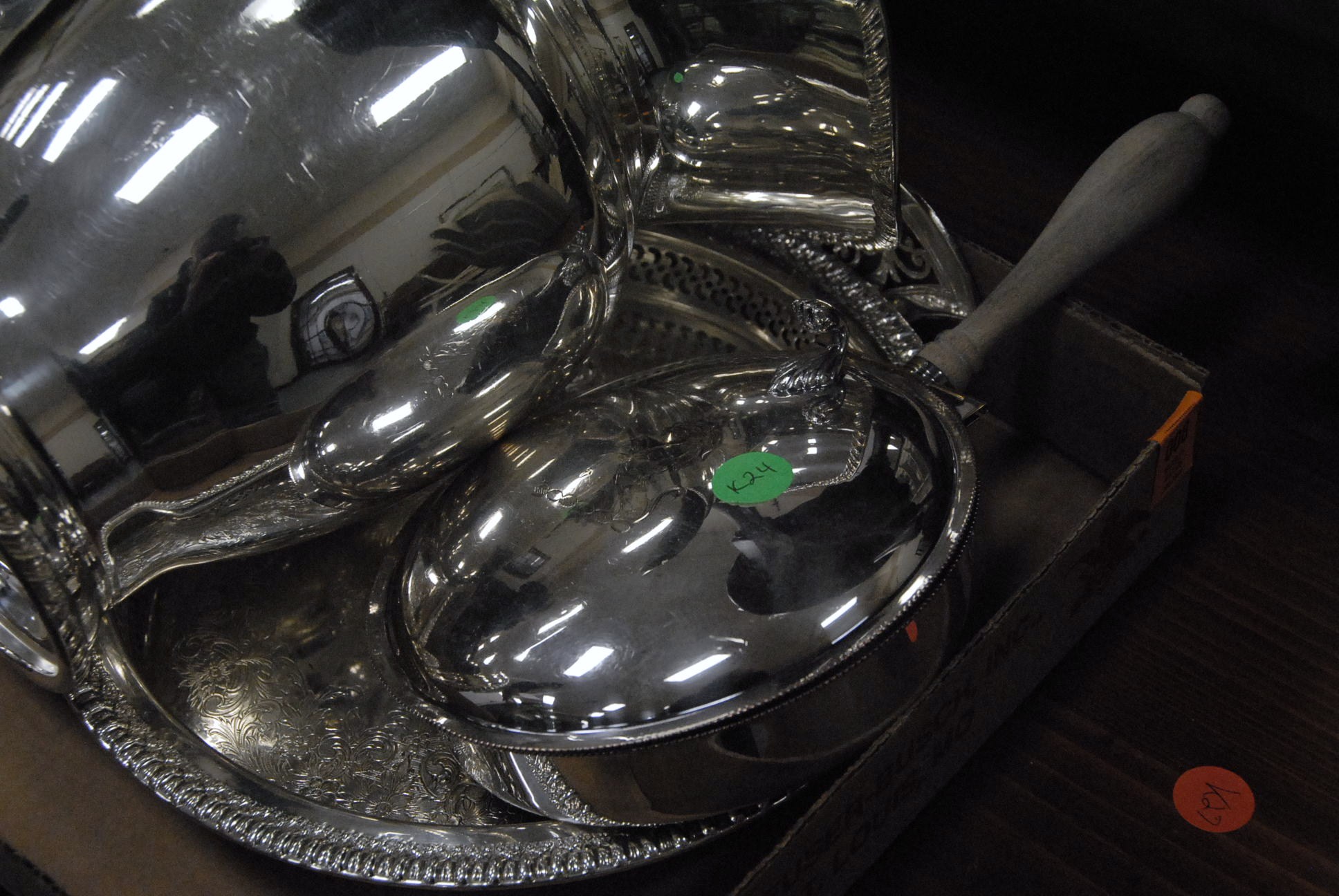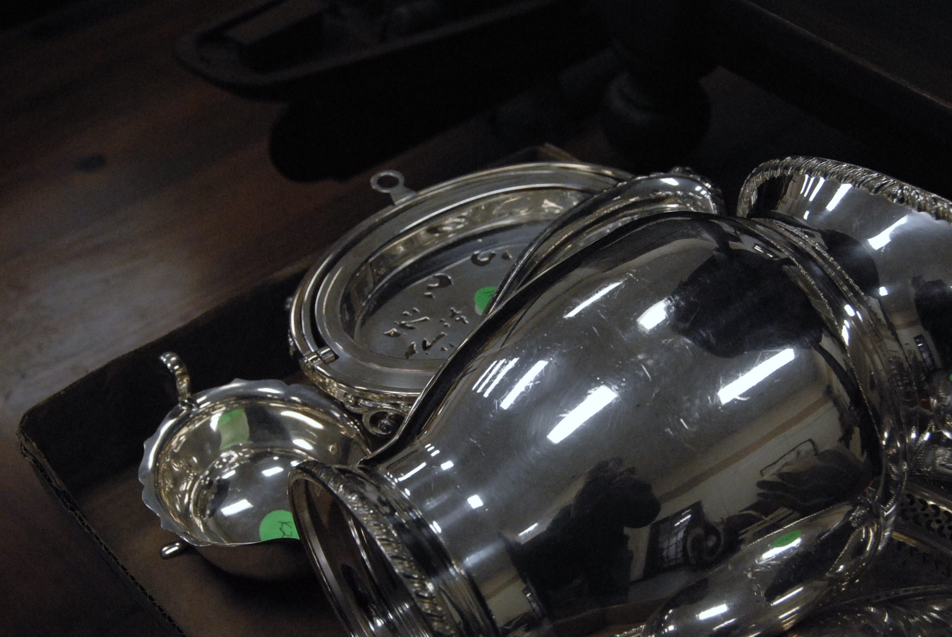 Box lot of silver plate including a pitcher, small revolving tureen, platter, dumb waiter, and a serving piece