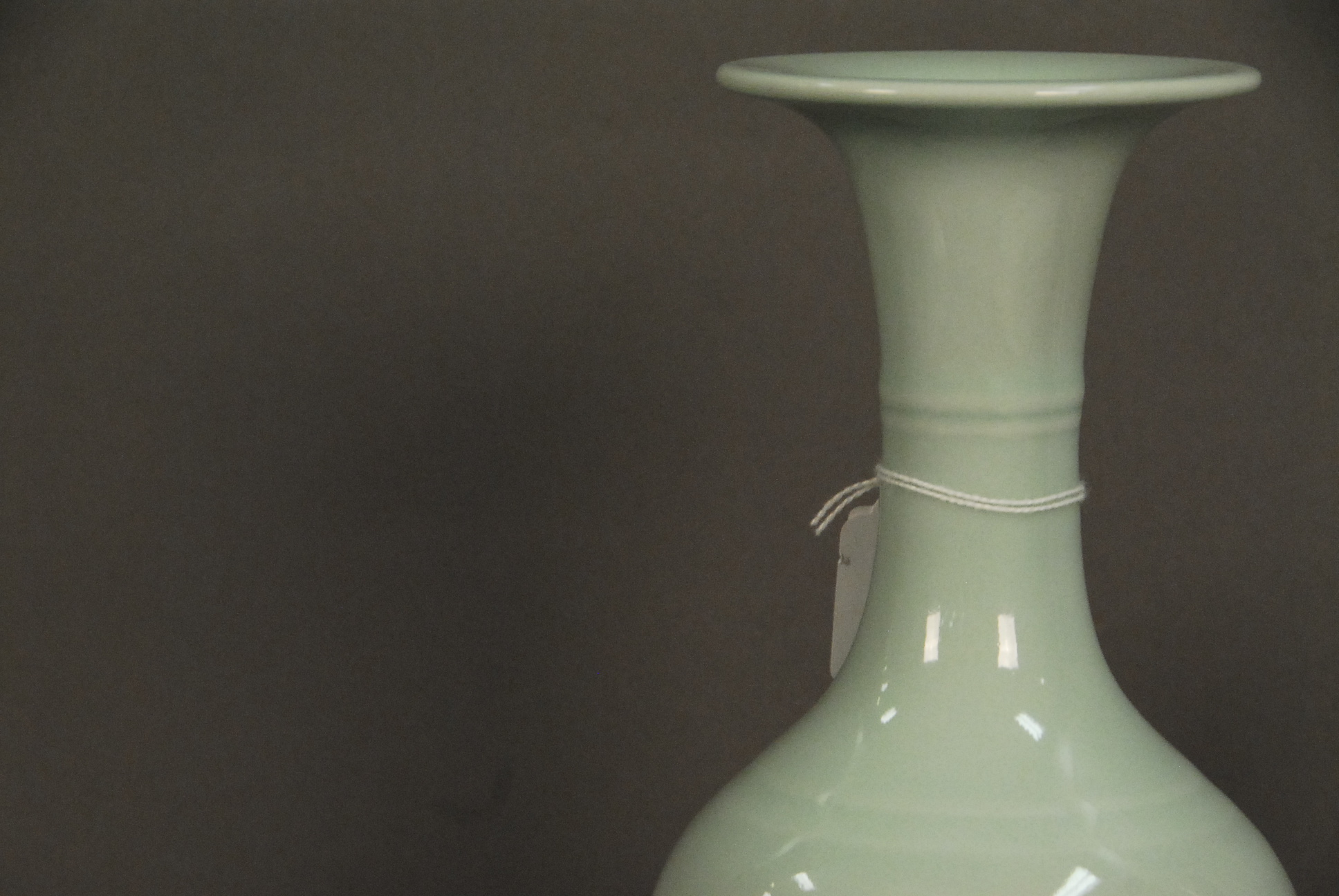 Celadon glazed baluster form vase having flared rim and seal mark on the bottom, ht. 12 1/2 and celadon glazed pear shaped bottle vase, ht. 9 3/4.