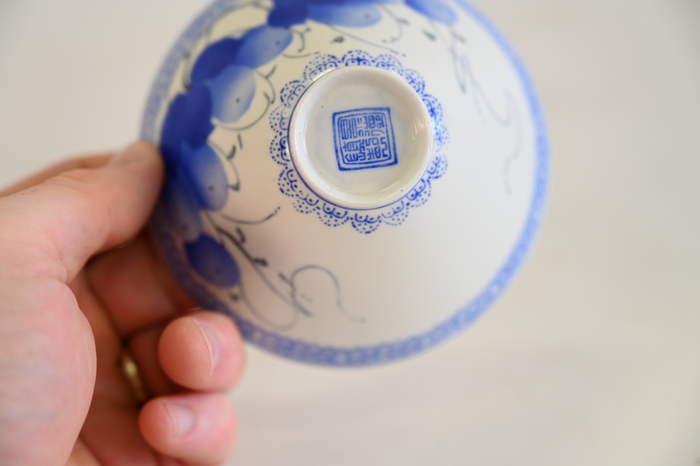 Chinese Egg Shell Porcelain Bowl, with blue fruit motif in fitted box, diameter 4 inches. Provenance: The Estate of Alan Gans, Mulbe…