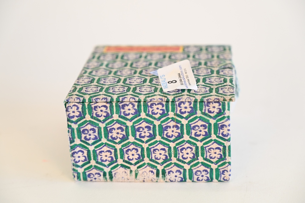 Lot 8: Chinese Egg Shell Porcelain Bowl, with blue fruit motif in fitted box, diameter 4 inches. Provenance: The Estate of Alan Gans, Mulberry Point, Guilford.