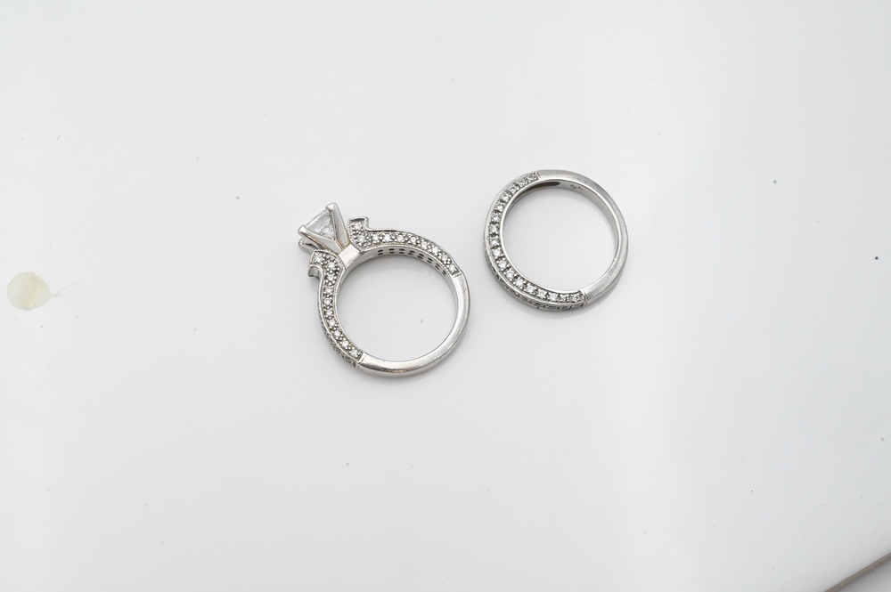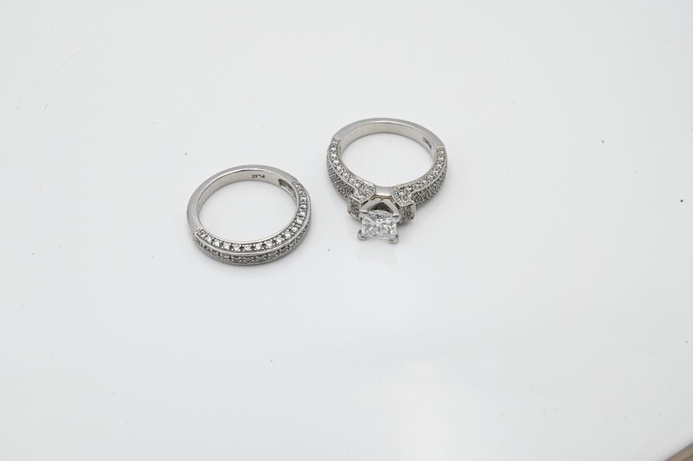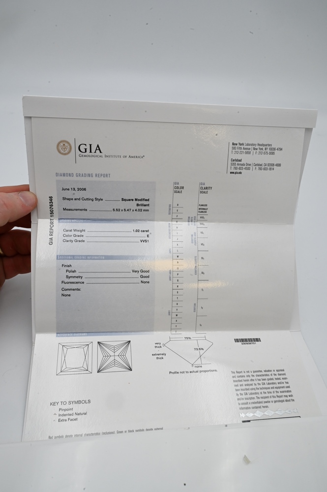 Diamond Engagement Ring, 1.02 carat with matching diamond band, GIA report, square modified brilliant, 5.52 x 5.47 x 4.02 millimeters, E color, VVS1, set in platinum setting, appraised for $13,100, size 5.