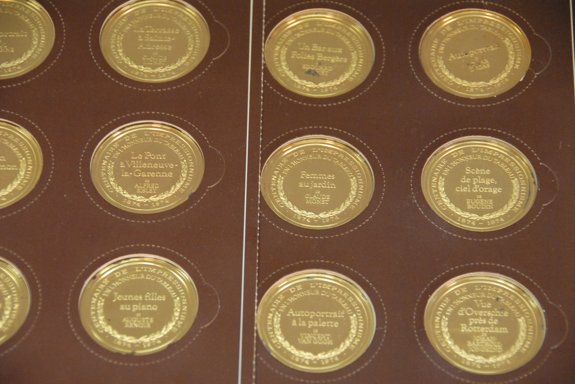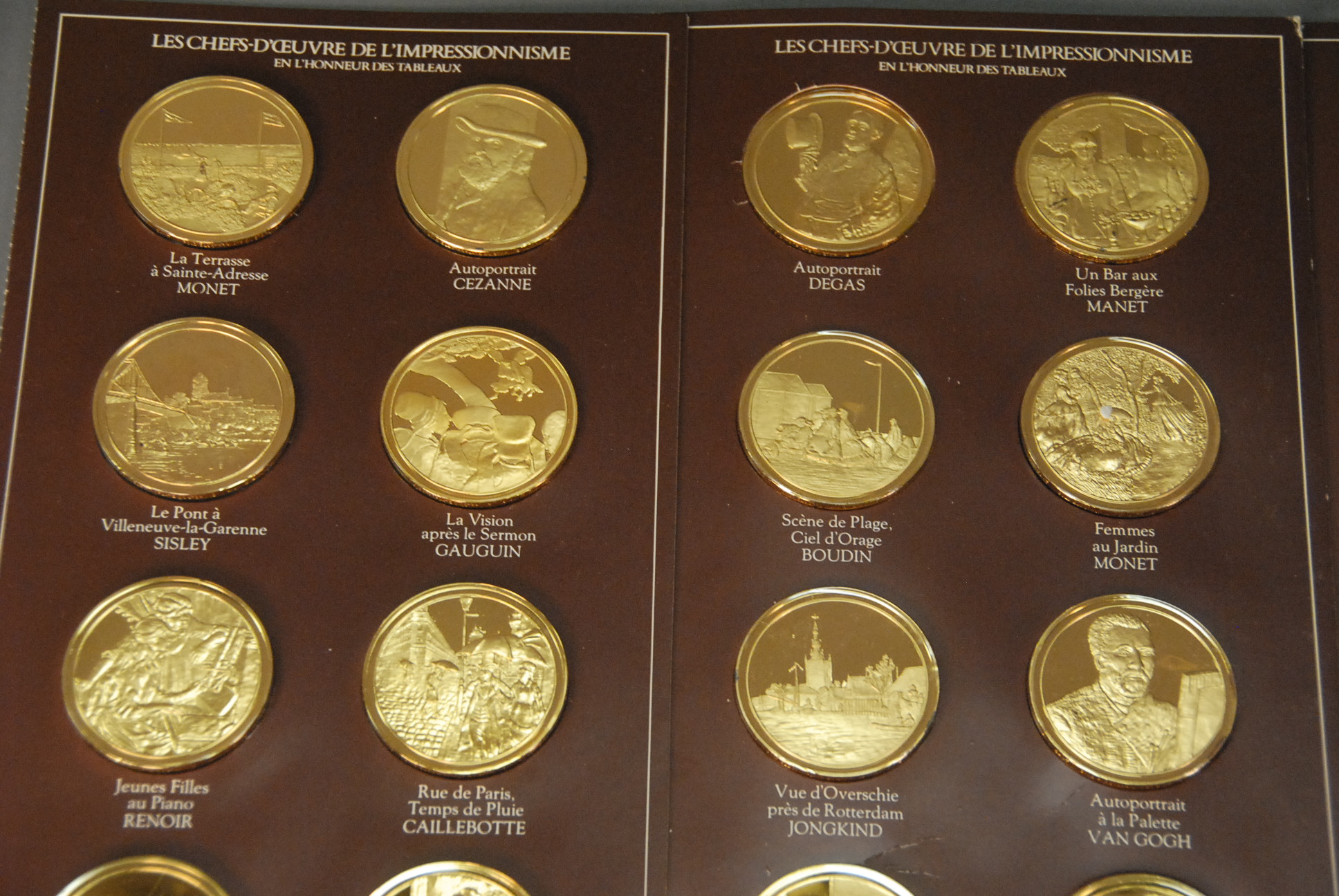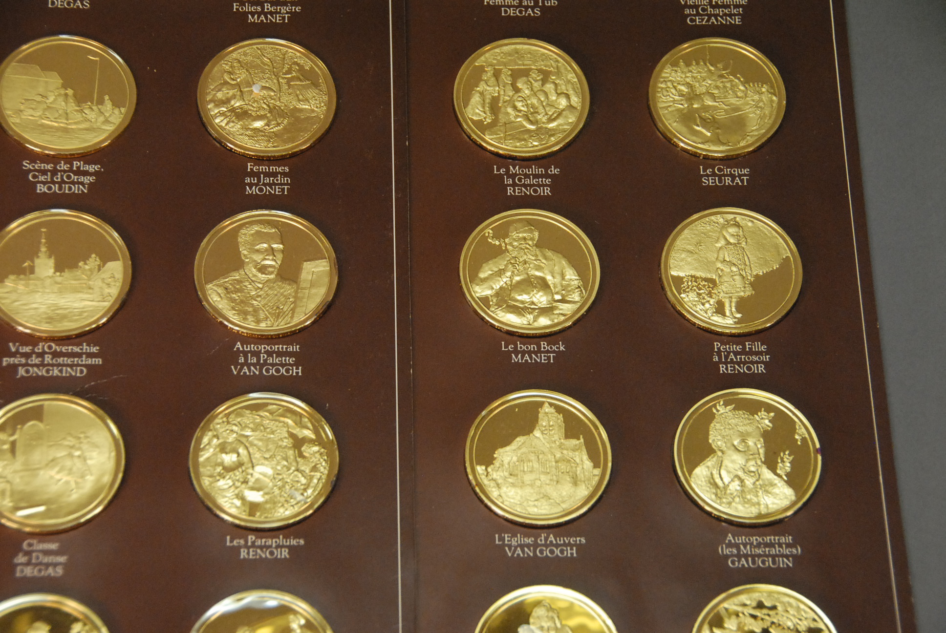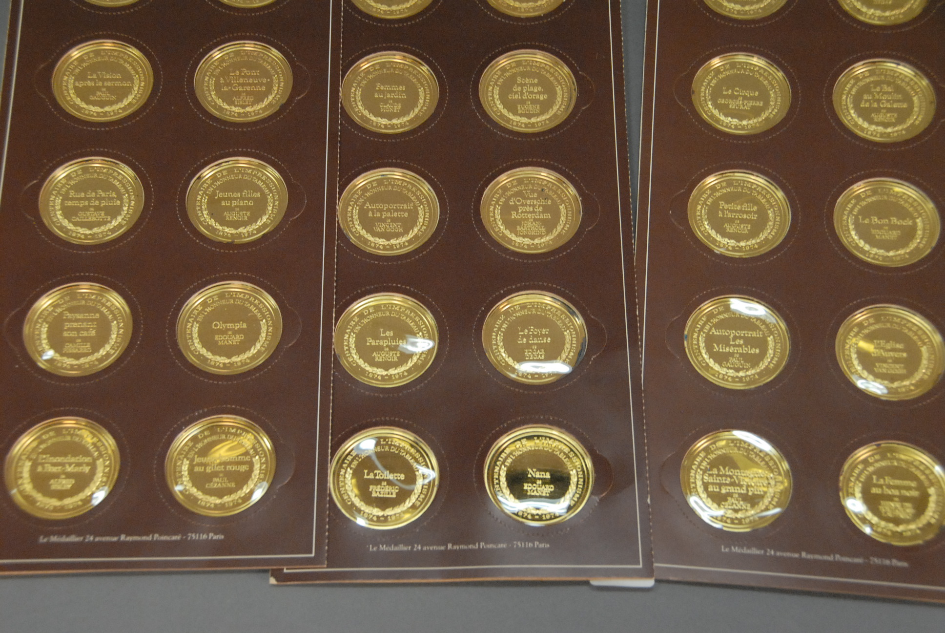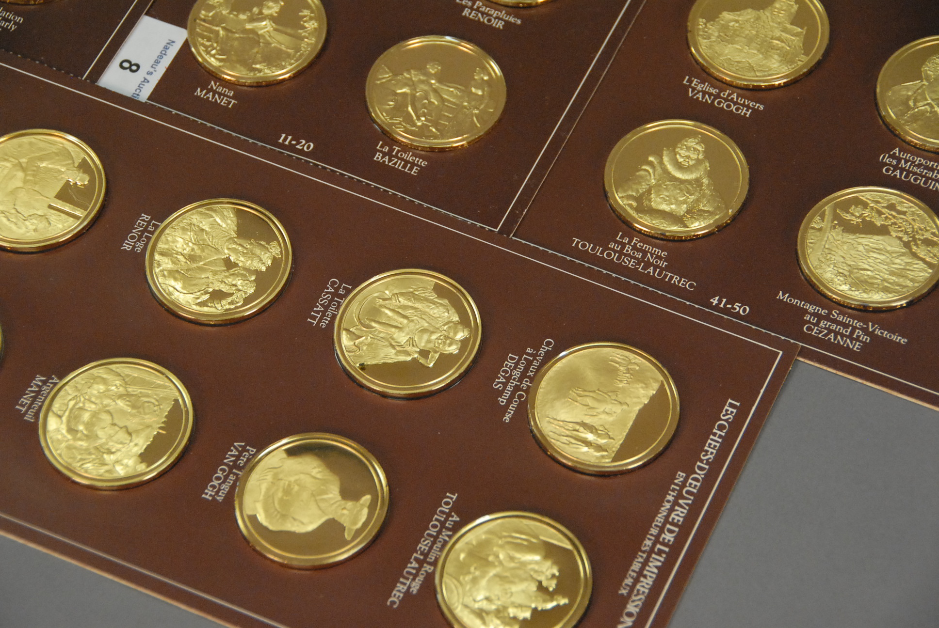Forty sterling silver medals, electro plated in 24K gold in original shipping box, 1.03 t oz. each, approximately 41 t oz. total.