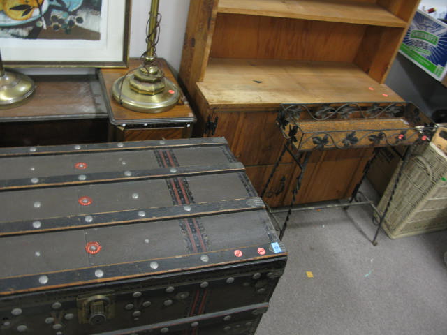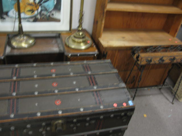 Group lot to include a large trunk, vanity, three floor lamps, print, plant stand and pine bookcase