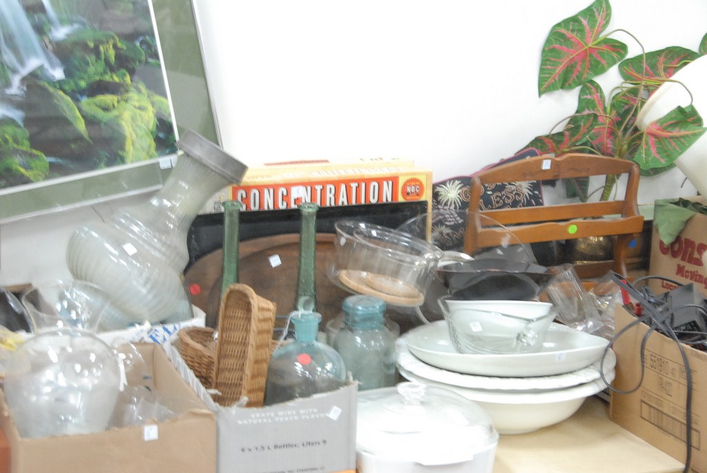 Large grouping on top of and beneath a table kitchenware, glassware, china, encyclopedias, blankets, towels, printer, typerwriters, small televisions.