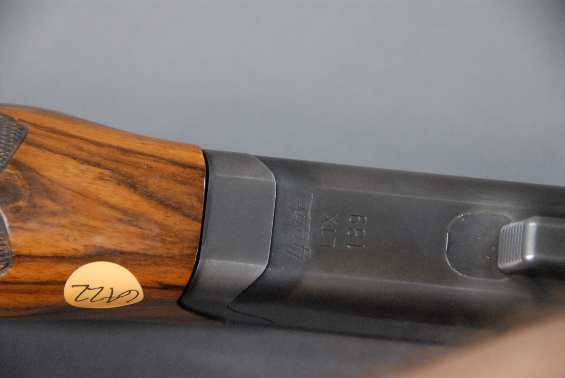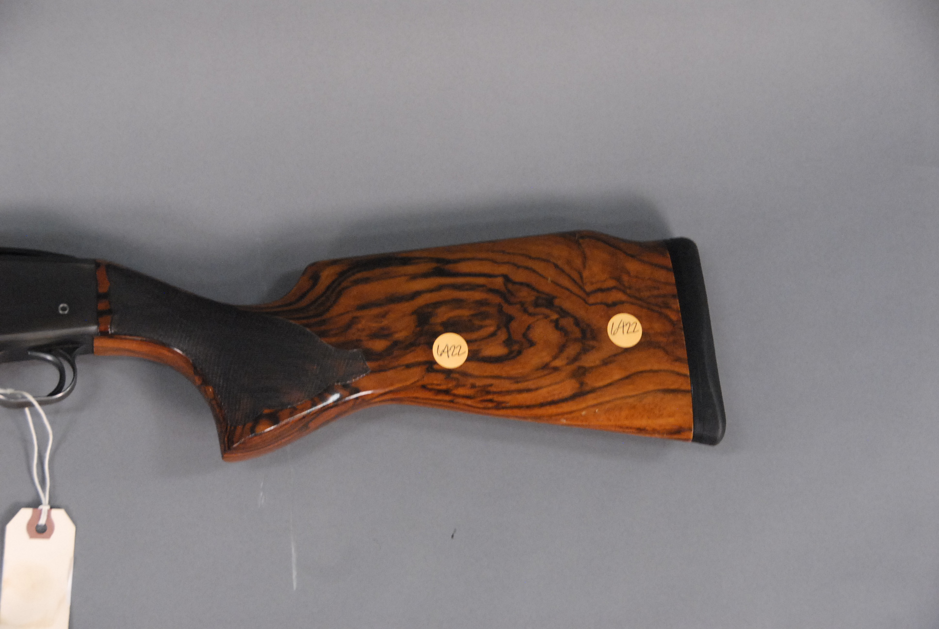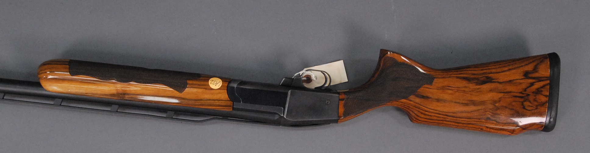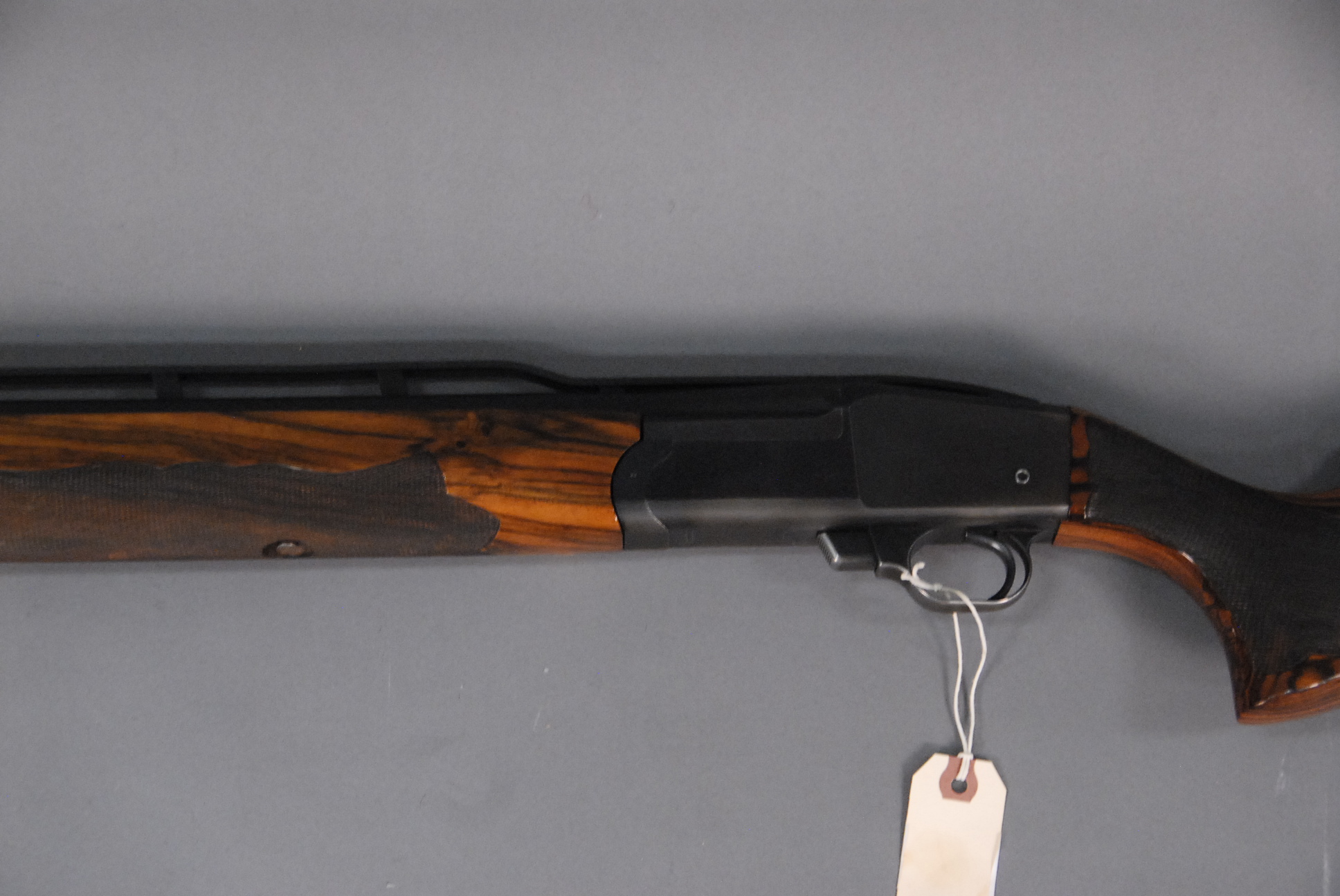 Lot 8: Ljutic Dynatrap shotgun, 12 ga. single barrel, exceptionally checkered burl walnut stock, barrel lg. 32 1/2, sn 189 356.