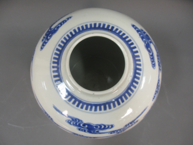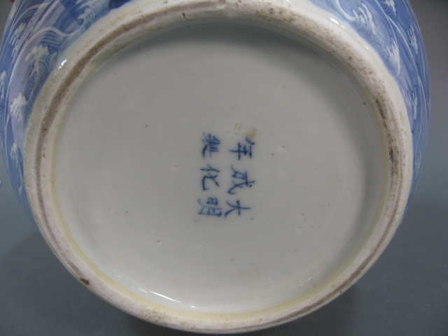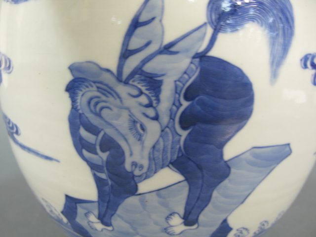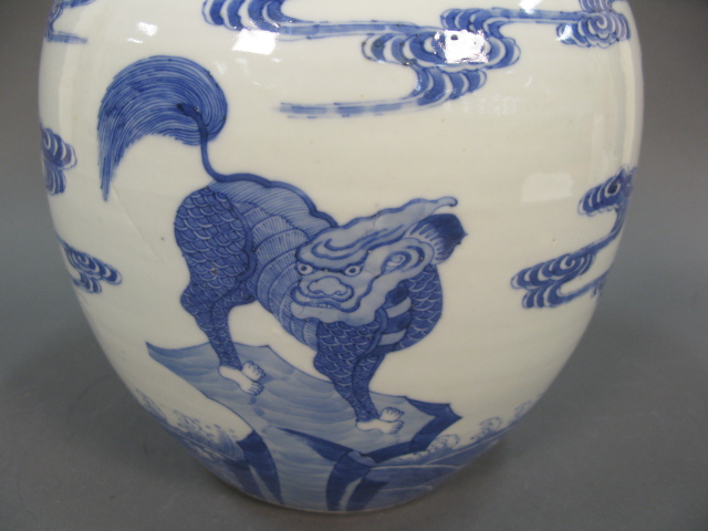 Oriental porcelain blue and white ginger jar having three animal figures perched on rocks missing cover.