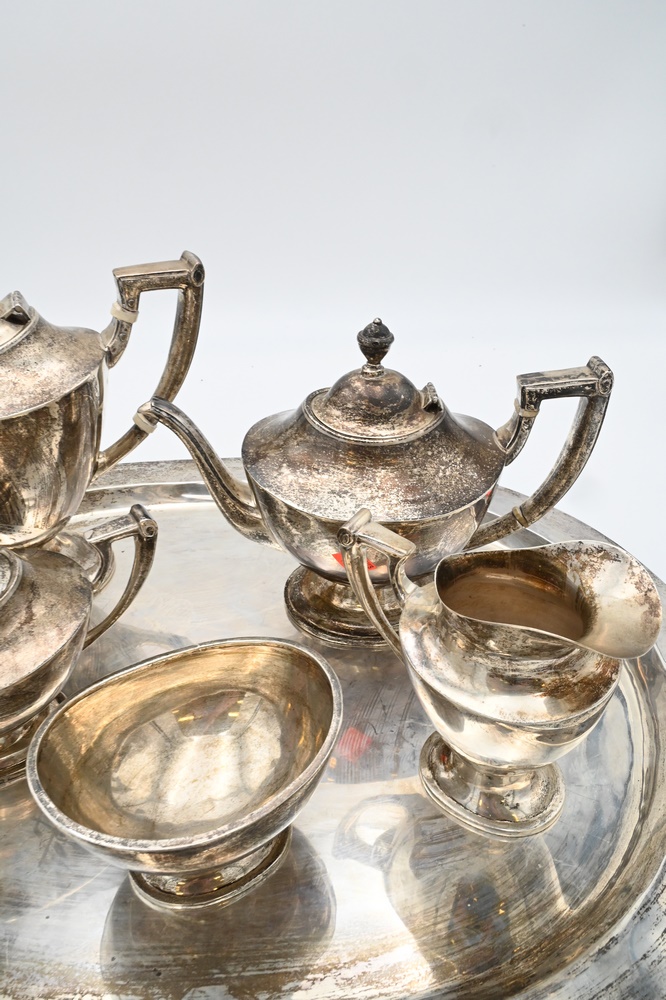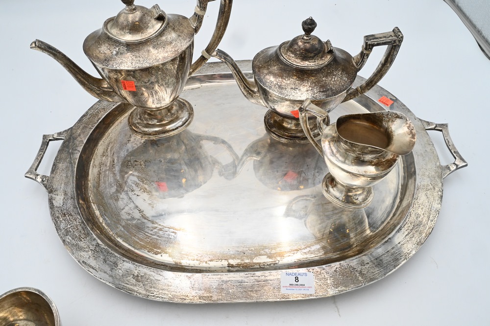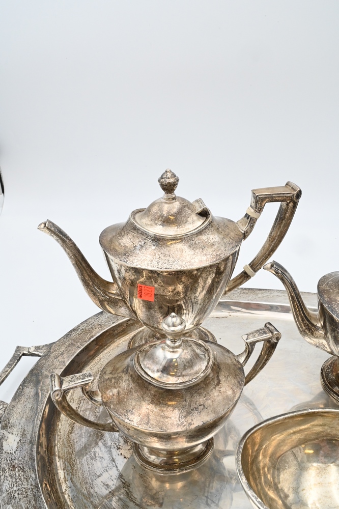 Lot 8: Six Piece Peggy Page Sterling Silver Tea Set, to include a large two-handled tray, teapot, coffee pot, covered sugar, open sugar and creamer, marked Peggy Page Mexico sterling 925, teapot height 9 inches, open sugar height 3 inches, tray 24 x 17 1/4 inches, 175.2 t.oz.