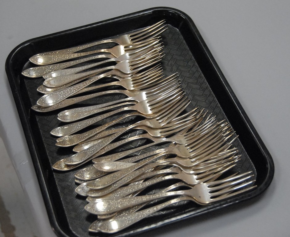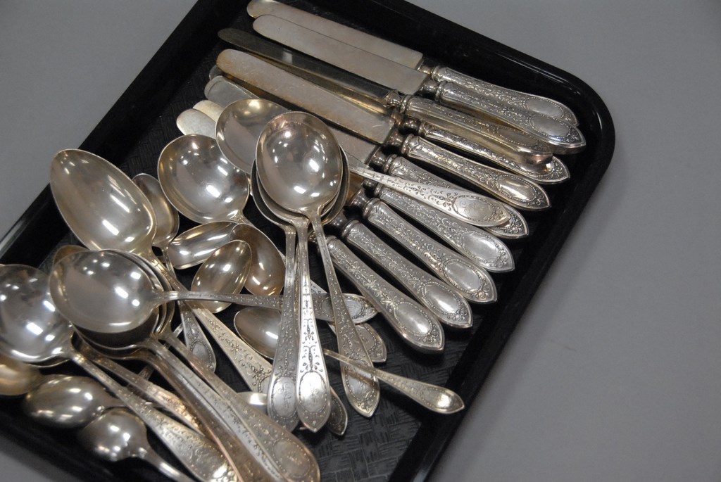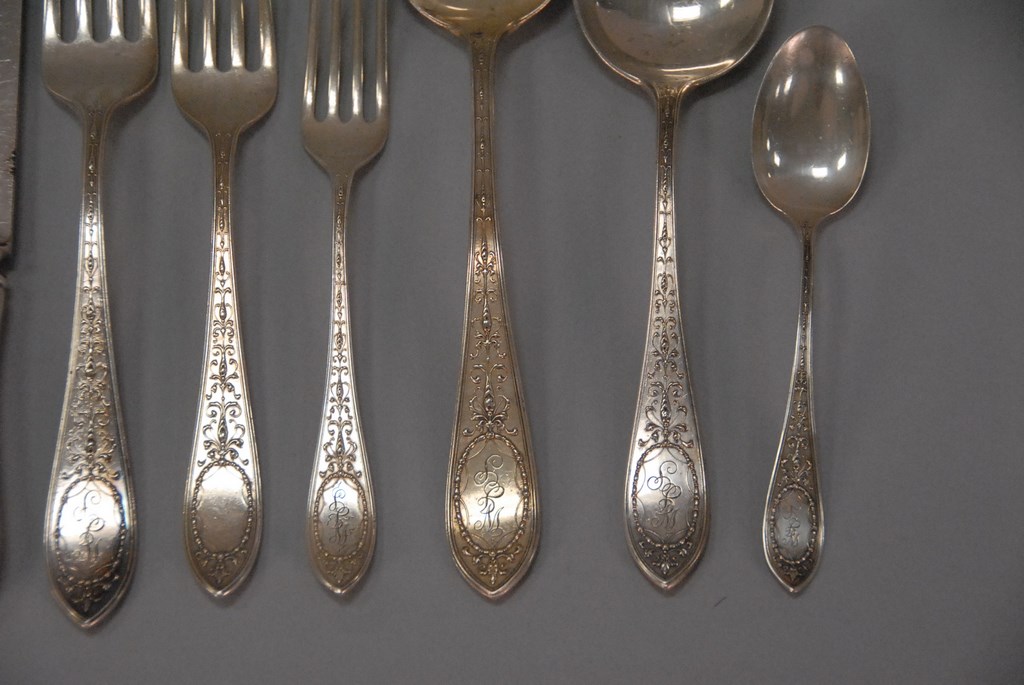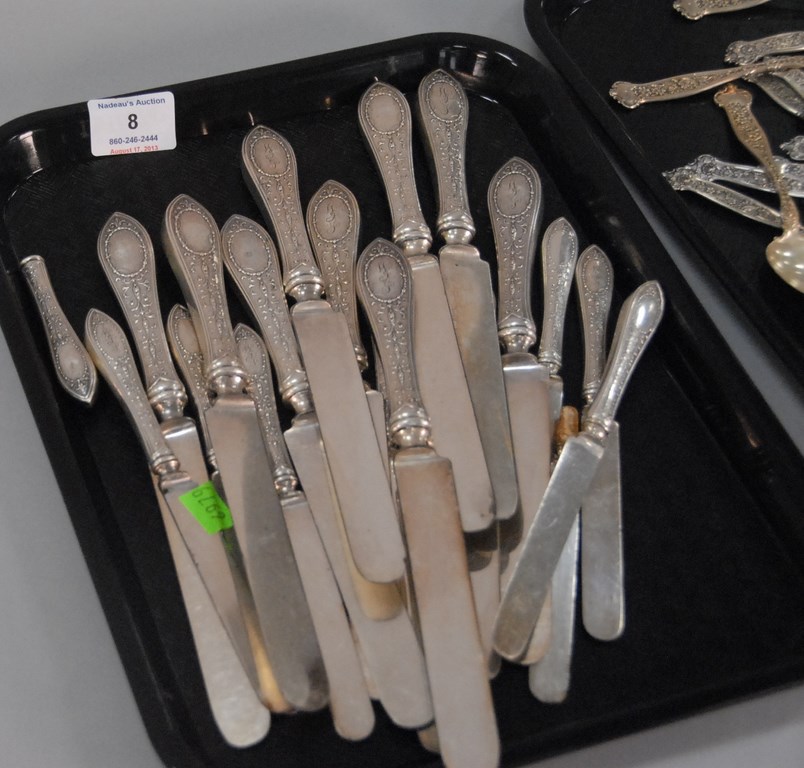 Lot 8: Sterling silver flatware set, 96 pieces total, 87.9 t oz. plus 33 knife handles, approximate 12 t oz. of handles.